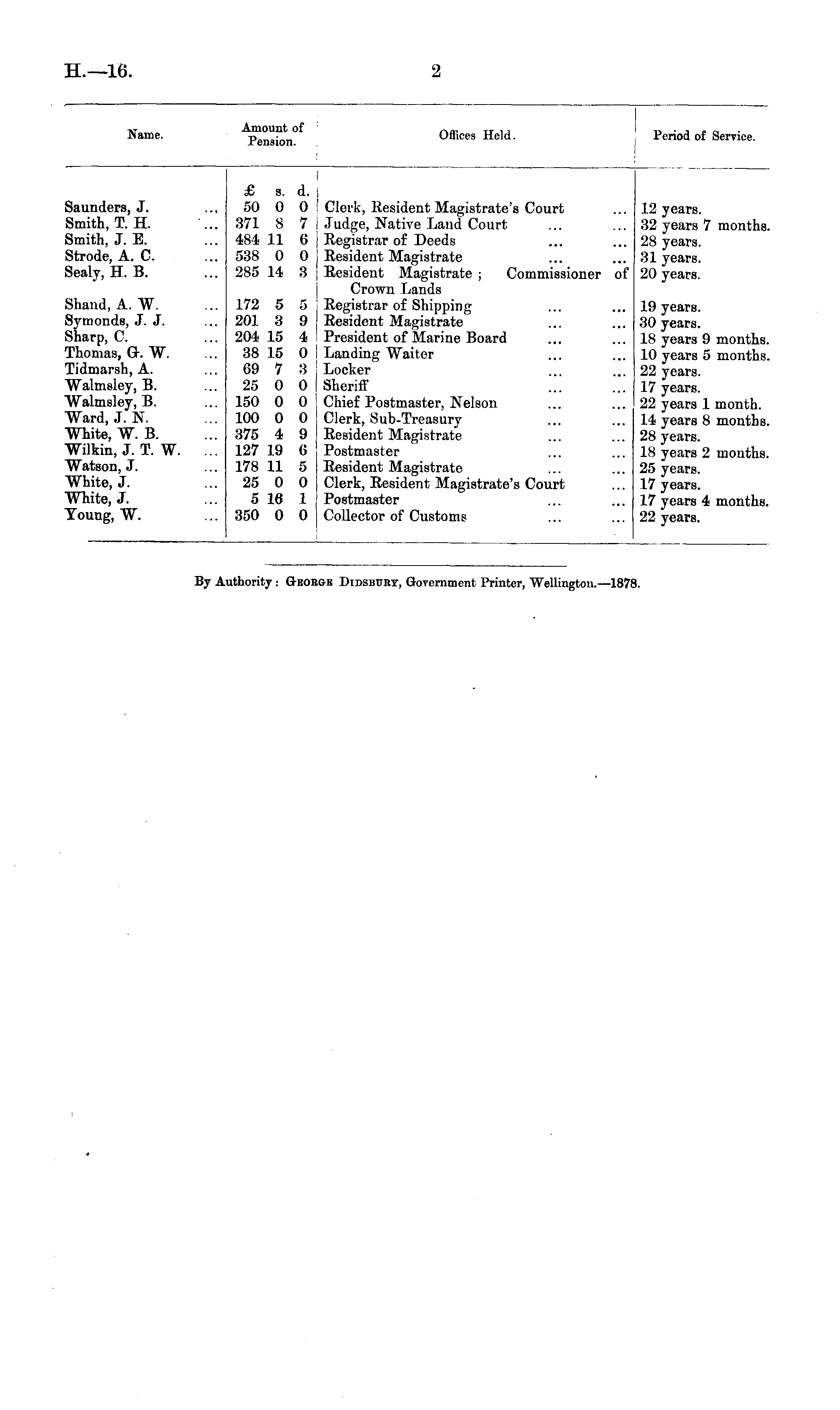 Name. Amount of Pension. Offices Held. Period of Service. Saunders, J. Smith, T. H. Smith, J. E. Strode, A. C. Sealy, H. B. £ s. d. 50 0 0 371 8 7 484 11 6 538 0 0 285 14 3 Clerk, Resident Magistrate's Court Judge, Native Land Court Registrar of Deeds Resident Magistrate Resident Magistrate ; Commissioner of Crown Lands Registrar of Shipping Resident Magistrate President of Marine Board Landing Waiter Locker Sheriff Chief Postmaster, Nelson Clerk, Sub-Treasury Resident Magistrate Postmaster Resident Magistrate Clerk, Resident Magistrate's Court Postmaster Collector of Customs 12 years. 32 years 7 months. 28 years. 31 years. 20 years. Shand, A. W. S3 rmonds, J. J. Sharp, C. Thomas, G. W. Tidmarsh, A. Walmsley, B. Walmsley, B. Ward, J. N. White, W. B. Wilkin, J. T. W. Watson, J. White, J. White, J. Young, W. 172 5 5 201 3 9 204 15 4 38 15 0 69 7 3 25 0 0 150 0 0 100 0 0 375 4 9 127 19 6 178 11 5 25 0 0 5 16 1 350 0 0 19 years. 30 years. IS years 9 months. 10 years 5 months. 22 years. 17 years. 22 years 1 month. 14 years 8 months. 28 years. 18 years 2 months. 25 years. 17 years. 17 years 4 months. 22 years. By Authority : Geobok Didsbprt, Government Printer, Wellington.—1871