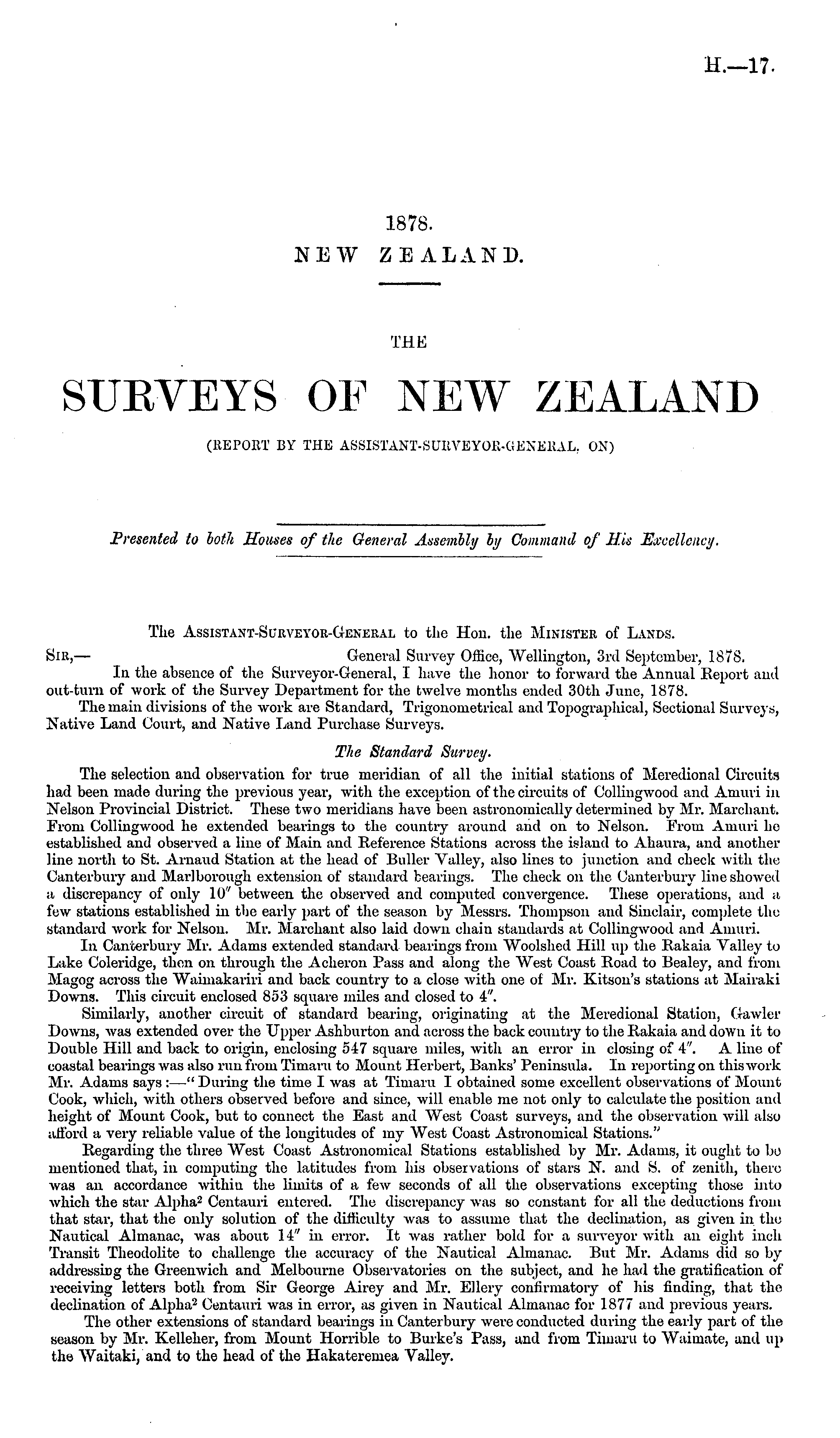 The Assistant-Surveyor-General to the Hon. the Minister of Lands. Sir, — General Survey Office, Wellington, 3rd September, 1878. In the absence of the Surveyor-General, I have the honor to forward the Annual Report and out-turn of work of the Survey Department for the twelve months ended 30th June, 1878. The main divisions of the work are Standard, Trigonometrical and Topographical, Sectional Surveys, Native Land Court, and Native Land Purchase Surveys. The Standard Survey. The selection and observation for true meridian of all the initial stations of Meredional Circuits had been made during the previous year, with the exception of the circuits of Collingwood and Amuri in Nelson Provincial District. These two meridians have been astronomically determined by Mr. Merchant. Erom Collingwood he extended bearings to the country around and on to Nelson. From Amuri ho established and observed a line of Main and Reference Stations across the island to Ahaura, and another line north to St. Arnaud Station at the head of Buller Valley, also lines to junction and check with the Canterbury and Marlborough extension of standard bearings. The check on the Canterbury line showed a discrepancy of only 10" between the observed and computed convergence. These operations, and a few stations established in the early part of the season by Messrs. Thompson and Sinclair, complete the standard work for Nelson. Mr. Marchant also laid down chain standards at Collingwood and Amuri. In Canterbury Mr. Adams extended standard bearings from Woolshed Hill up the Rakaia Valley to Lake Coleridge, then on through the Acheron Pass and along the West Coast Road to Bealey, and from Magog across the Waimakariri and back country to a close with one of Mr. Kitson's stations at Mairaki Downs. This circuit enclosed 853 square miles and closed to 4". Similarly, another circuit of standard bearing, originating at the Meredional Station, Gawler Downs, was extended over the Upper Ashburton and across the back country to the Rakaia and down it to Double Hill and back to origin, enclosing 517 square miles, with an error in closing of 4. A line of coastal bearings was also run from Timaru to Mount Herbert, Banks' Peninsula. In reporting on this work Mr. Adams says :—" During the time I was at Timaru I obtained some excellent observations of Mount Cook, whicli, with others observed before and since, will enable me not only to calculate the position and height of Mount Cook, but to connect tho East and West Coast surveys, and the observation will also afford a very reliable value of the longitudes of my West Coast Astronomical Stations." Regarding the three West Coast Astronomical Stations established by Mr. Adams, it ought to bo mentioned that, in computing the latitudes from his observations of stars N. and S. of zenith, there was an accordance within the limits of a few seconds of all the observations excepting those into which the star Alpha 3 Centauri entered. The discrepancy was so constant for all the deductions from that star, that the only solution of the difficulty was to assume that the declination, as given in the Nautical Almanac, was about 14" in error. It was rather bold for a surveyor with an eight inch Transit Theodolite to challenge the accuracy of the Nautical Almanac. But Mr. Adams did so by addressirig the Greenwich and Melbourne Observatories on the subject, and he had the gratification of receiving letters both from Sir George Airey and Mr. Ellery confirmatory of his finding, that the declination of Alpha 2 Centauri was in error, as given in Nautical Almanac for 1877 and jirevious years. The other extensions of standard bearings iv Canterbury were conducted during the early part of the season by Mr. Kelleher, from Mount Horrible to Burkes Pass, and from Tiuiaru to Waiinate, and up the Waitaki, and to the head of the Hakateremea Valley.