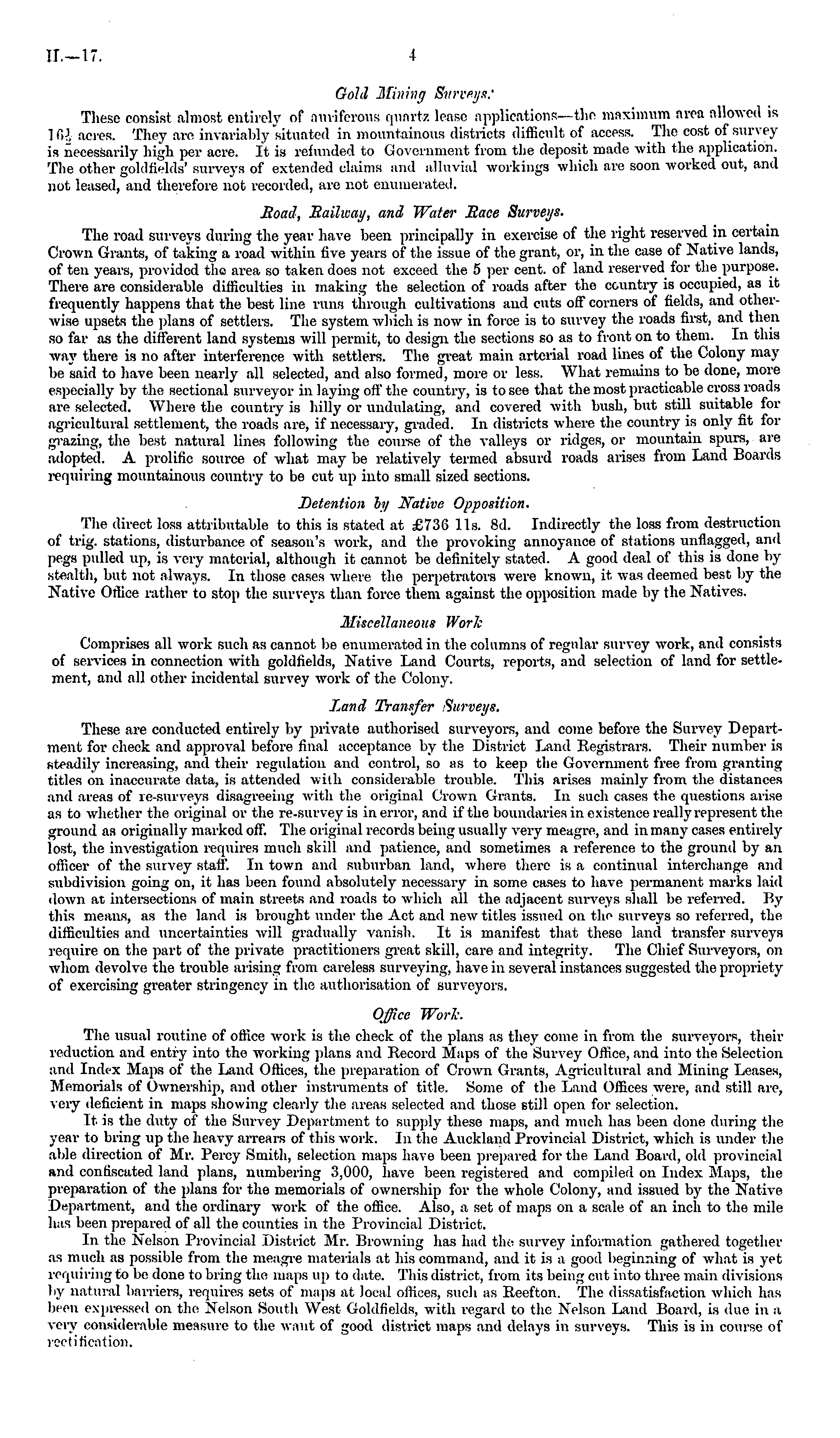Gold Mining Surveys: These consist almost entirely of auriferous quartz lease applications—the maximum area allowed is 16| acres. They are invariably'situated in mountainous districts difficult of access. The cost of survey is necessarily high per acre. It is refunded to Government from the deposit made with the application. The other goldfields' surveys of extended claims and alluvia] workings which are soon worked out, and not leased, aud therefore not recorded, are not enumerated. Road, Railway, and Water Race Surveys. The road surveys during the year have been principally in exercise of the right reserved in certain Crown Grants, of taking a road within five years of the issue of the grant, or, in the case of Native lands, of ten years, provided the area so taken does not exceed the 5 per cent, of land reserved for the purpose. There are considerable difficulties in making the selection of roads after the country is occupied, as it frequently happens that the best line runs through cultivations and cuts off corners of fields, and otherwise upsets the plans of settlers. The system whicli is now in force is to survey the roads first, and then so far as the different land systems will permit, to design the sections so as to front on to them. In this way there is no after interference with settlers. The great main arterial road lines of the Colony may be said to have been nearly all selected, and also formed, more or less. What remains to be done, more especially by the sectional surveyor in laying off the country, is to see that the most practicable cross roads are selected. Where the country is hilly or undulating, and covered with bush, but still suitable for agricultural settlement, the roads are, if necessary, graded. In districts where the country is only fit for grazing, the best natural lines following the course of the valleys or ridges, or mountain spurs, are adopted. A prolific source of what may be relatively termed absurd roads arises from Land Boards requiring mountainous country to be cut up into small sized sections. Detention by Native Opposition. The direct loss attributable to this is stated at £736 lis. Bd. Indirectly the loss from destruction of trig, stations, disturbance of season's work, and the provoking annoyance of stations unflagged, and pegs pulled up, is very material, although it cannot be definitely stated. A good deal of this is done by stealth, but not always. In those cases where the perpetrators were known, it was deemed best by the Native Office rather to stop the surveys than force them against the opposition made by the Natives. Miscellaneous Work Comprises all work such as cannot lie enumerated in the columns of regular survey work, and consists of services in connection with goldlields, Native Land Courts, reports, and selection of land for settlement, and all other incidental survey work of the Colony. Land Transfer Surveys. These are conducted entirely by private authorised surveyors, and come before the Survey Department for check and approval before final acceptance by the District Land Registrars. Their number is Steadily increasing, and their regulation and control, so as to keep the Government free from granting titles on inaccurate data, is attended with considerable trouble. This arises mainly from the distances and areas of re-surveys disagreeing with the original Crown Grants. In such cases the questions arise as to whether the original or the re-survey is in error, and if the boundaries in existence really represent the ground as originally marked off. The original records being usually very meagre, and in many cases entirely lost, the investigation requires much skill and patience, and sometimes a reference to the ground by an officer of the survey staff. In town and suburban land, where there is a continual interchange and subdivision going on, it has been found absolutely necessary in some cases to have permanent marks laid down at intersections of main streets and roads to which all the adjacent surveys shall be referred. By this means, as the land is brought under the Act and new titles issued on the surreys so referred, the difficulties and uncertainties will gradually vanish. It is manifest that these land transfer surveys require on the part of the private practitioners great skill, care and integrity. The Chief Surveyors, on whom devolve the trouble arising from careless surveying, have in several instances suggested the propriety of exercising greater stringency in the authorisation of surveyors. Office Work. The usual routine of office work is the check of the plans as they come in from the surveyors, their reduction and entry into the working plana and Record Maps of the Survey Office, and into the Selection and Index Maps of the Land Offices, the preparation of Crown Grants, Agricultural and Mining Leases, Memorials of Ownership, and other instruments of title. Some of the Land Offices were, and still are, very deficient in maps showing clearly the areas selected and those still open for selection. It is the duty of the Survey Department to supply these maps, and much has been done during the year to bring up the heavy arrears of this work. In the Auckland Provincial District, which is under tho able direction of Mr. Percy Smith, selection maps have been prepared for the Land Board, old provincial and confiscated land plans, numbering 3,000, have been registered and compiled on Index Maps, the preparation of the plans for the memorials of ownership for the whole Colony, and issued by the Native I )epartment, and the ordinary work of the office. Also, a set of maps on a scale of an inch to the mile has been prepared of all the counties in the Provincial District. In the Nelson Provincial District Mr. Browning has had the survey information gathered together as much as possible from the meagre materials at his command, and it is a good beginning of what is yet lei [uiring to be done to bring the maps up to date. This dist