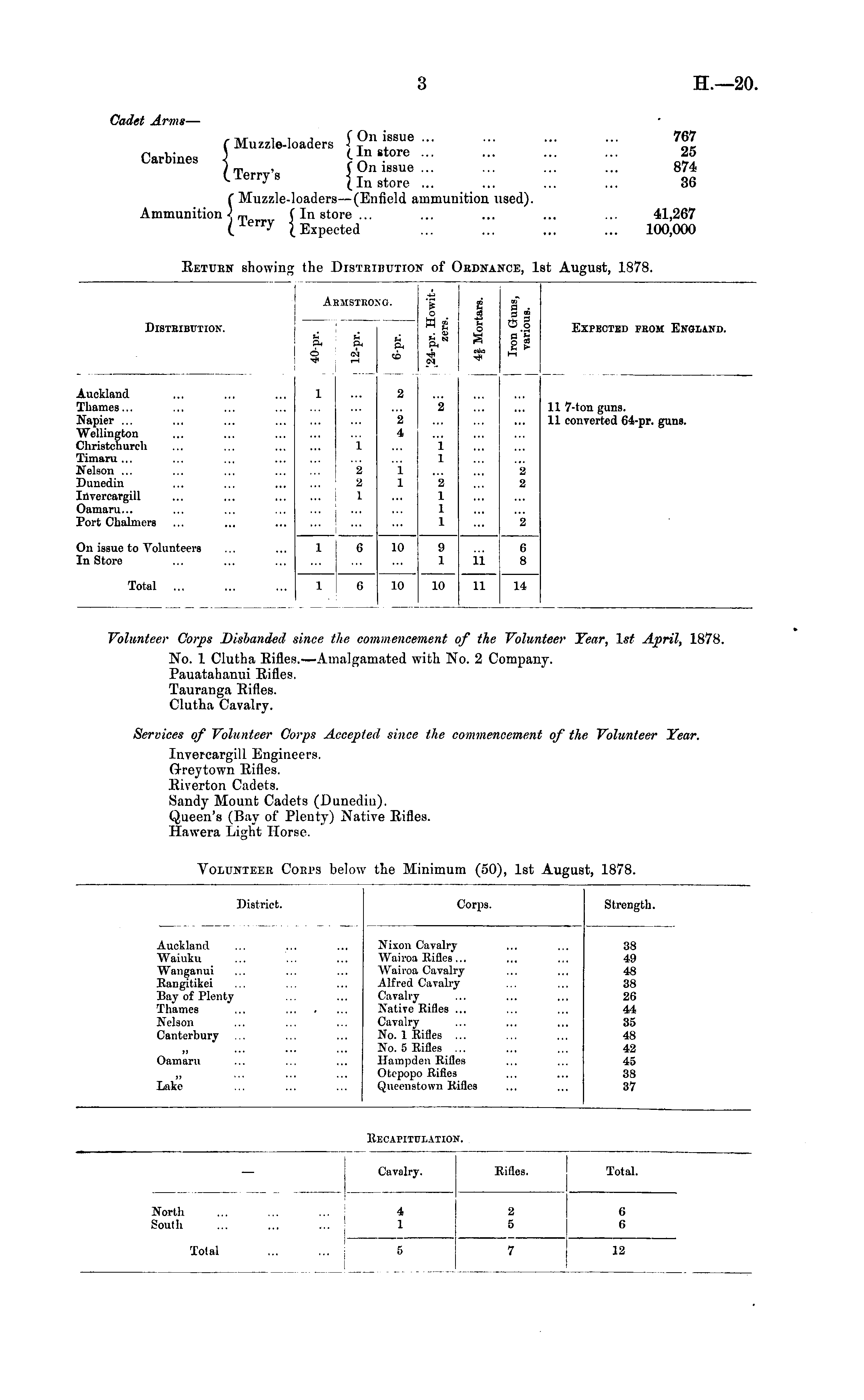 Volunteer Corps Disbanded since the commencement of the Volunteer Year, Ist April, 1878. No. 1 Clutha Rifles.—Amalgamated with No. 2 Company. Pauatahanui Rifles. Tauranga Rifles. Clutha Cavalry. Services of Volunteer Corps Accepted since the commencement of the Volunteer Year. Invercargill Engineers. Greytown Rifles. Riverton Cadets. Sandy Mount Cadets (Dunedin). Queen's (Bay of Plenty) Native Rifles. Hawera Light Horse.