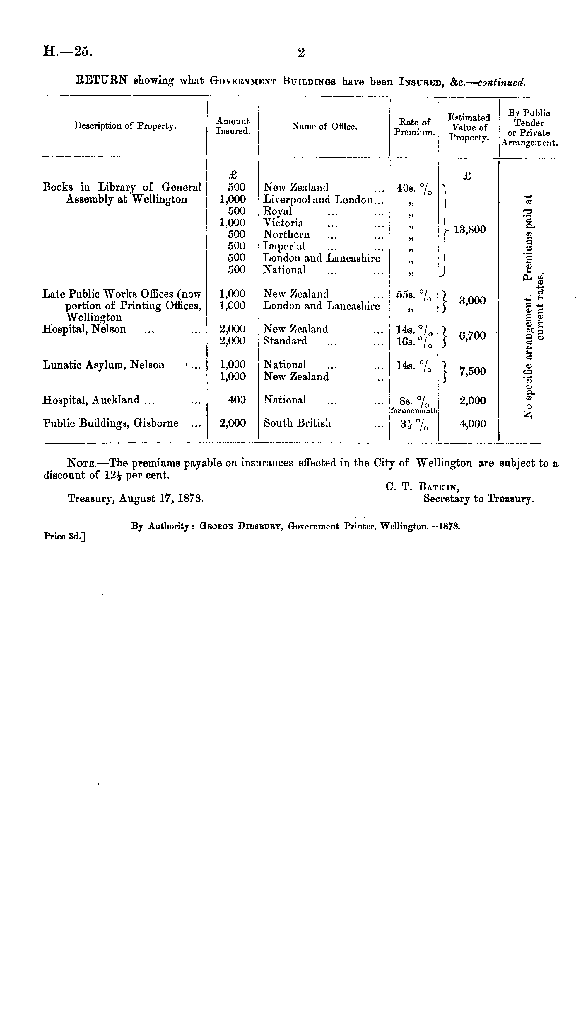 Note. —The premiums payable on insurances effected in the City of Wellington are subject to a discount of 12 rj- per cent. C. T. Batkin, Treasury, August 17, IS7B. Secretary to Treasury. By Authority: George Pidsbury, Government Printer, Wellington.—lB7B. Price 3d.]