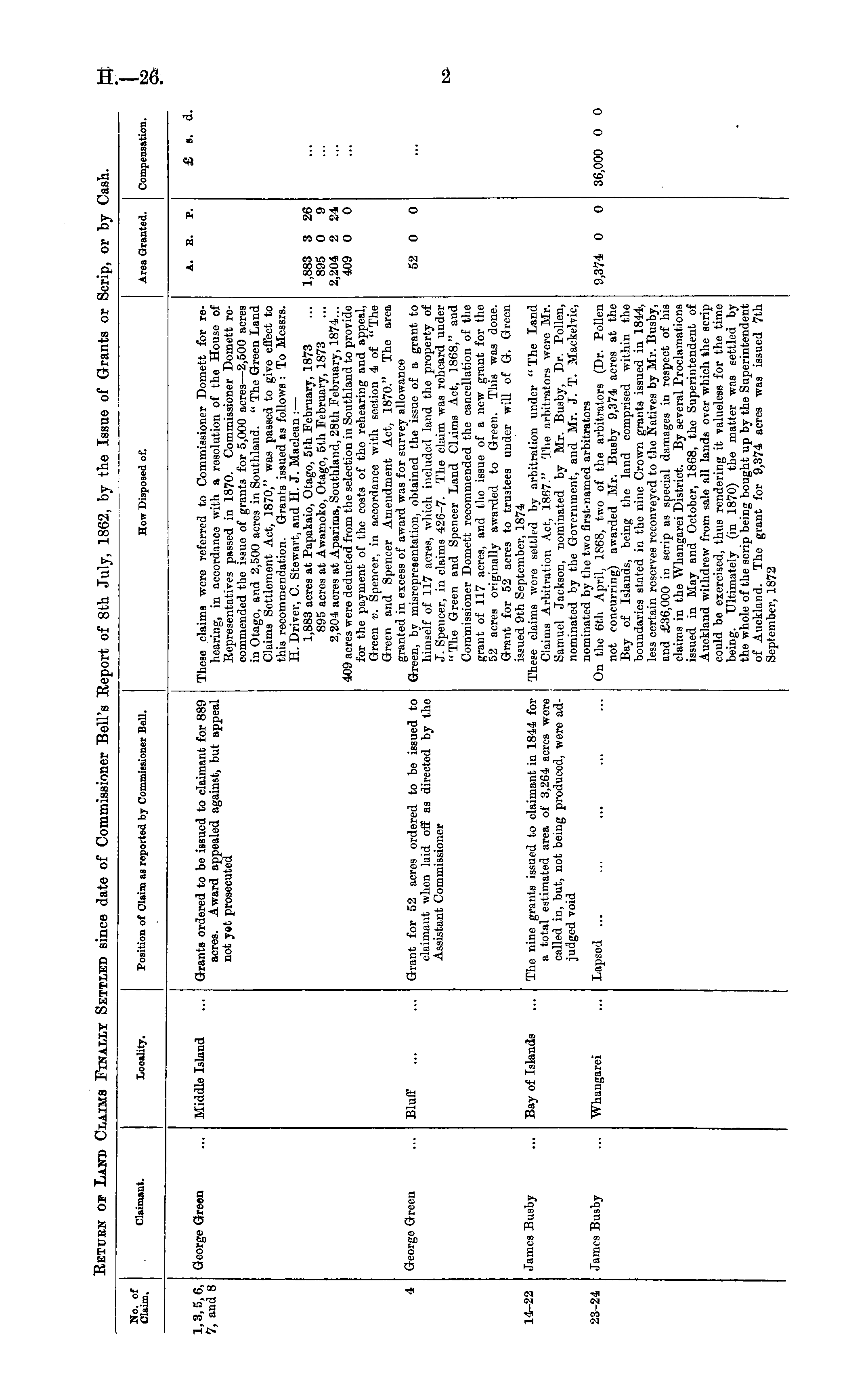 No. of Claim. Claimant. Locality. Position of Claim as reported by Commissioner Bell. How Disposed of. Area Granted. Compensation. A. B. P. £ s. d. 1, 3, 5, 6, 7, and 8 George Green Middle Island Grants ordered to be issued to claimant for 889 acres. Award appealed against, but appeal not yet prosecuted These claims were referred to Commissioner Domett for rehearing, in accordance with a resolution of the House of Representatives passed in 1870. Commissioner Domett recommended the issue of grants for 5,000 acres —2,500 acres in Otago, and 2,500 acres in Southland. " The Green Land Claims Settlement Act, 1870," was passed to give effect to this recommendation. Grants issued as follows : To Messrs. II. Driver, C. Stewart, and H. J. Maclean :— 1,883 acres at Papakaio, Otago, 5th February, 1873 895 acres at Awamoko, Otago, 5th February, 1873 2,204 acres at Aparima, Southland, 28th February, 1874... 409 acres were deducted from the selection in Southland to provide for the payment of the costs of the rehearing and appeal, Green v. Spencer, in accordance with section 4 of " The Green and Spencer Amendment Act, 1870." The area granted in excess of award was for survey allowance Green, by misrepresentation, obtained the issue of a grant to himself of 117 acres, which included land the property of J. Spencer, in claims 420-7- The claim was reheard under "The Green and Spencer Land CUims Act, 1868," and Commissioner Domett recommended the cancellation of the grant of 117 acres, and the issue of a new grant for the 52 acres originally awarded to Green. This was done. Grant for 52 acres to trustees under will of G. Green issued 9th September, 1874 These claims were settled by arbitration under " The Land Claims Arbitration Act, 1867." The arbitrators were Mr. Samuel Jackson, nominated by Mr. Busby, Dr. Pollen, nominated by the Government, and Mr. J. T. Mackelvie, nominated by the two first-named arbitrators On the 6th April, 1868, two of the arbitrators (Dr. Pollen not concurring) awarded Mr. Busby 9,374 acres at the Bay of Islands, being the land comprised within the boundaries stated in the nine Crown grants issued in 1844, less certain reserves rcconveyed to the Natives by Mr. Busby, and £36,000 in scrip as special damages in respect of his claims in the Whangarei District. By several Proclamations issued in May and October, 1868, the Superintendent of Auckland withdrew from sale all lands over which the scrip could bo exercised, thus rendering it valueless for the time being. Ultimately (in 1870) the matter was settled by the whole of the scrip being bought up by the Superintendent of Auckland. The grant for 9,374 acres was issued 7th September, 1872 Grant for 52 acres ordered to be issued to claimant when laid off as directed by the Assistant Commissioner 1,883 3 26 895 0 9 2,204, 2 24 409 0 0 52 0 0 4 George Green Bluff 14-22 James Busby Bay of Islands The nine grants issued to claimant in 1844 for a total estimated area of 3,264 acres were called in, but, not being produced, were adjudged void 23-24 James Busby Whangarei Lapsed ... 9,374 0 0 36,000 0