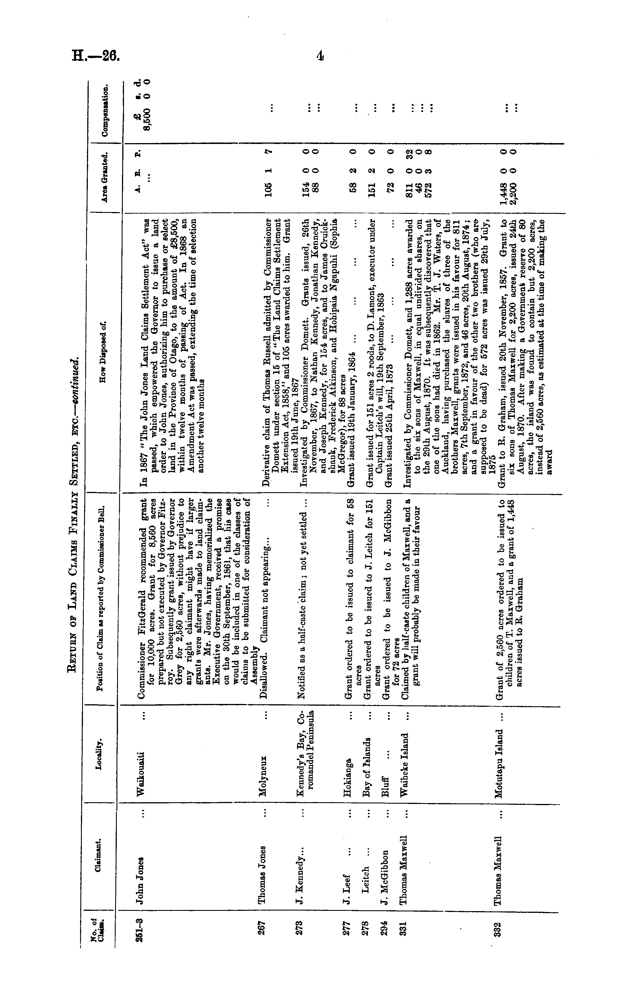 ETT7RN OF iand Claims Finally Settled, etc — continued. No. of Claim. Claimant. Locality. Position of Claim as reported by Commissioner Bell. How Disposed of. Area Granted. Compensation. 251-3 John Jones Waikouaiti Commissioner FitzGerald recommended grant for 10,000 acres. Grant for 8,560 acres prepared but not executed by Governor Fitzroy. Subsequently grant issued by Governor Grey for 2,560 acres, without prejudice to any right claimant might have if larger grants were afterwards made to land claimants. Mr. Jones, having memorialized the Executive Government, received a promise on the 30th September, 1861, that his case would be included in one of the classes of claims to be submitted for consideration of Assembly Disallowed. Claimant not appearing.,, A. B. P. £ ». d. 8,500 0 0 In 1867 " The John Jones Land Claims Settlement Act" was passed, which empowered the Governor to issue a land order to John Jones, authorizing him to purchase or select land in tho Province of Otago, to the amount of £8,500, within twelve months of passing of Act. In 1868 an Amendment Act was passed, extending the time of selection another twelve months 267 273 Thomas Jones J. Kennedy... Molyneux Kennedy's Bay, Coromandel Peninsula Notified as a half-caste claim ; not yet settled ... Derivative claim of Thomas Russell admitted by Commissioner Domett under Bection 15 of "The Land Claims Settlement Extension Act, 1858," and 105 acres awarded to him. Grant issued 19th June, 1867 Investigated by Commissioner Domett. Grants issued, 26th November, 1867, to Nathan Kennedy, Jonathan Kennedy, and Joseph Kennedy, for 154 acres, and to James Cruickshauk, Frederick Atkinson, and Hohipaia Ngapuhi (Sophia McGregor), for 88 acres Grant issued 19th January, 1864 ... 105 1 7 154 0 0 88 0 0 J. Leef Hokianga Grant ordered to be issued to claimant for 58 acres Grant ordered to be issued to J. Leitch for 151 acres Grant ordered to be issued to J. McGibbon for 72 acres Claimed by lialf-caste children of Maxwell, and a grant will probably be made in their favour 58 2 0 277 278 Leitch ... Bay of Islands Grant issued for 151 acres 2 roods, to D. Lamont, executor under Captain Leitch's will, 19th September, 1863 Grant issued 25th April, 1873 151 2 0 294 J. McGibbon Bluff 72 0 0 331 Thomas Maxwell Waiheke Island Investigated by Commissioner Domett, and 1,288 acres awarded to the six sons of Maxwell, in equal undivided shares, on the 29th August, 1870. It was subsequently discovered that one of the sons had died in 1862. Mr. T. J. Waters, of Auckland, having purchased the shares of three of the brothers Maxwell, grants were issued in his favour for 811 acres, 7th September, 1872, and 46 acres, 20th August, 1874; and a grant in favour of the other two brothers (who are supposed to be dead) for 572 acres was issued 29th July, 1875 J Grant to R. Graham, issued 20th November, 1857. Grant to six sons of Thomas Maxwell for 2,200 acres, issued 24th August, 1870. After making a Government reserve of 80 acres, tho island was found to contain but 2,200 acres, instead of 2,560 acres, as estimated at the time of making the award 811 0 32 46 0 0 572 3 8 Thomas Maxwell Motutapu Island ... Grant of 2,560 acres ordered to be issued to children of T. Maxwell, and a grant of 1,448 acres issued to R. Graham 332 1,448 0 2,200 0 0 0