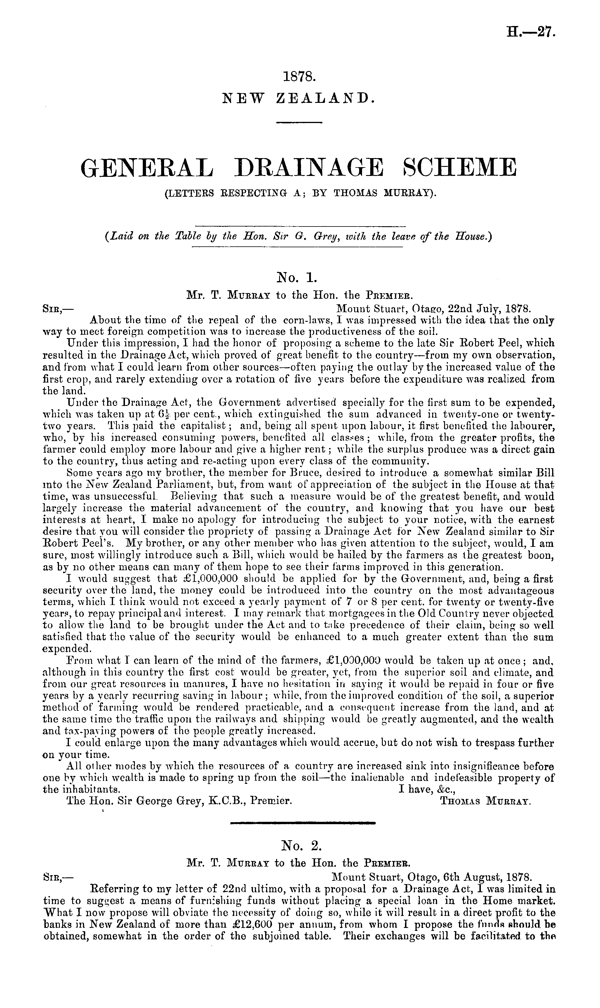 No. 1. Mr. T. Murray to the Hon. the Pekmieb. Sib, — Mount Stuart, Otago, 22nd July, 1878. About the time of the repeal of the corn-laws, I was impressed with the idea that the only way to meet foreign competition was to increase the productiveness of the soil. Under this impression, I had the honor of proposing a scheme to the late Sir Kobert Peel, which resulted in the Drainage Act, which proved of great benefit to the country —from my own observation, and from what I could learn from other sources —often paying the outlay by the increased value of the first crop, and rarely extending over a rotation of five years before the expenditure was realized from the land. Under the Drainage Act, the Government advertised specially for the first sum to be expended, which was taken up at 6J. per cent., which extinguished the sum advanced in twenty-one or twentytwo years. This paid the capitalist; and, being all spent upon labour, it first benefited the labourer, who, by his increased consuming powers, benefited all classes ; while, from the greater profits, the farmer could employ more labour and give a higher rent; while the surplus produce was a direct gain to the country, thus acting and re-acting upon every class of the community. Some years ago my brother, the member for Bruce, desired to introduce a somewhat similar Bill into the New Zealand Parliament, but, from want of appreciation of the subject in the House at that time, was unsuccessful Believing that such a measure would be of the greatest benefit, and would largely increase the material advancement of the country', and knowing that you have our best interests at heart, I make no apology for introducing the subject to your notice, with the earnest desire that you will consider the propriety of passing a Drainage Act for Xew Zealand similar to Sir Robert Peel's. My brother, or any other member who has given attention to the subject, would, lam sure, most willingly introduce such a Bill, which would be hailed by the farmers as the greatest boon, as by no other means can many of them hope to see their farms improved in this generation. I would suggest that £1,000,000 should be applied for by the Government, and, being a first security over the land, the money could be introduced into the country on the most advantageous terms, which I think would not exceed a yearly payment of 7 or 8 per cent, for twenty or twenty-five years, to repay principal ami interest. I may remark that mortgagees in the Old Country never objected to allow the land to be brought under the Act and to take precedence of their claim, being so well satisfied that the value of the security would be enhanced to a much greater extent than the sum expended. From what I can learn of the mind of the farmers, £1,000,000 would be taken up at once; and, although in this country the first cost would be greater, yet, from the superior soil and climate, and from our great resources iv manures, I have no hesitation in saying it would he repaid in four or five years by a yearly recurring saving in labour ; while, from the improved condition of the soil, a superior method of farming would be rendered practicable, and a consequent increase from the land, and at the same time the traffic upon the railways and shipping would be greatly augmented, and the wealth and tax-paying powers of the people greatly increased. I could, enlarge upon the many advantages which would accrue, but do not wish to trespass further on your time. All other modes by which the resources of a country are increased sink into insignificance before one by which wealth is made to spring up from the soil —the inalienable and indefeasible property of the inhabitants. I have, &c, The Hon. Sir George Grey, X.C.8., Premier. Thomas Murray.