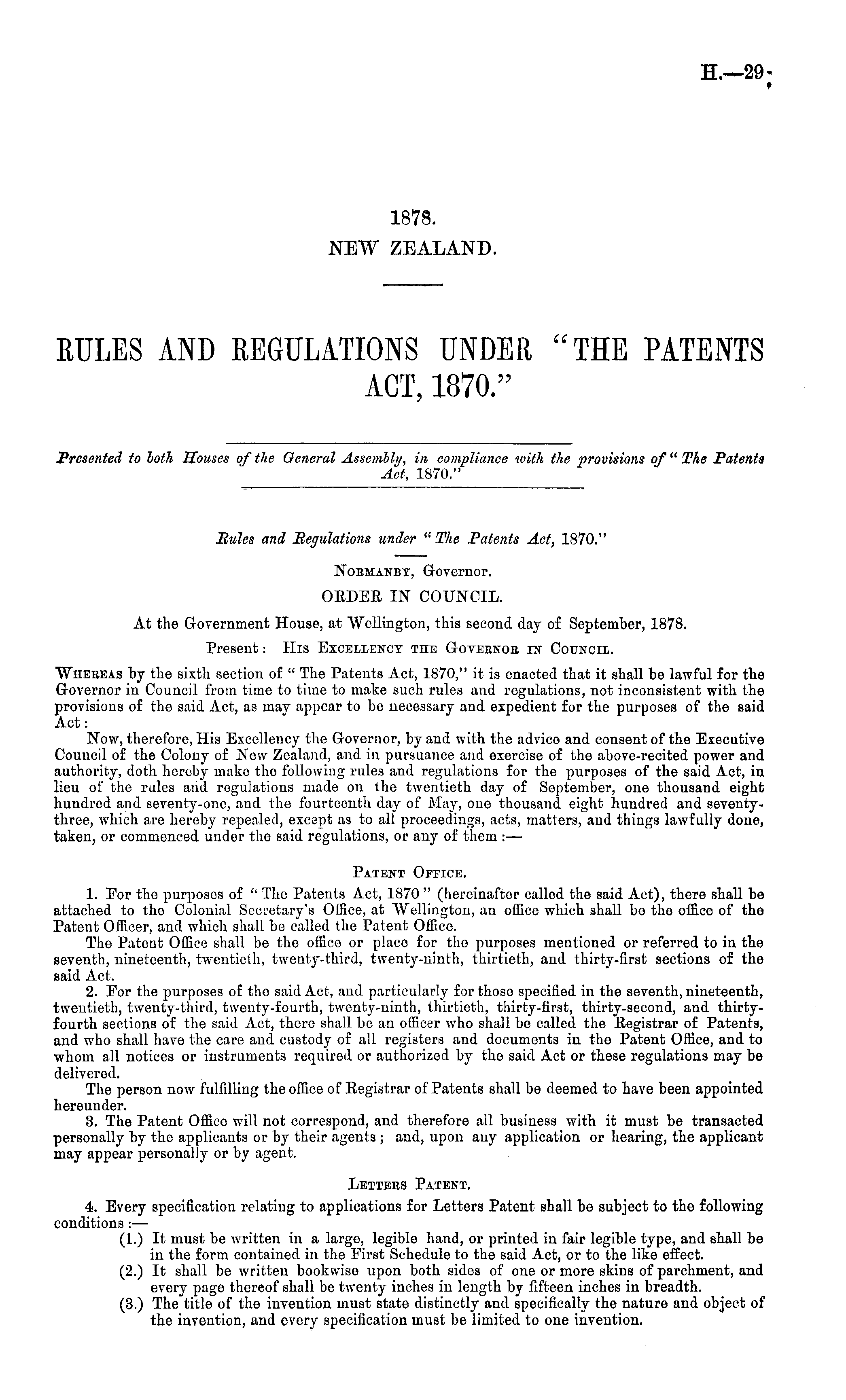 Rules and Regulations under "The Patents Act, 1870." Normanby, Governor. OEDER IN COUNCIL. At the Government House, at Wellington, this second day of September, 1878. Present: His Excellency the Governor in Council. Whereas by the sixth section of " The Patents Act, 1870," it is enacted that it shall be lawful for the Governor in Council from time to time to make such rules and regulations, not inconsistent with the provisions of the said Act, as may appear to be necessary and expedient for the purposes of the said Act: Now, therefore, His Excellency the Governor, by and with the advice and consent of the Executive Council of the Colony of New Zealand, and in pursuance and exercise of the above-recited power and authority, doth hereby make the following rules and regulations for the purposes of the said Act, in lieu of the rules arid regulations made on the twentieth day of September, one thousand eight hundred and seventy-one, and the fourteenth day of May, one thousand eight hundred and seventythree, which are hereby repealed, except as to all proceedings, acts, matters, and things lawfully done, taken, or commenced under the said regulations, or any of them : — Patent Office. 1. For the purposes of " The Patents Act, 1870 " (hereinafter called the said Act), there shall be attached to the Colonial Secretary's Office, at Wellington, an office which shall be the office of the Patent Officer, and which shall be called the Patent Office. The Patent Office shall be the office or place for the purposes mentioned or referred to in the seventh, nineteenth, twentieth, twenty-third, twenty-ninth, thirtieth, and thirty-first sections of the said Act. 2. For the purposes of the said Act, and particularly for those specified in the seventh, nineteenth, twentieth, twenty-third, twenty-fourth, twenty-ninth, thirtieth, thirty-first, thirty-second, and thirtyfourth sections of the said Act, there shall be an officer who shall be called the .Registrar of Patents, and who shall have the care aud custody of all registers and documents iv the Patent Office, and to whom all notices or instruments required or authorized by the said Act or these regulations may be delivered. The person now 7 fulfilling the office of Eegistrar of Patents shall be deemed to have been appointed hereunder. 3. The Patent Office will not correspond, and therefore all business -with it must be transacted personally by the applicants or by their agents ; and, upon any application or hearing, the applicant may appear personally or by agent. Letters Patent. 4. Every specification relating to applications for Letters Patent shall be subject to the following conditions :— (1.) It must be written in a large, legible hand, or printed in fair legible type, and shall be in the form contained in the First Schedule to the said Act, or to the like effect. (2.) It shall be writteu bookwise upon both sides of one or more skins of parchment, and every page thereof shall be twenty inches in length by fifteen inches in breadth. (3.) The title of the inveution must state distinctly and specifically the nature and object of the invention, and every specification must be limited to one invention.