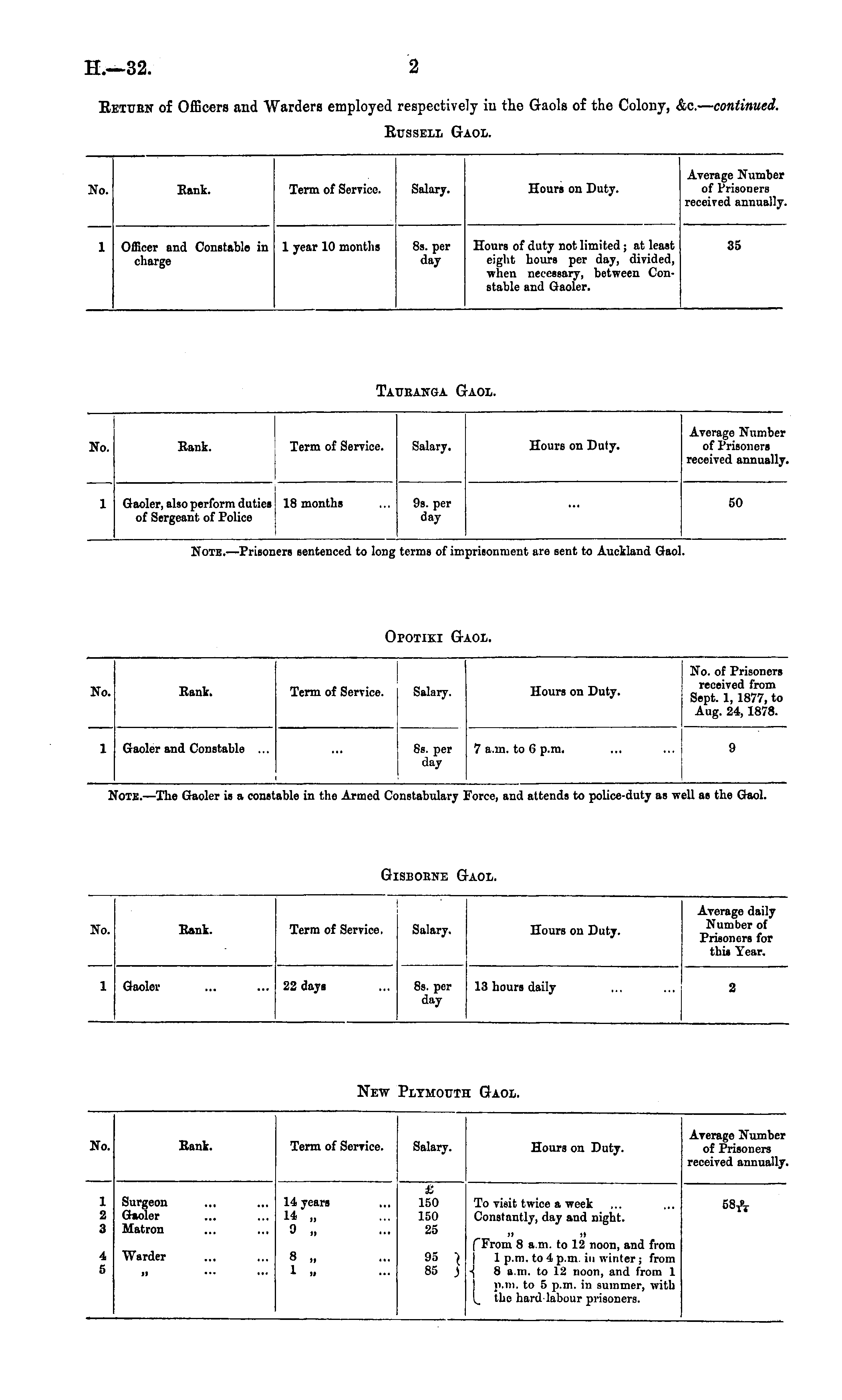Retubn of Officers and "Warders employed respective' ly iu the Gaols of the Colony, &c.— continued. ussell G^ LOL. No. Rank. Term of Service. Salary. Hours on Duty. Average Number of Prisoners received annually. Officer and Constable in charge 1 year 10 months 8s. per day Hours of duty not limited ; at least eight hours per day, divided, when necessary, between Constable and Gaoler. 35 Ta eanga Gaol. No. Bank. Term of Service. Salary. Hours on Duty. Average Number of Prisoners received annually. Gaoler, also perform duties ' 18 months of Sergeant of Police 9s. per day 50 Note. —Prisoners sentenced to long terms of imprisonment are sent to Auckland Gaol. Opotiki Gaol. No. Rank. Term of Service. Salary. Hours on Duty. No. of Prisoners received from Sept. 1, 1877, to Aug. 24, 1878. Gaoler and Constable ... 8s. per day 7 a.m. to 6 p.m. 9 Note. —The Gaoler is a constable in the Armed Constabulary Force, and attends to police-duty as well as the Gaol. Gisboene Gaol. No. Bank. Term of Service. Salary. Hours on Duty. Average daily Number of Prisoners for this Year. Gaoler 22 days 8s. per day 13 hours daily 2 New Pltmout: Gaol. No. Hank. Term of Service. Salary. Hours on Duty. Average Number of Prisoners received annually. 1 2 3 Surgeon Gaoier Matron 14 years 14 „ 0 ., 150 150 25 To visit twice a week Constantly, day and night. 6S& 4 5 Warder »» 8 „ 1 „ 95 85 > J C From 8 a.m. to 12 noon, and from 1 p.m. to 4 p.in in winter ; from ■{ 8 a.m. to 12 noon, and from 1 p.m. to 5 p.m. in summer, with [_ the hard labour prisoners.