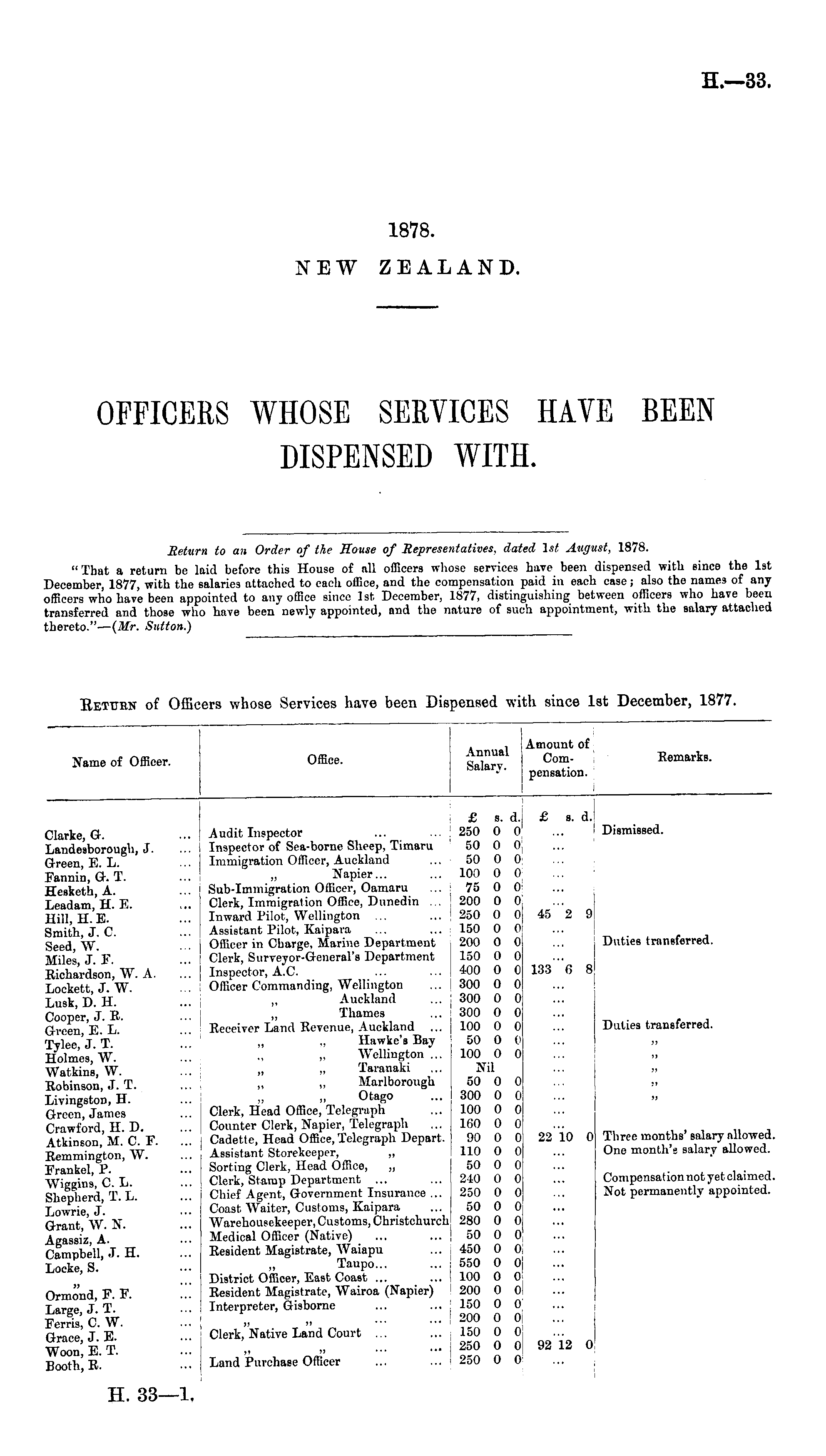 Return to an Order of the Bouse of Representatives, dated Ist August, 1878. "That a return be laid before this House of all officers whose services have been dispensed witb since the Ist December, 1877, with the salaries attached to each office, and the compensation paid in each ease; also the names of any officers who have been appointed to any office since Ist December, 1877, distinguishing between officers who bave been transferred and those who bave been newly appointed, and tbe nature of such appointment, with tbe salary attached thereto."— (Mr. Sutton.)