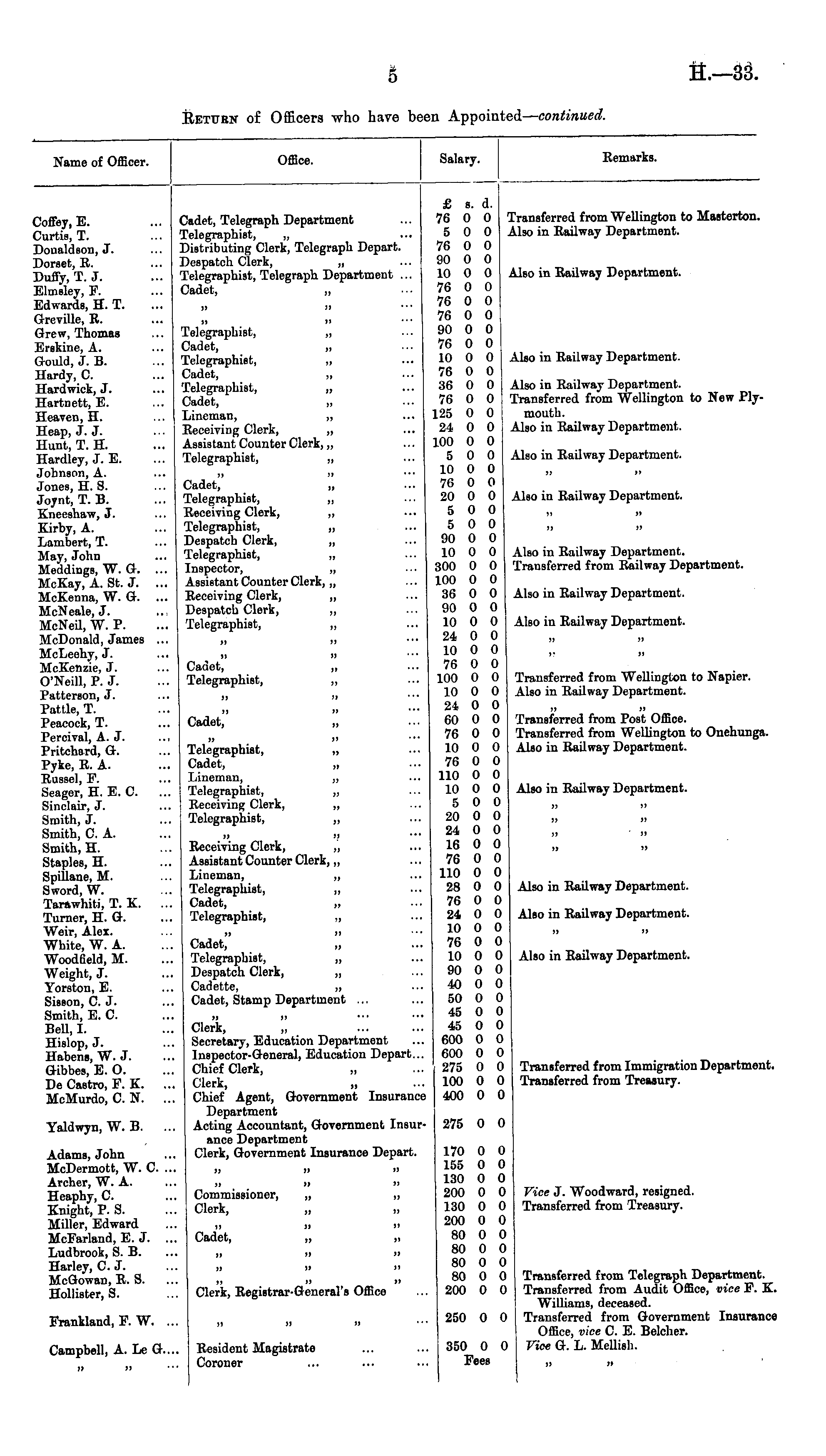 Return of Officers who have been Appointed — continued. Name of Officer. Office. Salary. Remarks. Coffey, E. ... I Curtis, T. ... ' Donaldson, J. Dorset, R. ... . Duffy, T. J. ... ' Elmsley, F. Edwards, H. T. Greville, R. Grew, Thomas Erskine, A. Gould, J. B. Hardy, C. Hardwick, J. Hartnett, E. Heaven, H. Heap, J. J. Hunt, T. H. Hardley, J. E. Johnson, A. Jones, H. S. Joynt, T. B. Kneeshaw, J. Kirby, A. Lambert, T. .May, John Meddings, W. G. ... j McKay, A. St. J. ... McKenna, W. G. ... McNeale, J. .., McNeil, W. P. McDonald, James ... McLeehy, J. McKenzie, J. O'Neill, P. J. Patterson, J. Pat tie, T. Peacock, T. Percival, A. J. Pritehard, G. Pyke, R. A. Russel, F. Seager, H. E. C. ... Sinclair, J. Smith, J. Smith, C. A. Smith, H. Staples, H. Spillane, M. Sword, W. Tarawhiti, T. K. ... Turner, H. G. Weir, Alex. White, W. A. Woodfield, M. Weight, J. Yorston, E. Sisson, C. J. Smith, E. C. Bell, I. Hislop, J. Habens, W. J. Gibbes, E. O. De Castro, F. K. ... McMurdo, C. N. ... Cadet, Telegraph Department Telegraphist, „ Distributing Clerk, Telegraph Depart. Despatch Clerk, „ Telegraphist, Telegraph Department ... Cadet, „ jj jj jj jj Telegraphist, „ Cadet, ,i Telegraphist, „ Cadet, j. Telegraphist, ,, Cadet, „ Lineman, „ Receiving Clerk, „ Assistant Counter Clerk, „ Telegraphist, „ jj jj Cadet, „ Telegraphist, „ Receiving Clerk, ,, Telegraphist, ,, Despatch Clerk, „ Telegraphist, „ Inspector, ,, Assistant Counter Clerk, „ Receiving Clerk, „ Despatch Clerk, ,, Telegraphist, „ jj jj jj jj Cadet, „ Telegraphist, „ £ s. d. 76 0 0 . 5 0 0. 76 0 0 90 0 0 10 0 0 . 76 0 0 76 0 0 76 0 0 90 0 0 76 0 0 10 0 0 76 0 0 36 0 0 76 0 0 125 0 0 24 0 0 100 0 0 5 0 0 10 0 0 76 0 0 20 0 0 5 0 0 5 0 0 90 0 0 10 0 0 300 0 0 100 0 0 36 0 0 90 0 0 10 0 0 24 0 0 10 0 0 76 0 0 100 0 0 10 0 0 24 0 0 60 0 0 76 0 0 10 0 0 76 0 0 110 0 0 10 0 0 5 0 0 20 0 0 24 0 0 16 0 0 76 0 0 110 0 0 28 0 0 76 0 0 24 0 0 10 0 0 76 0 0 10 0 0 90 0 0 40 0 0 50 0 0 45 0 0 45 0 0 600 0 0 600 0 0 275 0 0 100 0 0 400 0 0 Transferred from Wellington to Masterton. Also in Railway Department. Also in Railway Department. Also in Railway Department. Also in Railway Department. Transferred from Wellington to New Plymouth. Also in Railway Department. Also in Railway Department. jj jj Also in Railway Department. jj jj jj jj Also in Railway Department. Transferred from Railway Department. Also in Railway Department. Also in Railway Department. jj jj j. jj Transferred from Wellington to Napier. Also in Railway Department. jj jj "• jj jj Cadet, „ jj jj Telegraphist, „ Cadet, „ Lineman, ,, Telegraphist, „ Receiving Clerk, „ Telegraphist, ,, jj jj Transferred from Post Office. Transferred from Wellington to Onehunga. Also in Railway Department. Also in Railway Department. jj jj jj jj Receiving Clerk, „ Assistant Counter Clerk, „ Lineman, „ Telegraphist, „ Cadet, „ Telegraphist, „ jj ' jj jj jj Also in Railway Department. Also in Railway Department. jj jj ■■• Cadet, „ Telegraphist, „ Despatch Clerk, „ Cadette, ,, Cadet, Stamp Department ... jj jj Also in Railway Department. Clerk, „ Secretary, Education Department Inspector-General, Education Depart... Chief Clerk, Clerk, „ Chief Agent, Government Insurance Department Acting Accountant, Government Insurance Department Clerk, Government Insurance Depart. Transferred from Immigration Department. Transferred from Treasury. Yaldwyn, W. B. ... 275 0 0 Adams, John McDermott, W. C. ... Archer, W. A. Heaphy, C. Knight, P. S. Miller, Edward McFarland, E. J. ... Ludbrook, S. B. Harley, C.J. McGowan, R. S. Hollister, S. jj jj jj jj jj jj Commissioner, „ ,, Clerk, „ „ 170 0 0 155 0 0 130 0 0 200 0 0 130 0 0 200 0 0 80 0 0 80 0 0 80 0 0 80 0 0 200 0 0 i i Vice J. Woodward, resigned, i Transferred from Treasury. I I jj jj jj Cadet, „ ,, jj jj jj » jj jj jj jj jj Clerk, Registrar-General's Office I I ) Transferred from Telegraph Department. I Transferred from Audit Office, vice F. K. Williams, deceased. ) Transferred from Government Insurance Office, vice C. E. Belcher. ) Vice G. L. Mellish. Frankland, F. W. ... u jj jj 250 0 0 Campbell, A. Le G.... Resident Magistrate Coroner 350 0 0 Fees jj jj » jj