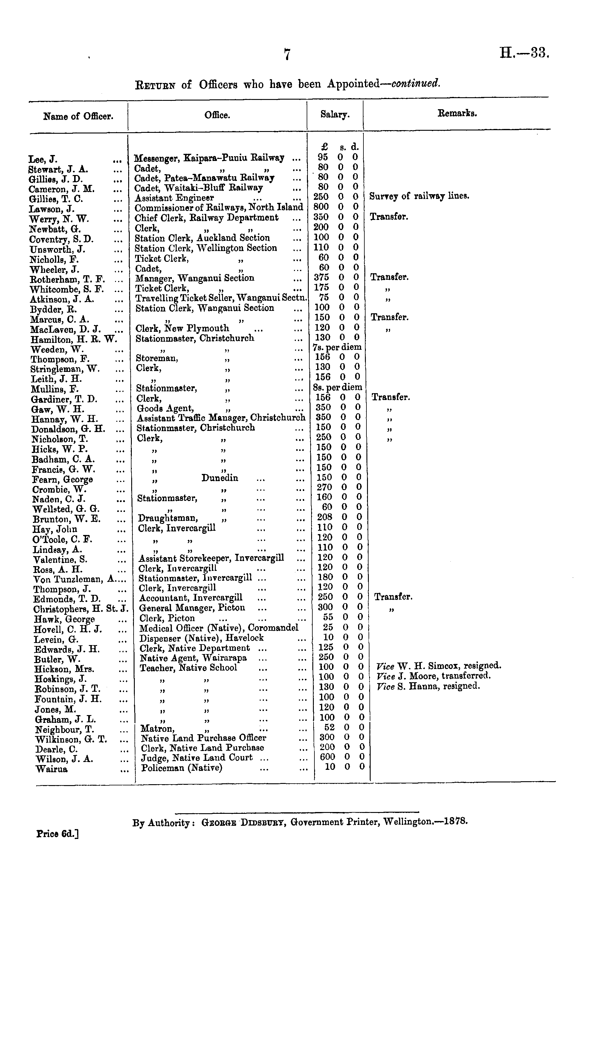 Return of Officers who have been Appointed — continued. Name of Officer. Office. Salary. Remarks. Lee, J. Stewart, J. A. Gillies, J. D. Cameron, J. M. Gillies, T. C. Lawson, J. Werry, N. W. Newbatt, G. Coventry, S.D. Unsworth, J. Nicholls, F. Wheeler, J. Rotherham, T. F. ... Whitcombe, S. F. ... Atkinson, J. A. Bydder, R. Marcus, C. A. MacLaven, D. J. Hamilton, H. R. W. Weeden, W. Thompson, F. Stringleman, W. Leith, J. II. Mullins, F. Gardiner, T. D. Gaw, W. H. Hannay, W. H. Donaldson, G. H. ... Nicholson, T. Hicks, W. P. Badham, C. A. Francis, G. W. Fearn, George Crombie, W. Naden, C. J. Wellsted, G. G. Brunton, W. E. Hay, John O'toole, C. F. Lindsay, A. Valentine. S. Ross, A. H. Von Tunzleman, A.... Thompson, J. Edmonds, T. D. Christophers, H. St. J. Hawk, George Hovell, C. H. J. ... Levein, G. Edwards, J. H. Butler, W. Hickson, Mrs. Hoskings, J. Robinson, J. T. Fountain, J. H. Jones, M. Graham, J. L. Neighbour, T. Wilkinson, G. T. ... Dearie, C. Wilson, J. A. Wairua Messenger, Kaipara-Puniu Railway ... Cadet, „ „ Cadet, Patea-Manawatu Railway Cadet, Waitaki-Bluff Railway Assistant Engineer Commissioner of Railways, North Island Chief Clerk, Railway Department Clerk, „ „ Station Clerk, Auckland Section Station Clerk, Wellington Section Ticket Clerk, Cadet, „ Manager, Wanganui Section Ticket Clerk, Travelling Ticket Seller, Wanganui Sectn. Station Clerk, Wanganui Section jj jj Clerk, New Plymouth Stationmaster, Christchurch jj jj Storeman, ,, Clerk, jj jj ■•' Stationmaster, „ Clerk, Goods Agent, „ Assistant Traffic Manager, Christchurch Stationmaster, Christchurch Clerk, jj jj £ a. A. 95 0 0 80 0 0 '80 0 0 80 0 0 250 0 0 800 0 0 350 0 0 200 0 0 100 0 0 110 0 0 60 0 0 60 0 0 375 0 0 175 0 0 75 0 0 100 0 0 150 0 0 120 0 0 130 0 0 7s. per diem 156 0 0 130 0 0 156 0 0 8s. per diem 156 0 0 350 0 0 350 0 0 150 0 0 250 0 0 150 0 0 150 0 0 150 0 0 150 0 0 270 0 0 160 0 0 60 0 0 208 0 0 110 0 0 120 0 0 110 0 0 120 0 0 120 0 0 180 0 0 120 0 0 250 0 0 300 0 0 55 0 0 25 0 0 10 0 0 125 0 0 250 0 0 100 0 0 100 0 0 130 0 0 100 0 0 120 0 0 100 0 0 52 0 0 300 0 0 200 0 0 600 0 0 10 0 0 Survey of railway lines. Transfer. Transfer. Transfer. jj Transfer. jj jj jj jj jj „ Dunedin ,j jj Stationmaster, „ ,, ,, Draughtsman, „ Clerk, Invercargill jj jj ,, ,, ... ... Assistant Storekeeper, Invercargill Clerk, Invercargill Stationmaster, Invercargill ... Clerk, Invercargill Accountant, Invercargill General Manager, Picton Clerk, Picton Medical Officer (Native), Coromandel Dispenser (Native), Havelock Clerk, Native Department ... Native Agent, Wairarapa ... Teacher, Native School Transfer. jj Vice W. H. Simcox, resigned. Vice J. Moore, transferred. Vice S. Hanna, resigned. „ „ j Matron, „ I Native Land Purchase Officer | Clerk, Native Land Purchase 1 Judge, Native Land Court ... | Policeman (Native) By Authority : George Dedsburt, Government Printer, Wellington. —1878. Price 6d.]