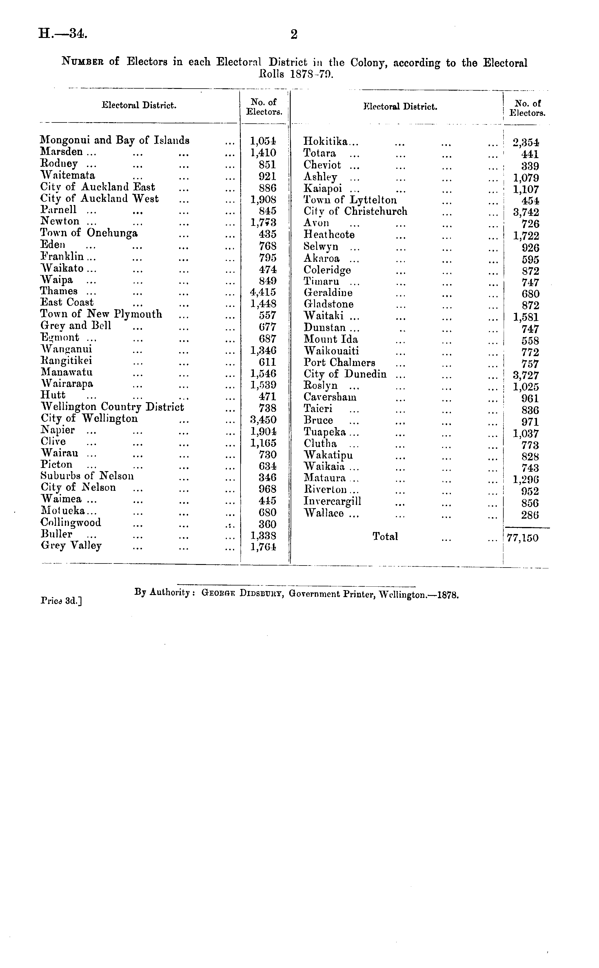 Electoral District. Kb. of Electors. Klecloral District. No. of | Electors. I i Mongonui and Bay of Islands Marsden ... Rodney ... Waitemata City of Auckland East City of Auckland "West Parnell ... Newton ... Town of Onehunga Eden Franklin... W'aikato ... "Waipa Thames ... East Coast Town of New Plymouth Grey and Bill "Ejjmont ... Wanganui Hangitikei Manawatu Wairarapa llutt Wellington Country District City of "Wellington Napier Clive Wairau ... Picton ... Suburbs of Nelson City of Nelson "Waimea ... Molueka... Collingwood Buller ... Grey Valley .:. 1,054 1,410 851 921 886 ] .90S 845 1,773 435 70S 795 474 849 4,415 1,448 557 677 687 1,346 611 1,546 1,539 471 738 3,450 1,901 1,165 730 634 346 968 445 680 360 1.33S 1,764 Ilokitika... Totara ... Cheviot ... Ashley Kaiapoi ... Town of Lyttelton City of Christchurch Avon Heathcote Selwyn ... Aknroa ... Coleridge Titnaru ... Geraldine Gladstone Waitaki ... Dunstan ... Mount Ida Waikouaiti Port Chalmers City of Dunedin ... Eoslyn ... Cavershaui Taieri ... Bruce Tuapeka ... Clutlia ... Wakatipu AVaikaia ... Mataura ... Riverton ... Invercargill Wallace ... 2,354 441 339 1,079 1,107 454 3,742 726 1,722 926 595 872 747 680 872 1,581 747 558 772 757 3,727 1,025 961 S36 971 1,037 773 828 743 1,'J9G 952 856 286 Total ■77,150 'ric<> 3d.] By Authority : G-Eoum; Didseury, overnment Printer, Wellington.'—1878.
