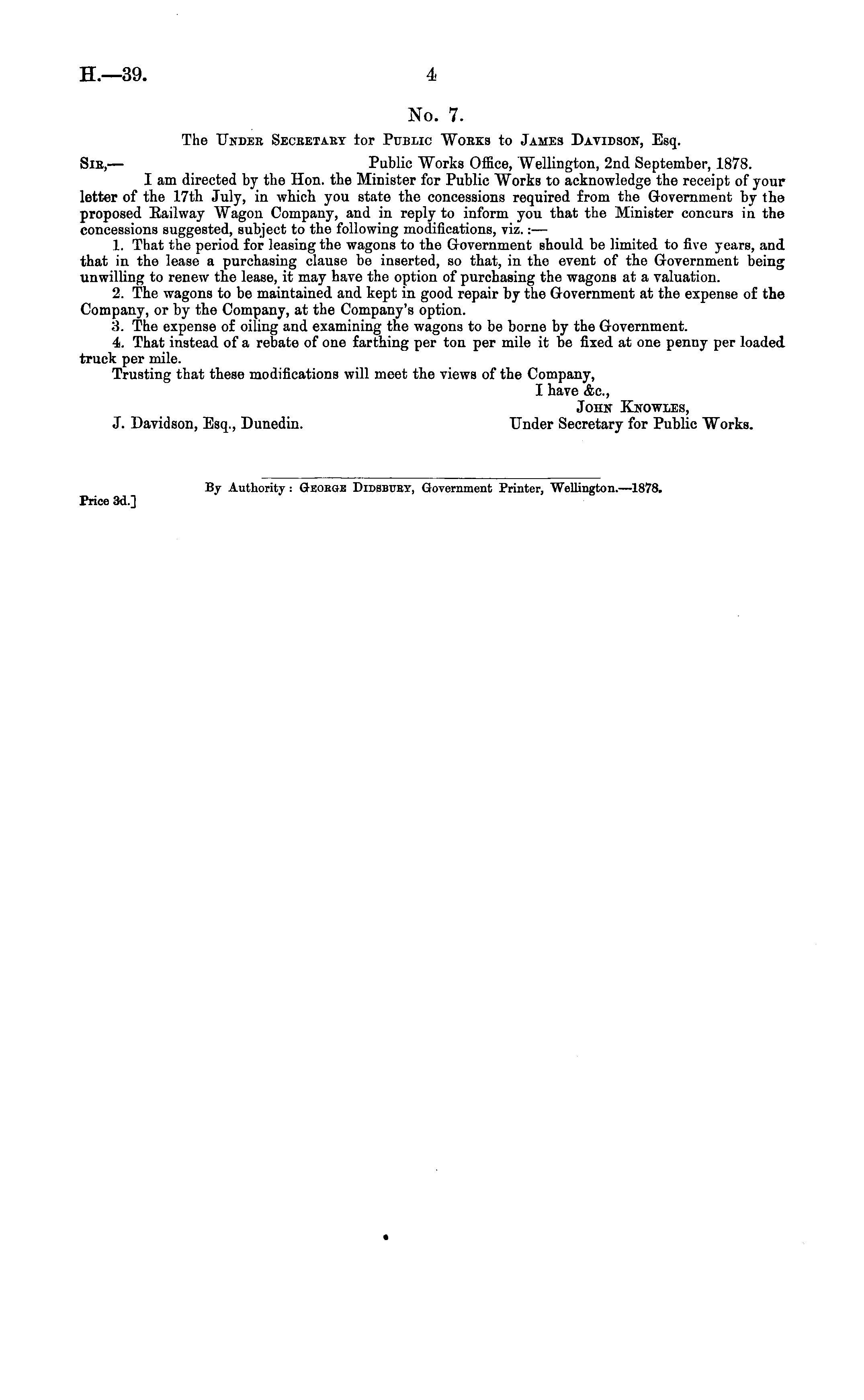 No. 7. The Under Secretary tor Public Works to James Davidson, Esq. Sir,— Public AVorks Office, Wellington, 2nd September, 1878. I am directed by the Hon. the Minister for Public AVorks to acknowledge the receipt of your letter of the 17th July, in which you state the concessions required from the Government by the proposed Eailway AVagon Company, and in reply to inform you that the Minister concurs in the concessions suggested, subject to tho following modifications, viz.:— 1. That the period for leasing the wagons to the Government should be limited to five years, and that in the lease a purchasing clause be inserted, so that, in the event of the Government being unwilling to renew the lease, it may have the option of purchasing the wagons at a valuation. 2. The wagons to be maintained and kept in good repair by the Government at the expense of the Company, or by the Company, at the Company's option. 3. The expense of oiling and examining the wagons to be borne by the Government. 4. That instead of a rebate of one farthing per ton per mile it be fixed at one penny per loaded truck per mile. Trusting that these modifications will meet the views of the Company, I have &c, John Knowles, J. Davidson, Esq., Dunedin. Under Secretary for Public Works. By Authority : Geokqe Didsbuby, Government Printer, Wellington.—lB7B. Price 3d.]