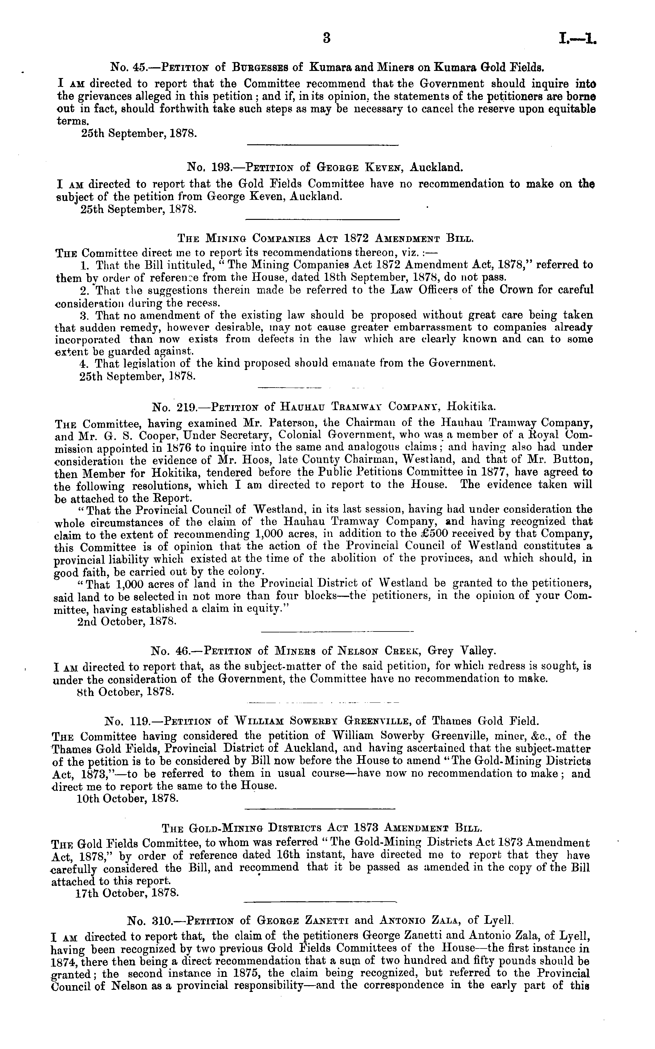 No. 45.—Petition of Buegesses of Kumara and Miners on Kumara Gold Fields. I am directed to report that the Committee recommend that the Government should inquire into the grievances alleged in this petition; and if, in its opinion, the statements of the petitioners are borne out in fact, should forthwith take such steps as may be necessary to cancel the reserve upon equitable terms. 25th September, 1878. No, 193. —Petition of Geoege Keven, Auckland. I am directed to report that the Gold Fields Committee have no recommendation to make on the subject of the petition from George Keven, Auckland. 25th September, 1878. The Mining Companies Act 1872 Amendment Bill. The Committee direct me ro report its recommendations thereon, viz. : — 1. That the Bill intituled, " The Mining Companies Act 1872 Amendment Act, 1878," referred to them bv order of referenre from the House, dated 18th September, 1878, do not pass. 2. That the suggestions therein made be referred to the Law Officers of the Crown for careful consideration during the recess. 3. That no amendment of the existing law should be proposed without great care being taken that sudden remedy, however desirable, may not cause greater embarrassment to companies already incorporated than now exists from defects in the law which are clearly known and can to some extent be guarded against. 4. That legislation of the kind proposed should emanate from the Government. 25th September, 1878. No. 219. —Petition of Hauhau Teamway Company, Hokitika. The Committee, having examined Mr. Paterson, the Chairman of the Hauhau Tramway Company, and Mr. G. S. Cooper, Under Secretary, Colonial Government, who was a member of a Royal Commission appointed in 1876 to inquire into the same and analogous claims; and having also had under consideration the evidence of Mr. Hoos, late County Chairman, Westland, and that of Mr. Button, then Member for Hokitika, tendered before the Public Petitions Committee in 1877, have agreed to the followin" resolutions, which I am directed to report to the House. The evidence taken will be attached to the Report. "That the Provincial Council of Westland, in its last session, having had under consideration the whole circumstances of the claim of the Hauhau Tramway Company, and having recognized that claim to the extent of recommending 1,000 acres, in addition to the £500 received by that Company, this Committee is of opinion that the action of the Provincial Council of Westland constitutes a provincial liability which existed at the time of the abolition of the provinces, and which should, in good faith, be carried out by the colony. " That 1,000 acres of land in the Provincial District of Westland be granted to the petitioners, said land to be selected in not more than four blocks—the petitioners, in the opinion of your Committee, having established a claim in equity." 2nd October, 1878. No. 46. —Petition of Minees of Nelson Ceeek, Grey Valley. I am directed to report that, as the subject-matter of the said petition, for which redress is sought, is under the consideration of the Government, the Committee have no recommendation to make. Nth October, 1878. No. 119. —Petition of William Soweeby Geeenyille, of Thames Gold Field. The Committee having considered tho petition of William Sowerby Greenville, miner, &c, of the Thames Gold Fields, Provincial District of Auckland, and having ascertained that the subject-matter of the petition is to be considered by Bill now before the House to amend "The Gold-Mining Districts Act, 1873," —to be referred to them in usual course—have now no recommendation to make ; and direct me to report the same to the House. 10th October, 1878. The Gold-Mining Disteicts Act 1873 Amendment Bill. The Gold Fields Committee, to whom was referred " The Gold-Mining Districts Act 1873 Amendment Act, 1878," by order of reference dated 16th instant, have directed me to report that they have oarefully considered the Bill, and recommend that it be passed as amended in the copy of the Bill attached to this report. 17th October, 1878. No. 310. —-Petition of Geoege Zanetti and Antonio Zala, of Lyell. I am directed to report that, the claim of the petitioners George Zanetti and Antonio Zala, of Lyell, having been recognized by two previous Gold Fields Committees of the House —the first instance in 1874, there then being a direct recommendation that a sum of two hundred and fifty pounds should be granted; the second instance in 1875, the claim being recognized, but referred to the Provincial Council of Nelson as a provincial responsibility —and the correspondence in the early part of this