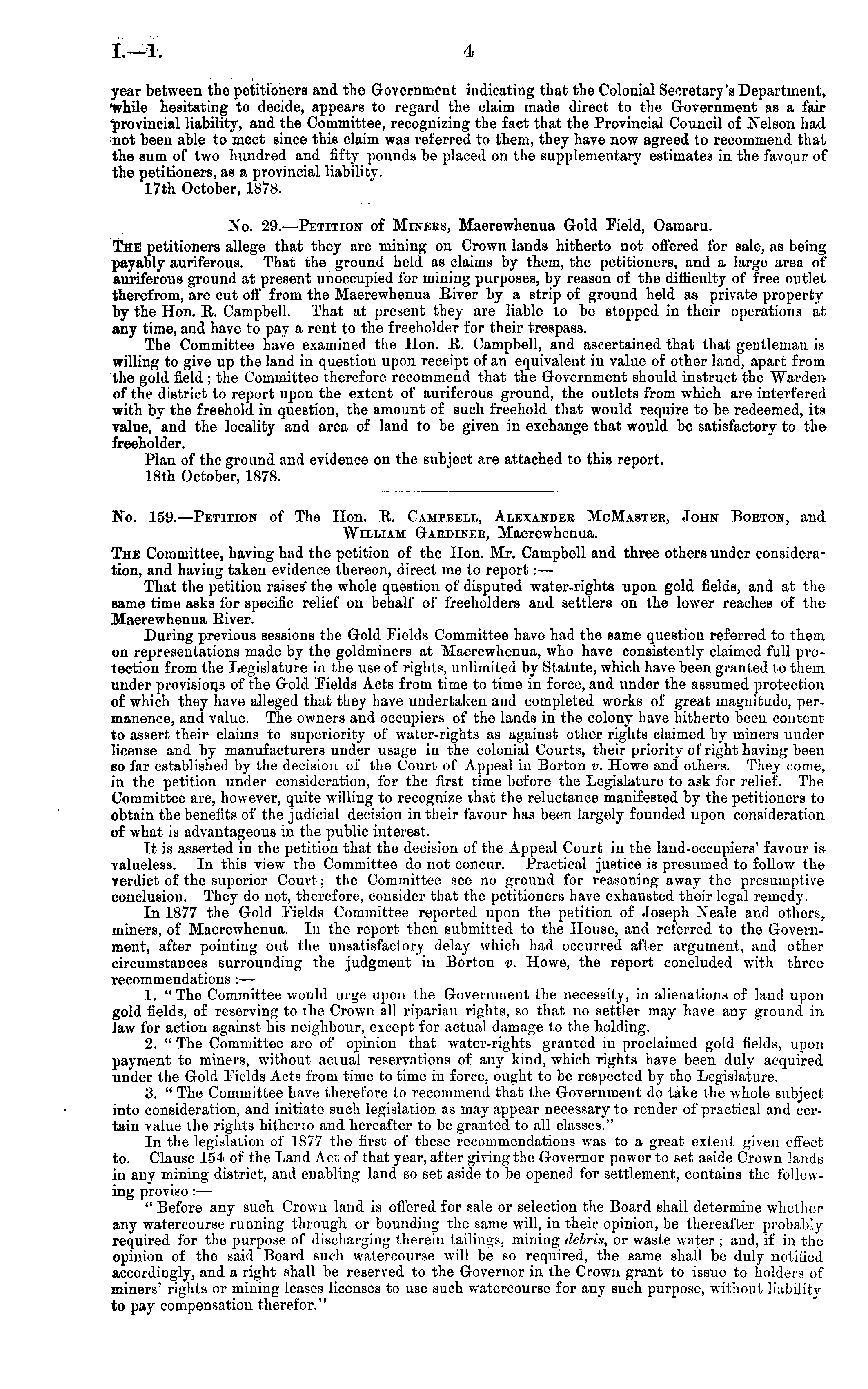 year between the petitioners and the Government indicating that the Colonial Secretary's Department, while hesitating to decide, appears to regard the claim made direct to the Government as a fair provincial liability, and the Committee, recognizing the fact that the Provincial Council of Nelson had not been able to meet since this claim was referred to them, they have now agreed to recommend that the sum of two hundred and fifty pounds be placed on the supplementary estimates in the favour of the petitioners, as a provincial liability. 17th October, 1878. No. 29. —Petition of Minees, Maerewhenua Gold Field, Oamaru. The petitioners allege that they are mining on Crown lands hitherto not offered for sale, as being payably auriferous. That the ground held as claims by them, the petitioners, and a large area of auriferous ground at present unoccupied for mining purposes, by reason of the difficulty of free outlet therefrom, are cut off from the Maerewhenua River by a strip of ground held as private property by the Hon. R. Campbell. That at present they are liable to be stopped in their operations at any time, and have to pay a rent to the freeholder for their trespass. The Committee have examined the Hon. R. Campbell, and ascertained that that gentleman is willing to give up the land in question upon receipt of an equivalent in value of other land, apart from the gold field ; the Committee therefore recommend that the Government should instruct the Warden of the district to report upon the extent of auriferous ground, the outlets from which are interfered with by the freehold in question, the amount of such freehold that would require to be redeemed, its value, and the locality and area of land to be given in exchange that would be satisfactory to the freeholder. Plan of the ground and evidence on the subject are attached to this report. 18th October, 1878. No. 159. —Petition of The Hon. R. Campbell, Alexandee McMastee, John Boston, and William Gaedinee, Maerewhenua. The Committee, having had the petition of the Hon. Mr. Campbell and three others under consideration, and having taken evidence thereon, direct me to report:— That the petition raises the whole question of disputed water-rights upon gold fields, and at the same time asks for specific relief on behalf of freeholders and settlers on the lower reaches of the Maerewhenua River. During previous sessions the Gold Fields Committee have had the same question referred to them on representations made by the goldminers at Maerewhenua, who have consistently claimed full protection from the Legislature in the use of rights, unlimited by Statute, which have been granted to them under provisions of the Gold Fields Acts from time to time in force, and under the assumed protection of which they have alleged that they have undertaken and completed works of great magnitude, permanence, and value. The owners and occupiers of the lands in the colony have hitherto been content to assert their claims to superiority of water-rights as against other rights claimed by miners under license and by manufacturers under usage in the colonial Courts, their priority of right having been so far established by the decision of the Court of Appeal in Borton p. Howe and others. They come, in the petition under consideration, for the first time before the Legislature to ask for relief. The Committee are, however, quite willing to recognize that the reluctance manifested by the petitioners to obtain the benefits of the judicial decision in their favour has been largely founded upon consideration of what is advantageous in the public interest. It is asserted in the petition that the decision of the Appeal Court in the land-occupiers' favour is valueless. In this view the Committee do not concur. Practical justice is presumed to follow the verdict of the superior Court; the Committee see no ground for reasoning away the presumptive conclusion. They do not, therefore, consider that the petitioners have exhausted their legal remedy. In 1877 the Gold Fields Committee reported upon the petition of Joseph Neale and others, miners, of Maerewhenua. In the report then submitted to the House, and referred to the Government, after pointing out the unsatisfactory delay which had occurred after argument, and othercircumstances surrounding the judgment in Borton v. Howe, the report concluded with three recommendations :— 1. " The Committee would urge upon the Government the necessity, in alienations of land upon gold fields, of reserving to the Crown all riparian rights, so that no settler may have any ground in law for action against his neighbour, except for actual damage to the holding. 2. " The Committee are of opinion that water-rights granted in proclaimed gold fields, upon payment to miners, without actual reservations of any kind, which rights have been duly acquired under the Gold Fields Acts from time to time in force, ought to be respected by the Legislature. 3. " The Committee have therefore to recommend that the Government do take the whole subject into consideration, and initiate such legislation as may appear necessary to render of practical and certain value the rights hitherto and hereafter to be granted to all classes." In the legislation of 1877 the first of these recommendations was to a great extent given effect to. Clause 154 of the Land Act of that year, after giving the Governor power to set aside Crown lands in any mining district, and enabling land so set aside to be opened for settlement, contains the following proviso : — " Before any such Crown, land is offered for sale or selection the Board shall determine whether any watercourse running through or bounding the same will, in their opinion, be thereafter probably required for the purpose of discharging therein tailings, mining debris, or waste water ; and, if in the opinion of the said Board such watercourse will be so required, the same shall be duly notified accordingly, and a right shall b