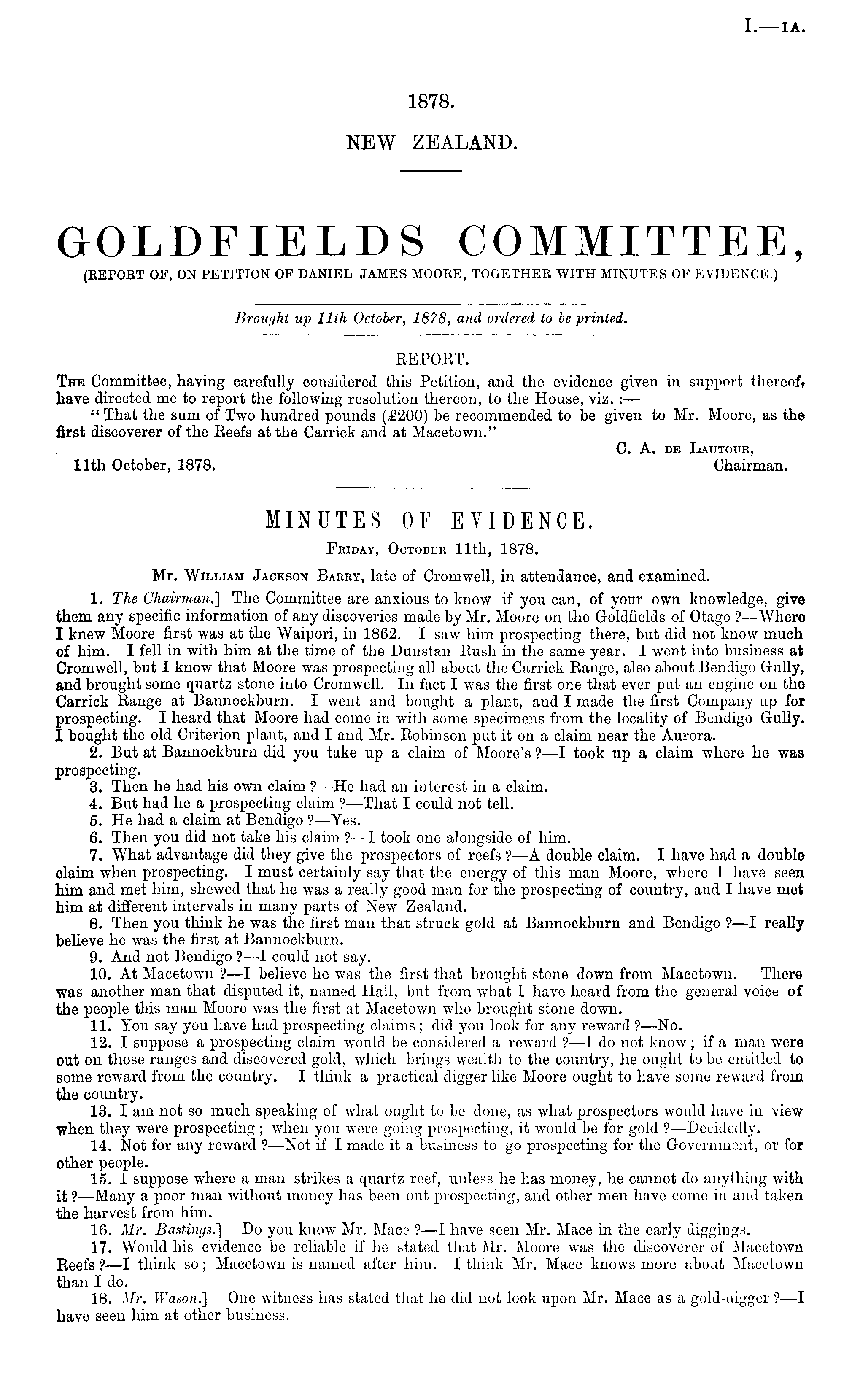 MINUTES OF EVIDENCE. Friday, October 11th, 1878. Mr. William Jackson Barry, late of Cromwell, in attendance, and examined. 1. The Chairman.] The Committee are anxious to know if you can, of your own knowledge, give them any specific information of any discoveries made by Mr. Moore on the Goldfields of Otago ?—AVhere I knew Moore first was at the Waipori, in 1862. I saw him prospecting there, but did not know much of him. I fell in with him at the time of the Dunstan Rush in the same year. I went into business at Cromwell, but I know that Moore was prospecting all about the Carrick Range, also about Bendigo Gully, and brought some quartz stone into Cromwell. In fact I was the first one that ever put an engine on the Carrick Range at Bannockburn. I went and bought a plant, and I made the first Company up for prospecting. I heard that Moore had come in with some specimens from the locality of Bendigo Gully. I bought the old Criterion plant, and I and Mr. Robinson put it on a claim near the Aurora. 2. But at Bannockburn did you take up a claim of Moore's ?—I took up a claim where ho was prospecting. 8. Then he had his own claim ? —He had an interest in a claim. 4. But had he a prospecting claim ? —That I could not tell. 5. He had a claim at Bendigo ? —Yes. 6. Then you did not take his claim ? —I took one alongside of him. 7. What advantage did they give the prospectors of reefs ?—A double claim. I have had a double claim when prospecting. I must certainly say that the energy of this man Moore, where I have seen him and met him, shewed that he was a really good man for the prospecting of country, and I have met him at different intervals in many parts of New Zealand. 8. Then you think he was the first man that struck gold at Bannockburn and Bendigo ?—I really believe he was the first at Bannockburn. 9. And not Bendigo ?—I could not say. 10. At Macetown ?—I believe he was the first that brought stone down from Macetown. There was another man that disputed it, named Hall, but from what I have heard from the general voice of the people this man Moore was the first at Macetown who brought stone down. 11. You say you have had prospecting claims ; did you look for any reward ?—No. 12. I suppose a prospecting claim would be considered a reward ? —I do not know ;if a man were out on those ranges and discovered gold, which brings wealth to the country, he ought to be entitled to some reward from the country. I think a practical digger like Moore ought to have some reward from the country. 13. I am not so much speaking of what ought to be done, as what prospectors would have in view when they were prospecting; when you were going prospecting, it would be for gold ? —Decidedly. 14. Not for any reward ? —Not if I made it a business to go prospecting for the Government, or for other people. 15. I suppose where a man strikes a quartz reef, unless he has money, he cannot do anything with it ? —Many a poor man without money has been out prospecting, and other men have come in and taken the harvest from him. 16. Mr. Bastings.] Do you know Mr. Mace ? —I have seen Mr. Mace in the early diggings. 17. AVould his evidence be reliable if he stated that Mr. Moore was the discoverer of Macetown Reefs ?—I think so; Macetown is named after him. I think Mr. Mace knows more about Macetown than I do. 18. Mr. Wason.] One witness has stated that he did not look upon Mr. Mace as a gold-digger ?—I have seen him at other business.