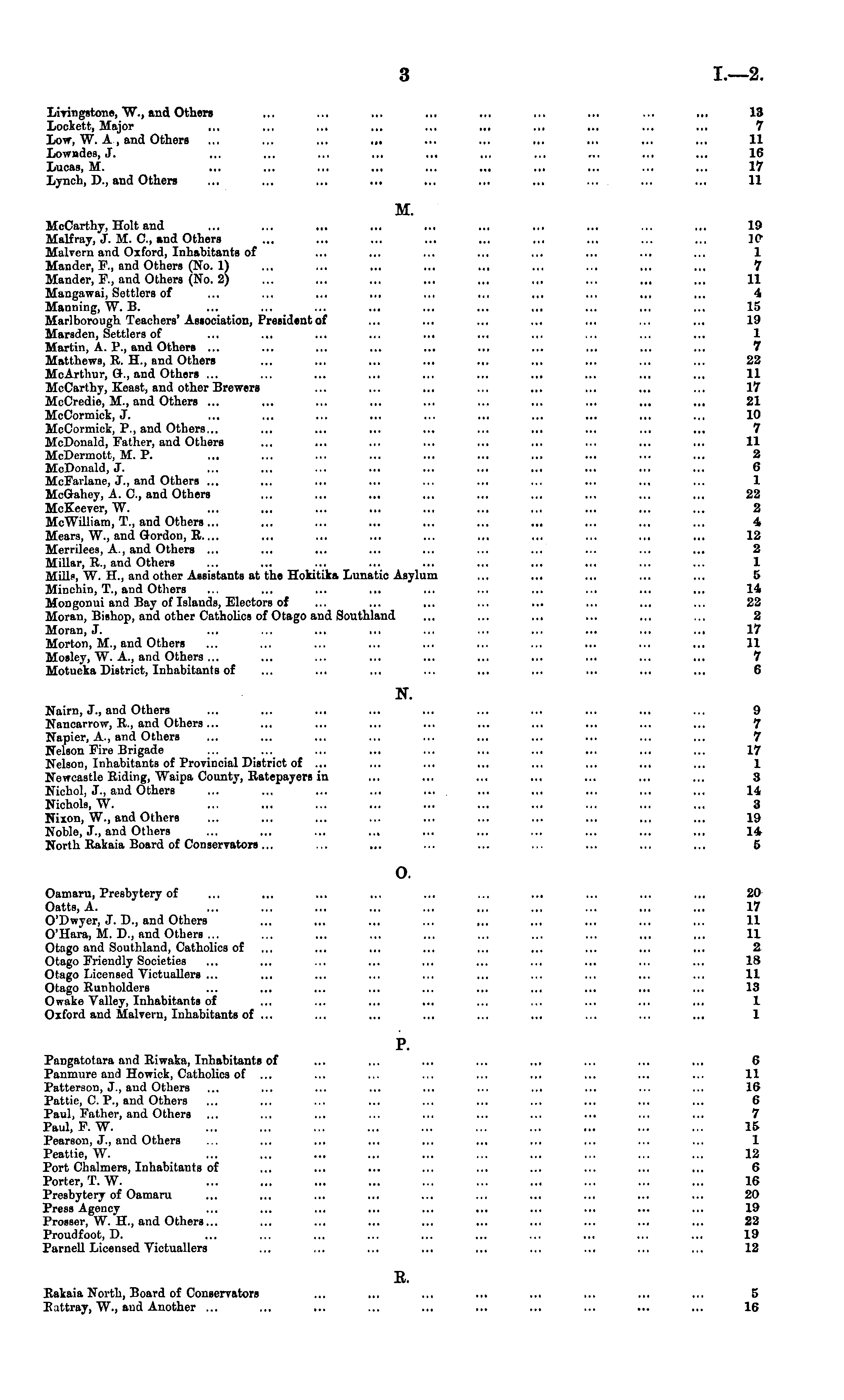 Livingstone, W., and Others ... ... ... ... ... ... ... ... ... 13 Lockett, Major ... ... ... ... ... ... ... ... ... .,, 7 low, W. A, and Others ... ... ... ... ... ... ... ... ... ... 11 Lowndes, J. ... ... ... ... ... ... ... ... ... ... 16 Lucas, M. ... ... ... ... ... ... ... ... ... ... 17 Lynch, D., and Others ... ... ... ... ... ... ... ... ... ... 11 M. McCarthy, Holt and ... ... ... ... ... ... ... ... ... ... 19 Malfray, J. M. C, and Others ... ... ... ... ... ... ... ... ... ]P Malvern and Oxford, Inhabitants of ... ... ... ... ... ... ... ... 1 Mander, F., and Others (No. 1) ... ... ... ... ... ... ... ... ... 7 Mander, P., and Others (No. 2) ... ... ... ... ... ... ... ... ... 11 Mangawai, Settlers of ... ... ... ... ... ... ... ... ... ... 4 Manning, W. B. ... ... ... ... ... ... ... ... ... ... 15 Marlborough Teachers' Asiociation, President of ... ... ... ... ... ... ... 19 Marsden, Settlers of ... ... ... ... ... ... ... ... ... ... 1 Martin, A. P., and Others ... ... ... ... ... ... ... ... ... ... 7 Matthews, R. H., and Others ... ... ... ... .,. ... ... ... ... 22 McArthur, G., and Others ... ... ... ... ... ... ... ... ... ... 11 McCarthy, Keast, and other Brewers ... ... ... ... ... ... ... ... 17 McCredie, II., and Others ... ... ... ... ... ... ... ... ... ... 21 McCormiek, J. ... ... ... ... ... ... ... ... ... ... 10 MeCormick, P., and Others... ... ... ... ... ... ... ... ... ... 7 McDonald, Father, and Others ... ... ... ... ... ... ... ... ... 11 McDermott, M. P. ... ... ... ... ... ... ... ... ... ... 2 McDonald, J. ... ... ... ... ... ... ... ... ... ... 6 MeFarlane, J., and Others ... ... ... ... ... ... ... ... ... ... 1 McGahey, A. 0., and Others ... ... ... ... ... ... ... ... ... 22 McKeever, W. ... ... ... ... ... ... ... ... ... ... 2 McWilliam, T., and Others... ... ... ... ... ... ... ... ... ... 4 Mears, W., and Gordon, R.... ... ... ... ... ... ... ... ... ... 12 Merrilees, A, and Others ... ... ... ... ... ... ... ... ... ... 2 Millar, R., and Others ... ... ... ... ... ... ... ... ... ... 1 Mills, W. H., and other Assistants at the Hokitika Lunatic Asylum ... ... .,, ... ... 5 Minchin, T., and Others ... ... ... ... ... ... ... ... ... ... 14 Mongonui and Bay of Islands, Electors of ... ... ... ... ... ... ... ... 22 Moran, Bishop, and other Catholics of Otago and Southland ... ... ... ... ... ... 2 Moran, J. ... ... ... ... ... ... ... ... ... ... 17 Morton, M., and Others ... ... ... ... ... ... ... ... ... ... 11 Mosley, W. A., and Others ... ... ... ... ... ... ... ... ... ... 7 Motueka District, Inhabitants of ... ... ... ... ... ... ... ... ... 6 N. Nairn, J., and Others ... ... ... ... ... ... ... ... ... ... 9 Nancarrow, R, and Others ... ... ... ... ... ... ... ... ... ... 7 Napier, A., and Others ... ... ... ... ... ... ... ... ... ... 7 Nelson Fire Brigade ... ... ... ... ... ... ... ... ... ... 17 Nelson, Inhabitants of Provincial District of ... ... ... ... ... ... ... ... 1 Newcastle Riding, Waipa County, Ratepayers in ... ... ... ... ... ... ... 3 Nichol, J., and Others ... ... ... ... ... ... ... ... ... ... 14 Nichols, W. ... ... ... ... ... ... ... ... ... ... 3 Nixon, W., and Others ... ... ... ... ... ... ... ... ... ... 19 Noble, J., and Others ... ... ... ... ... ... ... ... ... ... 14 North Rakaia Board of Conservators ... ... ... ... ... ... ... ... ... 5 o. Oamaru, Presbytery of ... ... ... ... ... ... ... ... ... ... 20 Oatts, A. ... ... ... ... ... ... ... ... ... ... 17 O'Dwyer, J. D., and Others ... ... ... ... ... ... ... ... ... 11 O'Hara, M. D., and Others ... ... ... ... ... ... ... ... ... ... 11 Otago and Southland, Catholics of ... ... ... ... ... ... ... ... ... 2 Otago Friendly Societies ... ... ... ... ... ... ... ... ... ... 18 Otago Licensed Victuallers ... ... ... ... ... ... ... ... ... ... 11 Otago Runholders ... ... ... ... ... ... ... ... ... ... 13 Owake Valley, Inhabitants of ... ... ... ... ... ... ... ... ... 1 Oxford and Malvern, Inhabitants of ... ... ... ... ... ... ... ... ... 1 P. Pangatotara and Riwaka, Inhabitants of ... ... ... ... ... ... ... ... 6 Panmure and Howiek, Catholics of ... ... ... ... ... ... ... ... ... 11 Patterson, J., and Others ... ... ... ... ... ... ... ... ... ... 16 Pattie, C. P., and Others ... ... ... ... ... ... ... ... ... ... 6 Paul, Father, and Others ... ... ... ... ... ... ... ... ... ... 7 Paul, F. W. ... ... ... ... ... ... ... ... ... ... 15 Pearson, J., and Others ... ... ... ... ... ... ... ... ... ... 1 Peattie, \V. ... ... ... ... ... ... ... ... ... ... 12 Port Chalmers, Inhabitants of ... ... ... ... ... ... ... ... ... 6 Porter, T. W. ... ... ... ... ... ... ... ... ... ... 16 Presbytery of Oamaru ... ... ... ... ... ... ... ... ... ... 20 Press Agency ... ... ... ... ... ... ... ... ... ... 19 Prosser, W. H., and Others... ... ... ... ... ... ... ... ... ... 22 Proudfoot, D. ... ... ... ... ... ... ... ... ... ... 19 Parnell Licensed Victuallers ... ... ... ... ... ... ... ... ... 12 E. Rakaia North, Board of Conservators ... ... ... ... ... ... ... ... 5 Rattray, W., and Another ... ... ... ... ... ... ... ... ... ... 16
