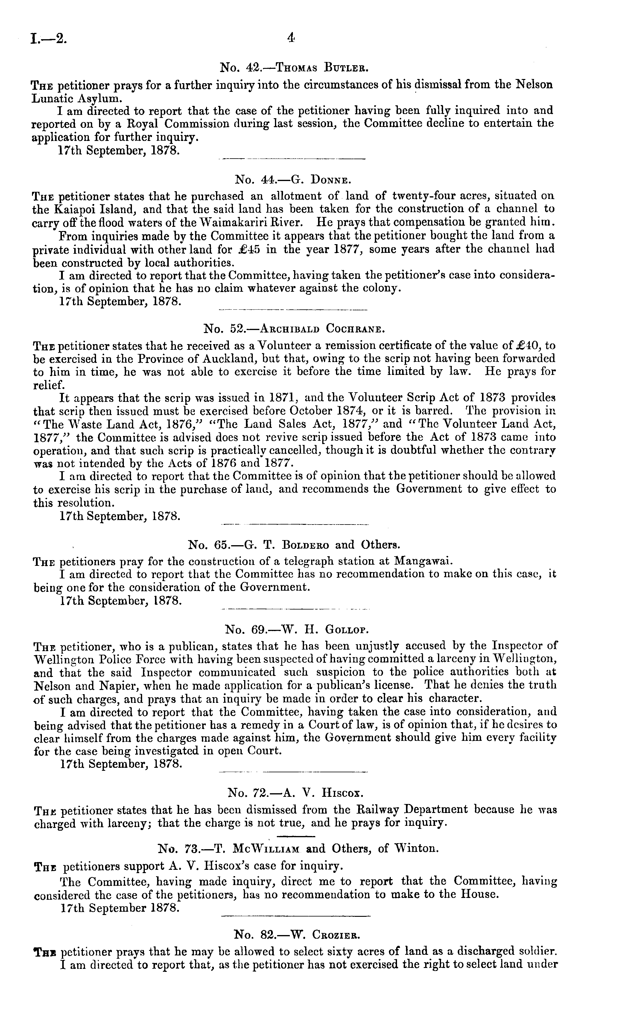 No. 42.—Thomas Butler. The petitioner prays for a further inquiry into the circumstances of his dismissal from the Nelson Lunatic Asylum. I am directed to report that the case of the petitioner having been fully inquired into and reported on by a Royal Commission during last session, the Committee decline to entertain the application for further inquiry. 17th September, 1878. '
