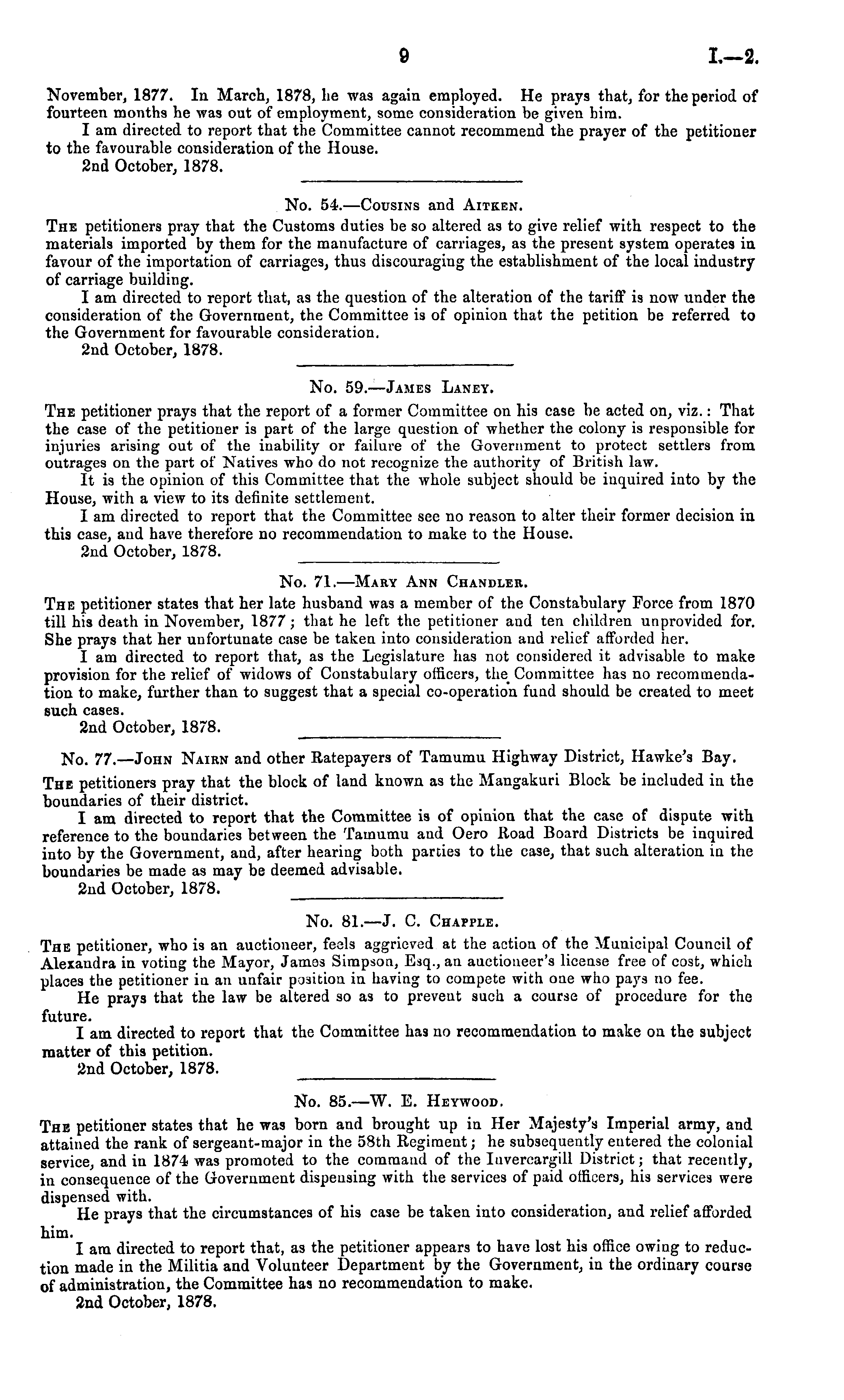 No. 59.—James Laney. The petitioner prays that the report of a former Committee on his case be acted on, viz.: That the case of the petitioner is part of the large question of whether the colony is responsible for injuries arising out of the inability or failure of the Government to protect settlers from outrages on the part of Natives who do not recognize the authority of British law. It is the opinion of this Committee that the whole subject should be inquired into by the House, with a view to its definite settlement. I am directed to report that the Committee see no reason to alter their former decision in this case, and have therefore no recommendation to make to the House. 2nd October, 1878.