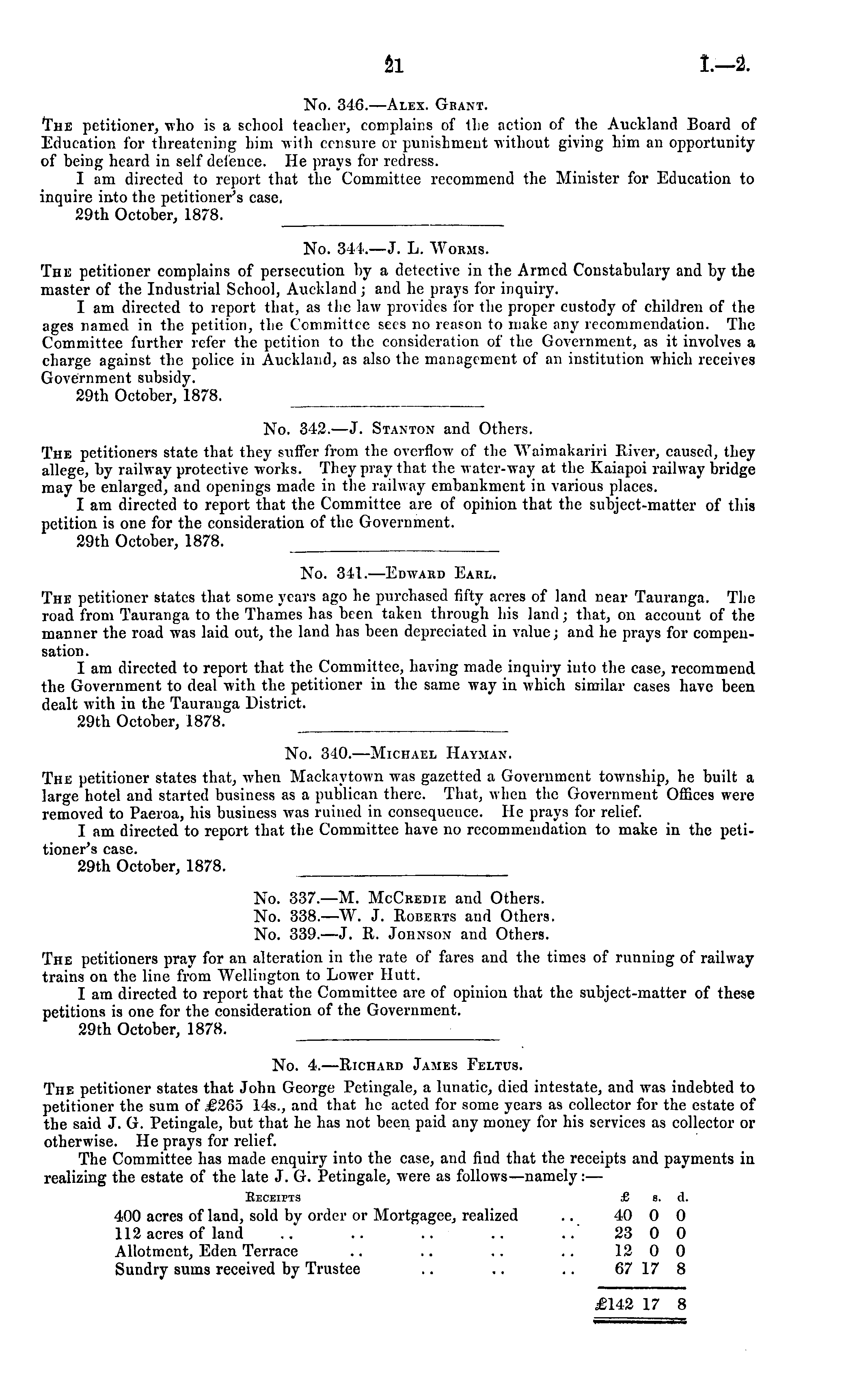 No. 4.—Richard James Feltus. The petitioner states that John George Petingale, a lunatic, died intestate, and was indebted to petitioner the sum of £265 145., and that he acted for some years as collector for the estate of the said J. G. Petingale, but that he has not been paid any money for his services as collector or otherwise. He prays for relief. The Committee has made enquiry into the case, and find that the receipts and payments in realizing the estate of the late J. G. Petingale, were as follows—namely:— Eeceipts £ s. d. 400 acres of land, sold by order or Mortgagee, realized .. 40 0 0 112 acres of land ..' .. .. .. ..' 23 0 0 Allotment, Eden Terrace .. .. .. .. 12 0 0 Sundry sums received by Trustee .. .. .. 67 17 8 £142 17 8