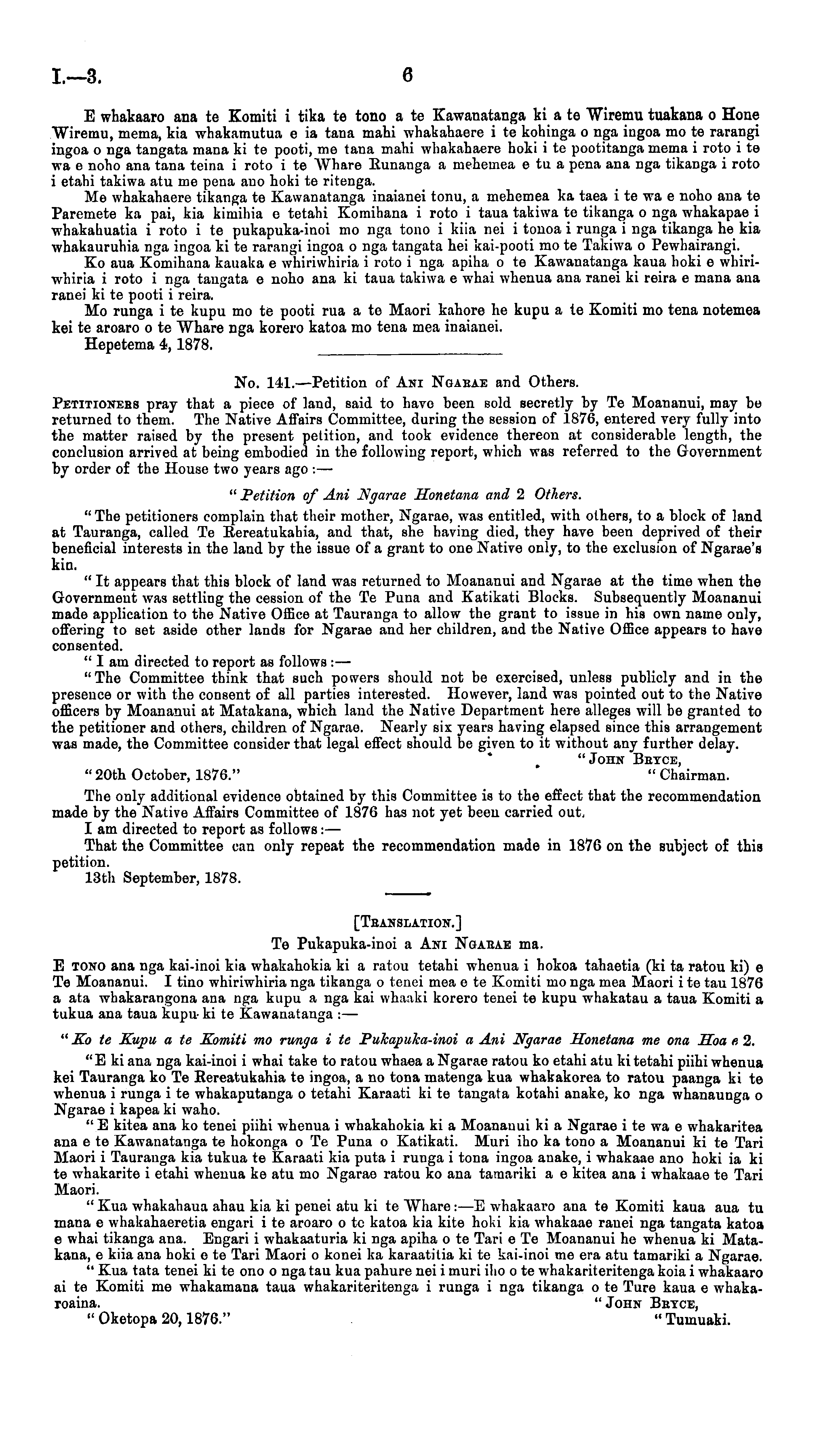 [Tbanslation.] Te Pukapuka-inoi a Ani Ngaeae ma. E tono ana nga kai-inoi kia whakahokia ki a ratou tetahi whenua i hokoa tahaetia (ki ta ratou ki) c Te Moananui. I tino whiriwhiria nga tikanga o tenei mea etc Komiti mo nga mea Maori ite tau 1876 a ata whakarangona ana nga kupu a nga kai whanki korero tenei te kupu whakatau a taua Komiti a tukua ana taua kupu kite Kawanatanga : — "Ko te Kupu a te Komiti mo runga i te Pukapuka-inoi a Ani Ngarae Honetana me ona Hoa c 2. " E ki ana nga kai-inoi i whai take to ratou whaea a Ngarae ratou ko etahi atu ki tetahi piihi whenua kei Tauranga ko Te Bereatukahia te ingoa, a no tona matenga kua whakakorea to ratou paanga kite whenua i runga i te whakaputanga o tetahi Karaati kite tangata kotahi anake, ko nga whanaunga o Ngarae i kapea ki waho. " E kitea ana ko tenei piihi whenua i whakahokia ki a Moananui ki a Ngarae i te wa c whakaritea ana etc Kawanatanga te hokonga oTe Puna o Katikati. Muri iho ka tono a Moananui kite Tari Maori i Tauranga kia tukua te Karaati kia puta i runga i tona ingoa anake, i whakaae ano hoki ia ki te whakarite i etahi whenua ke atu mo Ngarae ratou ko ana tamariki a c kitea ana i whakaae te Tari Maori. " Kua whakahaua ahau kia ki penei atu kite Whare: —E whakaaro ana te Komiti kaua aua tv mana c whakahaeretia engari i te aroaro o te katoa kia kite hold kia whakaae ranei nga tangata katoa c whai tikanga ana. Engari i whakaaturia ki nga apiha ote Tari eTe Moananui he whenua ki Matakana, c kiia ana hoki c te Tari Maori o konei ka karaatitia kite kai-inoi me era atu tamariki a Ngarae. " Kua tata tenei kite ono o nga tau kua pahure nei i muri iho o te whakariteritenga koia i whakaaro ai te Komiti me whakamana taua whakariteritenga i runga i nga tikanga o te Ture kaua c whakaroaina. " John Bryce, " Oketopa 20,1876." " Tumuaki.