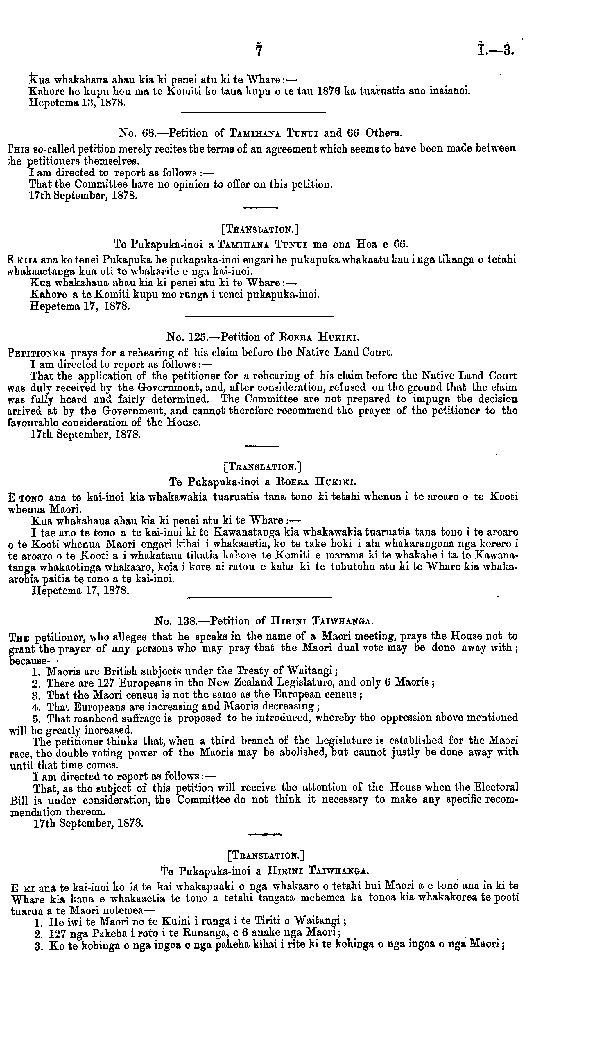 [Tbanslation.] Te Pukapuka-inoi a Boera Hukiki. E tono ana te kai-inoi kia whakawakia tuaruatia tana tono ki tetahi whenua i te aroaro o te Kooti whenua Maori. Kua whakahaua ahau kia ki penei atu kite Whare : — I tae ano te tono a te kai-inoi kite Kawanatanga kia whakawakia tuaruatia tana tono i te aroaro o te Kooti whenua Maori engari kihai i whakaaetia, ko te take hoki i ata whakarangona nga korero i te aroaro o te Kooti a i whakataua tikatia kahore te Komiti c marama kite whakahe i ta te Kawanatanga whakaotinga whakaaro, koia i kore ai ratou c kaha kite tohutohu atu kite Whare kia whakaarohia paitia te tono a te kai-inoi. Hepetema 17,1878.