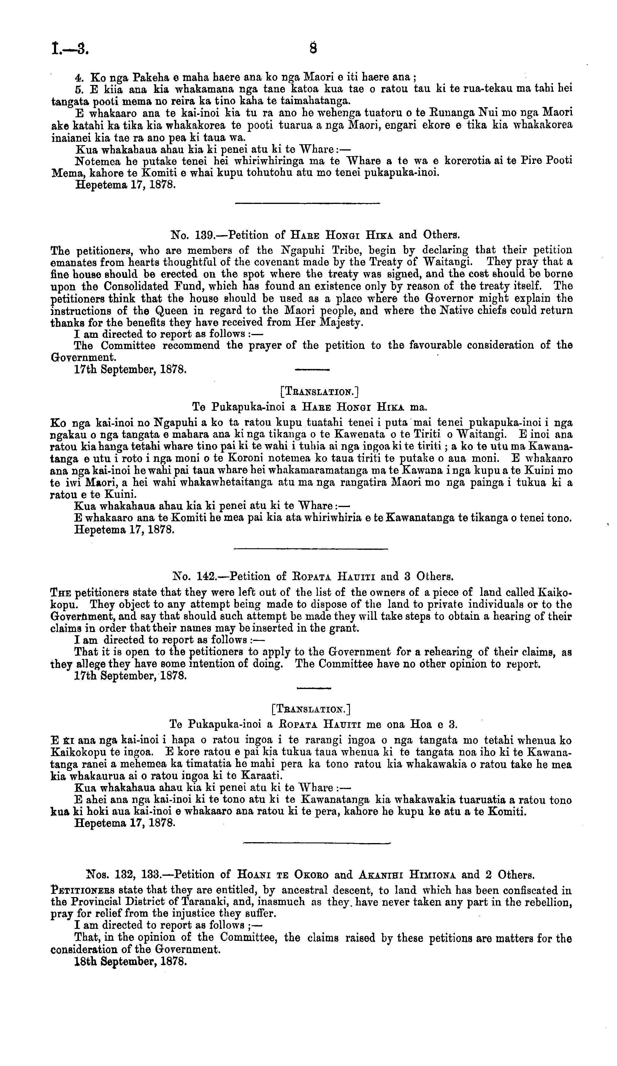 No. 139. —Petition of Haee Hongi Hika and Others. The petitioners, who are members of the Ngapuhi Tribe, begin by declaring that their petition emanates from hearts thoughtful of the covenant made by the Treaty of Waitangi. They pray that a fine house should be erected on the spot where the treaty was signed, and the cost should be borne upon the Consolidated Fund, which has found an existence only by reason of the treaty itself. The petitioners think that the house should be used as a place where the Governor might explain the instructions of the Queen in regard to the Maori people, and where the Native chiefs could return thanks for the benefits they have received from Her Majesty. I am directed to report as follows :— The Committee recommend the prayer of the petition to the favourable consideration of the Government. 17th September, 1878.