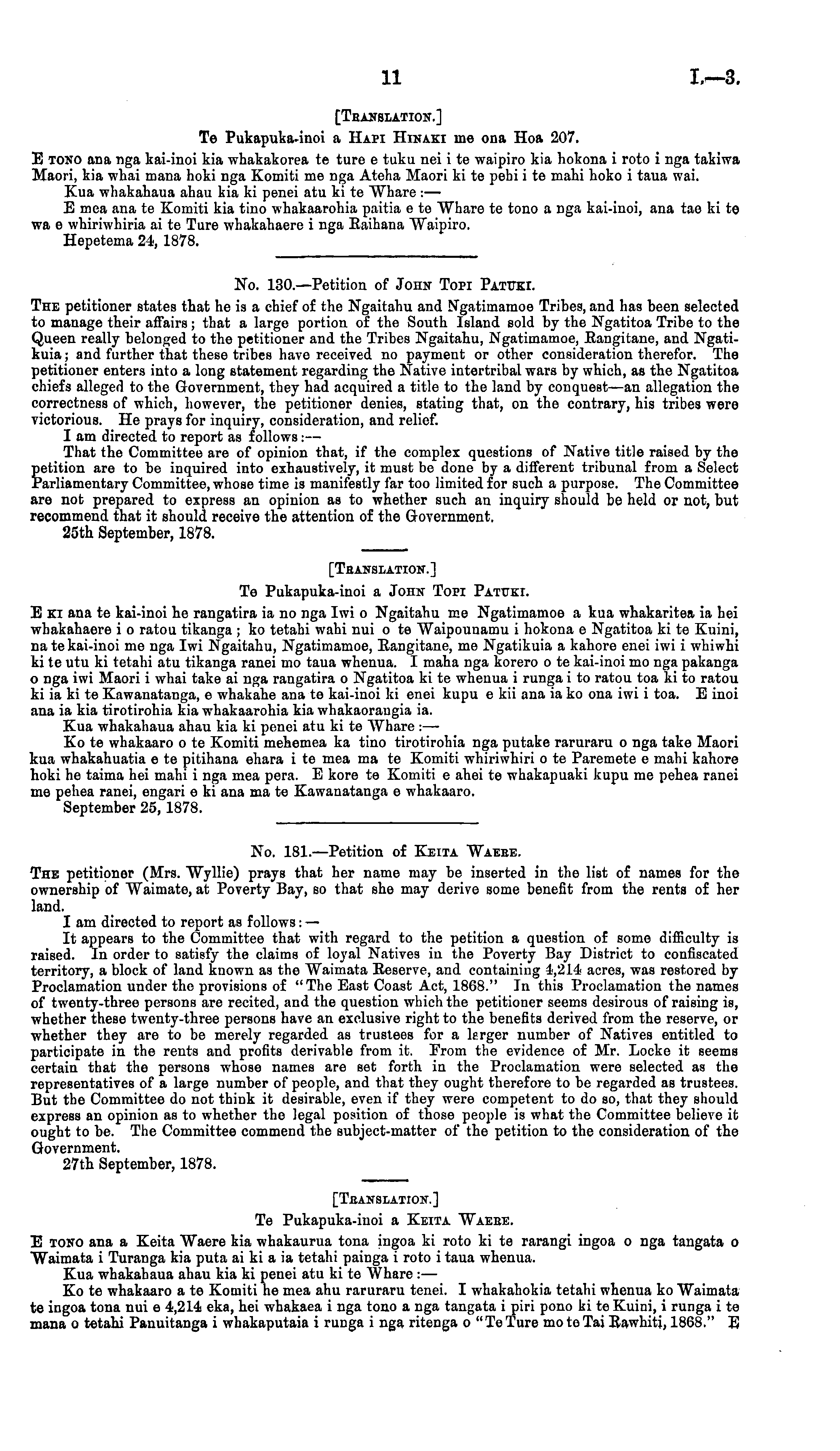 [Translation.] Te Pukapuka-inoi a John Topi Patuki. E ki ana te kai-inoi he rangatira ia no nga Iwi o Ngaitahu me Ngatimamoe a kua whakaritea ia hei whakahaere i o ratou tikanga ; ko tetahi wahi nui o te Waipounamu i hokona c Ngatitoa kite Kuini, na te kai-inoi me nga Iwi Ngaitahu, Ngatimamoe, Rangitane, me Ngatikuia a kahore enei iwi i whiwhi kite utu ki tetahi atu tikanga ranei mo taua whenua. I maha nga korero ote kai-inoi mo nga pakanga o nga iwi Maori i whai take ai nga rangatira o Ngatitoa kite whenua i runga i to ratou toa ki to ratou ki ia kite Kawanatanga, c whakahe ana te kai-inoi ki enei kupu c kii ana ia ko ona iwi i toa. E inoi ana ia kia tirotirohia kia whakaarohia kia whakaorangia ia. Kua whakahaua ahau kia ki penei atu kite Whare : — Ko te whakaaro o te Komiti mehemea ka tino tirotirohia nga putake raruraru o nga take Maori kua whakahuatia c te pitihana ehara i te mea ma te Komiti whiriwhiri o te Paremete c mahi kahore hoki he taima hei mahi i nga mea pera. E kore te Komiti c ahei te whakapuaki kupu me pehea ranei me pehea ranei, engari c ki ana ma te Kawanatanga c whakaaro. September 25, 1878.