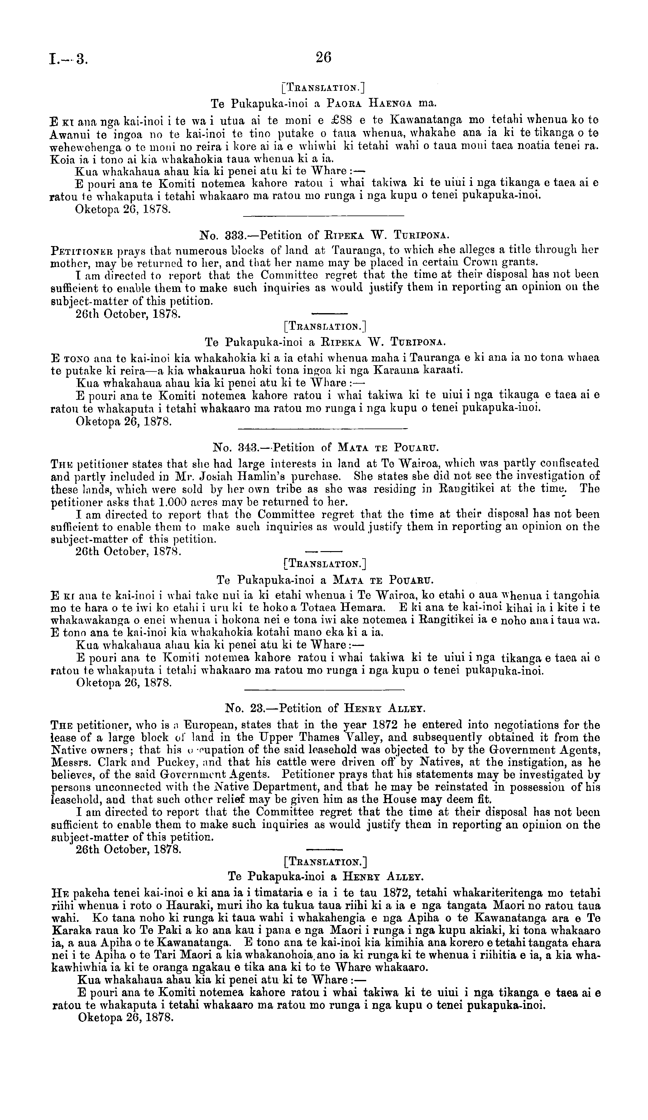 [Translation.] Te Pukapuka-inoi a Paora Haenga ma. E ki ana nga kai-inoi i te wa i utua ai te moni c £88 c te Kawanatanga mo tetahi whenua ko to Awanui te ingoa no te kai-inoi te tino putake o taua whenua, whakahe ana ia kite tikanga o te wehewehenga o te moni no reira i kore ai ia c whiwhi ki tetahi wahi o taua moni taea noatia tenei ra. Koia ia i tono ai kia whakahokia taua whenua ki a ia. Kua whakahaua ahau kia ki penei atu kite Whare : — E pouri ana te Komiti notemea kahore ratou i whai takiwa kite uiui i nga tikanga c taea ai c ratou le whakaputa i tetahi whakaaro ma ratou mo runga i nga kupu o tenei pukapuka-inoi. Oketopa 20, 1878.