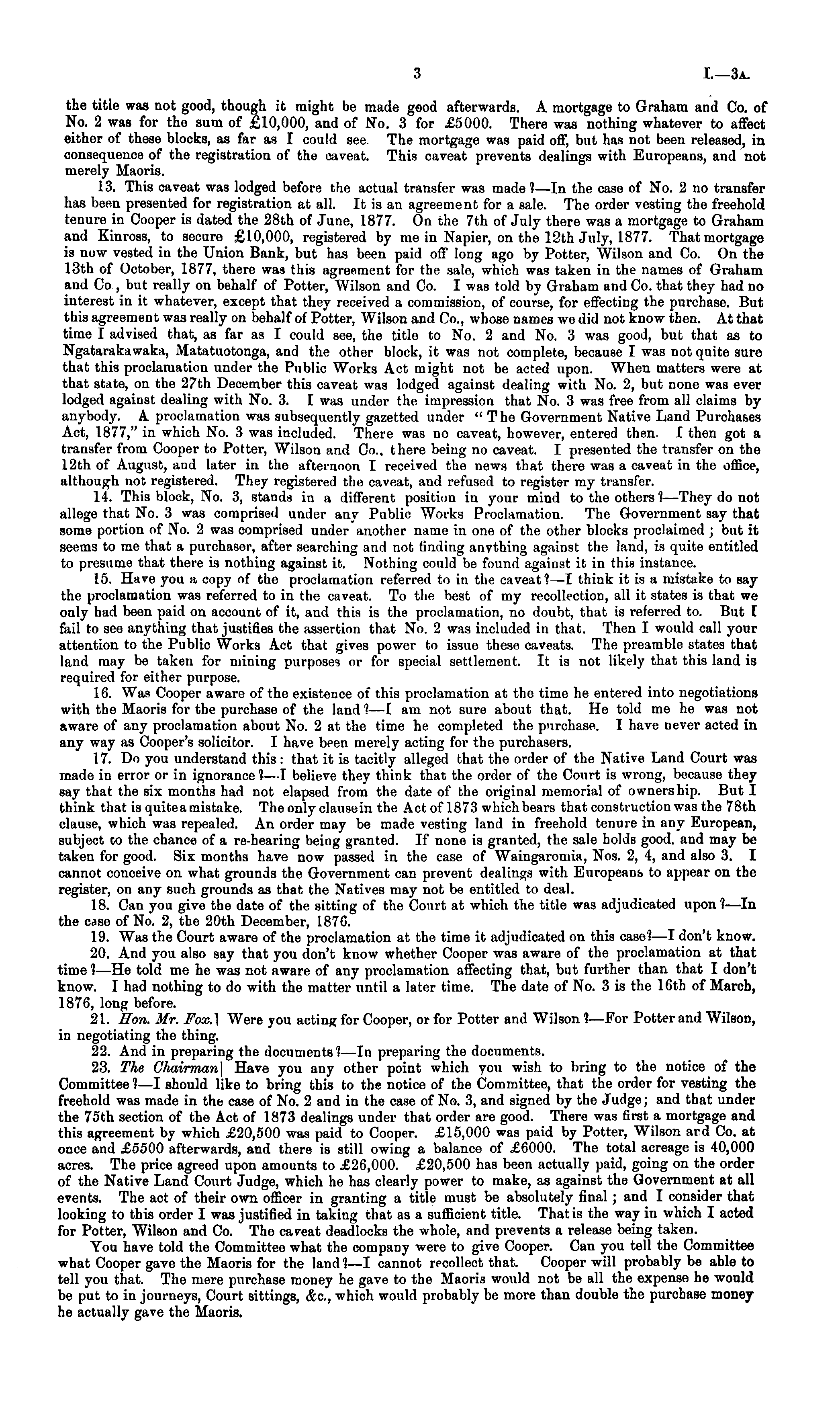 the title was not good, though it might be made good afterwards. A mortgage to Graham and Co, of No. 2 was for the sum of £10,000, and of No. 3 for £5000. There was nothing whatever to affect either of these blocks, as far as I could see The mortgage was paid off, but has not been released, in consequence of the registration of the caveat. This caveat prevents dealings with Europeans, and not merely Maoris. 13. This caveat was lodged before the actual transfer was made I—ln the case of No. 2 no transfer has been presented for registration at all. It is an agreement for a sale. The order vesting the freehold tenure in Cooper is dated the 28th of June, 1877. On the 7th of July there was a mortgage to Graham and Kinross, to secure £10,000, registered by me in Napier, on the 12th July, 1877. That mortgage is now vested in the Union Bank, but has been paid off long ago by Potter, Wilson and Co. On the 13th of October, 1877, there was this agreement for the sale, which was taken in the names of Graham and Co , but really on behalf of Potter, Wilson and Co. I was told by Graham and Co. that they had no interest in it whatever, except that they received a commission, of course, for effecting the purchase. But this agreement was really on behalf of Potter, Wilson and Co., whose names we did not know then. At that time I advised that, as far as I could see, the title to No. 2 and No. 3 was good, but that as to Ngatarakawaka, Matatuotonga, and the other block, it was not complete, because I was not quite sure that this proclamation under the Public Works Act might not be acted upon. When matters were at that state, on the 27th December this caveat was lodged against dealing with No. 2, but none was ever lodged against dealing with No. 3. I was under the impression that No. 3 was free from all claims by anybody. A proclamation was subsequently gazetted under " The Government Native Land Purchases Act, 1877," in which No. 3 was included. There was no caveat, however, entered then. I then got a transfer from Cooper to Potter, Wilson and Co., there being no caveat. I presented the transfer on the 12th of August, and later in the afternoon I received the news that there was a caveat in the office, although not registered. They registered the caveat, and refused to register my transfer. 14. This block, No. 3, stands in a different position in your mind to the others ?—They do not allege that No. 3 was comprised under any Public Works Proclamation. The Government say that some portion of No. 2 was comprised under another name in one of the other blocks proclaimed ; but it seems to me that a purchaser, after searching and not finding anything against the land, is quite entitled to presume that there is nothing against it. Nothing could be found against it in this instance. 15. Have you a copy of the proclamation referred to in the caveat?—l think it is a mistake to say the proclamation was referred to in the caveat. To the best of my recollection, all it states is that we only had been paid on account of it, and this is the proclamation, no doubt, that is referred to. But I fail to see anything that justifies the assertion that No. 2 was included in that. Then I would call your attention to the Public Works Act that gives power to issue these caveats. The preamble states that land may be taken for mining purposes or for special settlement. It is not likely that this land is required for either purpose. 16. Was Cooper aware of the existence of this proclamation at the time he entered into negotiations with the Maoris for the purchase of the land ?—I am not sure about that. He told me he was not aware of any proclamation about No. 2at the time he completed the purchase. I have never acted in any way as Cooper's solicitor. I have been merely acting for the purchasers. 17. Do you understand this: that it is tacitly alleged that the order of the Native Land Court was made in error or in ignorance?—l believe they think that the order of the Court is wrong, because they say that the six months had not elapsed from the date of the original memorial of ownership. But I think that is quite a mistake. The only clause in the Act of 1873 which bears that construction was the 78th clause, which was repealed. An order may be made vesting land in freehold tenure in any European, subject to the chance of a re-hearing being granted. If none is granted, the sale holds good, and may be taken for good. Six months have now passed in the case of Waingaromia, Nos. 2, 4, and also 3. I cannot conceive on what grounds the Government can prevent dealings with Europeans to appear on the register, on any such grounds as that the Natives may not be entitled to deal. 18. Can you give the date of the sitting of the Court at which the title was adjudicated upon ?—ln the case of No. 2, the 20th December, 1876. 19. Was the Court aware of the proclamation at tbe time it adjudicated on this case?—l don't know. 20. And you also say that you don't know whether Cooper was aware of the proclamation at that time ?—He told me he was not aware of any proclamation affecting that, but further than that I don't know. I had nothing to do with the matter until a later time. The date of No. 3is the 16th of March, 1876, long before. 21. Hon. Mr. Fox.) Were you acting for Cooper, or for Potter and Wilson ?—For Potter and Wilson, in negotiating the thing. 22. And in preparing the documents?—ln preparing the documents. 23. The Chairman] Have you any other point which you wish to bring to the notice of the Committee ?—I should like to bring this to the notice of the Committee, that the order for vesting the freehold was made in the case of No. 2 and in the case of No. 3, and signed by the Judge; and that under the 75th section of the Act of 1873 dealings under that order are good. There was first a mortgage and this agreement by which £20,500 was paid to Cooper. £15,000 was paid by Potter, Wilson ard Co. at once and £5500 afterwards,