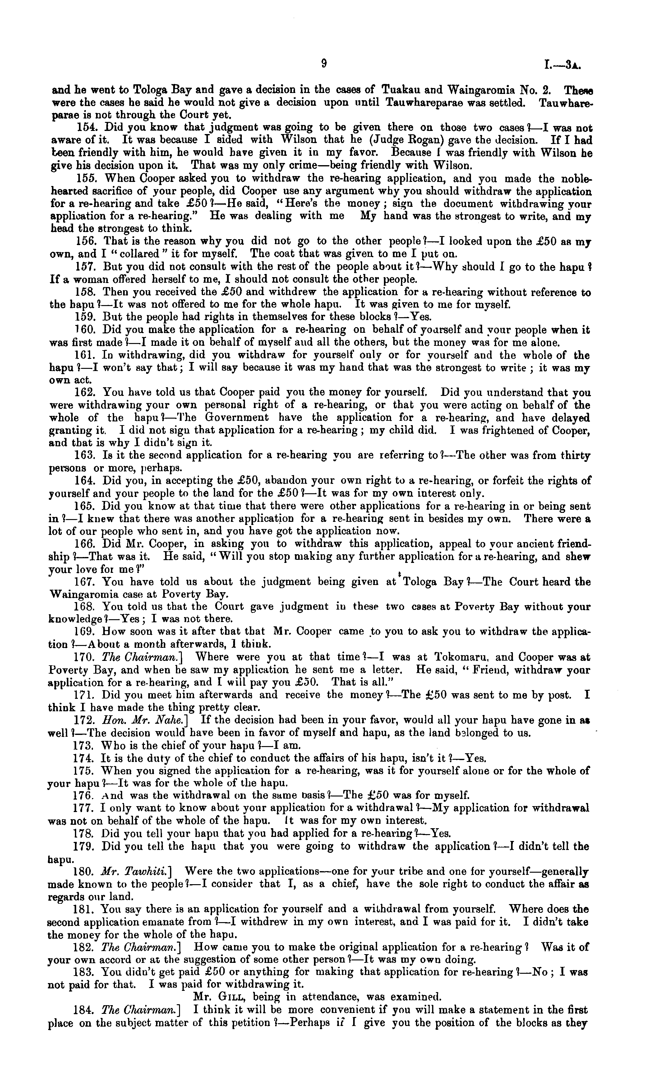 and he went to Tologa Bay and gave a decision in the cases of Tuakau and Waingaromia No. 2. These were the cases he said he would not give a decision upon until Tauwhareparae was settled. Tauwhareparae is not through the Court yet. 154. Did you know that judgment was going to be given there on those two cases?—l was not aware of it. It was because I sided with Wilson that he (Judge Rogan) gave the decision. If I had been friendly with him, he would have given it in my favor. Because I was friendly with Wilson he give his decision upon it. That was my only crime—being friendly with Wilson. 155. When Cooper asked you to withdraw the re-hearing application, and you made the noblehearted sacrifice of your people, did Cooper use any argument why you should withdraw the application for a re-hearing and take £50 ?—He said, " Here's the money ; sign the document withdrawing your application for a re-hearing." He was dealing with me My hand was the strongest to write, and my head the strongest to think. 156. That is the reason why you did not go to the other people?—l looked upon the £50 as my own, and I " collared "it for myself. The coat that was given to me I put on. 157. But you did not consult with the rest of the people about it?— Why should I go to the hapu ? If a woman offered herself to me, I should not consult the other people. 158. Then you received the £50 and withdrew the application for a re-hearing without reference to the hapu ?—lt was not offered to me for the whole hapu. It was given to me for myself. 159. But the people had rights in themselves for these blocks ?—Yes. 160. Did you make the application for a re-hearing on behalf of yourself and your people when it was first made ?—I made it on behalf of myself aud all the others, but the money was for me alone. 161. In withdrawing, did you withdraw for yourself only or for yourself and the whole of the hapu ?—I won't say that; I will say because it was my hand that was the strongest to write ;it was my own act. 162. You have told us that Cooper paid you the money for yourself. Did you understand that you were withdrawing your own personal right of a re-hearing, or that you were acting on behalf of the whole of the hapu?—-The Government have the application for a re-hearing, and have delayed granting it. I did not sign that application for a re-hearing ; my child did. I was frightened of Cooper, and that is why I didn't sign it. 163. Is it the second application for a re-hearing you are referring to?— The other was from thirty persons or more, perhaps. 164. Did you, in accepting the £50, abandon your own right to a re-hearing, or forfeit the rights of yourself and your people to the land for the £50 ?—lt was for my own interest only. 165. Did you know at that time that there were other applications for a re-hearing in or being sent in ?—I knew that there was another application for a re-hearing sent in besides my own. There were a lot of our people who sent in, and you have got the application now. 166. Did Mr. Cooper, in asking you to withdraw this application, appeal to your ancient friendship ?—That was it. He said, " Will you stop making any further application for a re-hearing, and shew your love for me ?" . 167. You have told us about the judgment being given at Tologa Bay?— The Court heard the Waingaromia case at Poverty Bay. 168. You told us that the Court gave judgment iv these two cases at Poverty Bay without your knowledge?— Yes; I was not there. 169. How soon was it after that tbat Mr. Cooper came to you to ask you to withdraw the application ?—About a month afterwards, 1 think. 170. The Chairman?] Where were you at that time?—l was at Tokomaru, and Cooper was at Poverty Bay, and when he saw my application he sent me a letter. He said, " Friend, withdraw your application for a re-hearing, and I will pay you £50. That is all." 171. Did you meet him afterwards and receive the money?— The £50 was sent to me by post. I think I have made the thing pretty clear. 172. Hon. Mr. Nahe.] If the decision had been in your favor, would all your hapu have gone in a* well ?—The decision would have been in favor of myself and hapu, as the land bslonged to us. 173. Who is the chief of your hapu ?—-I am. 174. It is the duty of the chief to conduct the affairs of his hapu, isn't it ?—Yes. 175. When you signed the application for a re-hearing, was it for yourself alone or for the whole of your hapu?—lt was for the whole of the hapu. 176. And was the withdrawal on the same basis?— The £50 was for myself. 177. I only want to know about your application for a withdrawal ?—My application for withdrawal was not on behalf of the whole of the hapu. It was for my own interest. 178. Did you tell your hapu that you had applied for a re-hearing?— Yes. 179. Did you tell the hapu that you were going to withdraw the application ?—I didn't tell the bapu. 180. Mr. Tawhiti.] Were the two applications —one for your tribe and one for yourself —generally made known to the people?—l consider that I, as a chief, have the sole right to conduct the affair as regards our land. 181. You say there is an application for yourself and a withdrawal from yourself. Where does the second application emanate from ?—I withdrew in my own interest, and I was paid for it. I didn't take the money for the whole of the hapu. 182. The Chairman.] How came you to make the original application for a re-hearing? Was it of your own accord or at the suggestion of some other person?—lt was my own doing. 183. You didn't get paid £50 or anything for making that application for re-hearing?—No ; I was not paid for that. I was paid for withdrawing it. Mr. Gill, being in attendance, was examined. 184. The Cliairman.] I think it will be more convenient if you will make a statement in the first place on the subject matter of this petition ?—Perhaps if I give you the position of the blocks as they