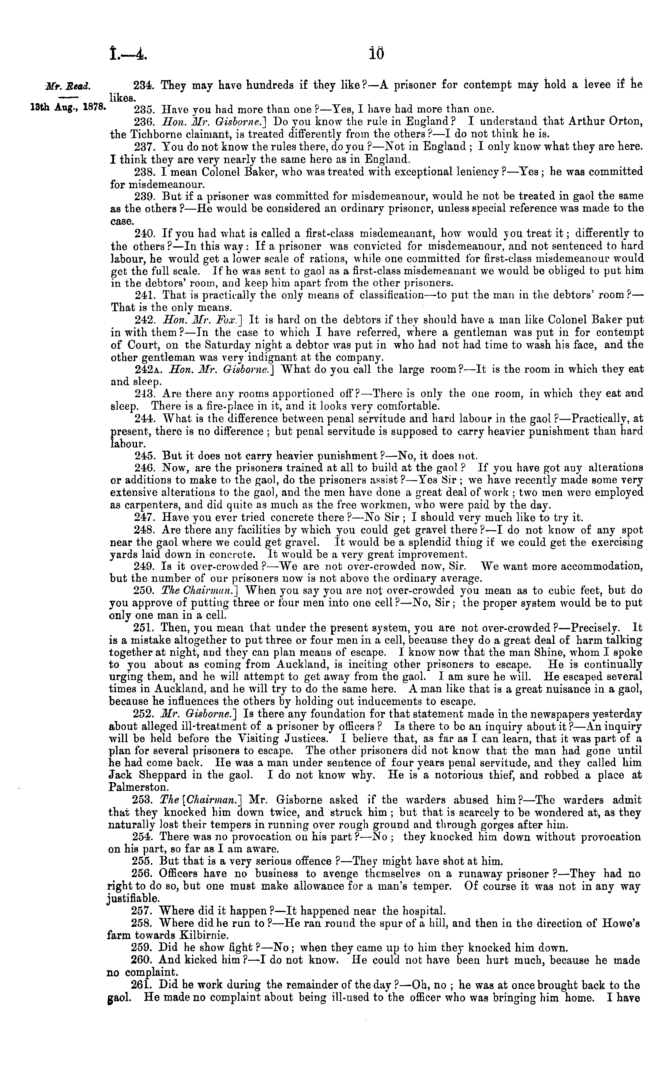 234. They may have hundreds if they like?—A prisoner for contempt may hold a levee if he likes. 235. Have you had more than one ? —Yes, I have had more than one. 236. Hon. Mr. Gisborne.] Do you know the rule in England? I understand that Arthur Orton, the Tichborne claimant, is treated differently from the others ?—I do not think he is. 237. You do not know the rules there, do you ?—Not in England ; I only know what they are here. I think they are very nearly the same here as in England. 238. I mean Colonel Baker, who was treated with exceptional leniency ?—Yes ; he was committed for misdemeanour. 239. But if a prisoner was committed for misdemeanour, would he not be treated in gaol the same as the others ? —He would be considered an ordinary prisoner, unless special reference was made to the case. 240. If you had what is called a first-class misdemeanant, how would you treat it; differently to the others ?—ln this way: If a prisoner was convicted for misdemeanour, and not sentenced to hard labour, he would get a low rer scale of rations, while one committed for first-class misdemeanour would get the full scale. If he was sent to gaol as a first-class misdemeanant we would be obliged to put him iv the debtors' room, and keep him apart from the other prisoners. 241. That is practically the only means of classification —to put the man in the debtors' room? — That is the only means. 242. Hon. Mr. Fox.] It is hard on the debtors if they should have a man like Colonel Baker put in with them ? —ln the case to which I have referred, where a gentleman was put in for contempt of Court, on the Saturday night a debtor was put in who had not had time to wash his face, and the other gentleman was very indignant at the company. 242 a. Hon. Mr. Gisborne.] What do you call the large room? —It is the room in which they eat and sleep. 213. Are there any rooms apportioned off?— There is only the one room, in which they eat and sleep. There is a fire-place in it, and it looks very comfortable. 244. AVhat is the difference between penal servitude and hard labour in the gaol ? —Practically, at present, there is no difference ; but penal servitude is supposed to carry heavier punishment thau hard labour. 245. But it does not carry heavier punishment ?—No, it does not. 246. Now, are the prisoners trained at all to build at the gaol ? If you have got any alterations or additions to make to the gaol, do the prisoners assist? —Yes Sir; we have recently made some very extensive alterations to the gaol, and the men have done a great deal of work ; two men were employed as carpenters, and did quite as much as the free workmen, who were paid by the day. 247. Have you ever tried concrete there ?—No Sir ; I should very much like to try it. 248. Are there any facilities by which you could get gravel there ?—I do not know of any spot near the gaol where we could get gravel. It would be a splendid thing if we could get the exercising yards laid down in concrete. It would be a very great improvement. 249. Is it over-crowded ? —We are not over-crowded now, Sir. AYe want more accommodation, but the number of our prisoners now is not above the ordinary average. 250. The Chairman.] AVhen you say you are not over-crowded jou mean as to cubic feet, but do you approve of putting three or four men into one cell ?—-No, Sir; the proper system would be to put only one man in a cell. 251. Then, you mean that under the present system, you are not over-crowded ?—Precisely. It is a mistake altogether to put three or four men in a cell, because they do a great deal of harm talking together at night, and they can plan meaus of escape. I know now that the man Shine, whom I spoke to you about as coming from Auckland, is inciting other prisoners to escape. He is continually urging them, and he will attempt to get away from the gaol. lam sure he will. He escaped several times in Auckland, and he will try to do the same here. A man like that is a great nuisance in a gaol, because he influences the others by holding out inducements to escape. 252. Mr. Gisborne.] Is there any foundation for that statement made in the newspapers yesterday about alleged ill-treatment of a prisoner by officers ? Is there to bo an inquiry about it ? —An inquiry will be held before the A risiting Justices. I believe that, as far as I can learn, that it was part of a plan for several prisoners to escape. The other prisoners did not know that the man had gone until he had come back. He was a man under sentence of four years penal servitude, and they called him Jack Sheppard in the gaol. Ido not know why. He is a notorious thief, and robbed a place at Palmerston. 253. The [Chairman.] Mr. Gisborne asked if the warders abused him ? —The warders admit that they knocked him down twice, and struck him ; but that is scarcely to be wondered at, as they naturally lost their tempers in running over rough ground and through gorges after him. 254. There was no provocation on his part ?—No ; they knocked him down without provocation on his part, so far as I am aware. 255. But that is a very serious offence ? —They might have shot at him. 256. Officers have no business to avenge themselves on a runaway prisoner ? —They had no right to do so, but one must make allowance for a man's temper. Of course it was uot in any way justifiable. 257. Where did it happen?—lt happened near the hospital. 258. Where did he run to ? —He ran round the spur of a hill, and then iv the direction of Howe's farm towards Kilbirnie. 259. Did he show fight ?—No ; when they came up to him they knocked him down. 260. And kicked him ?—I do not know. He could not have been hurt much, because he made no complaint. 261. Did he work during the remainder of the day ?—Oh, no ;he was at once brought back to the gaol. He made no complaint about being ill-used to the officer who was bringing him home. I have