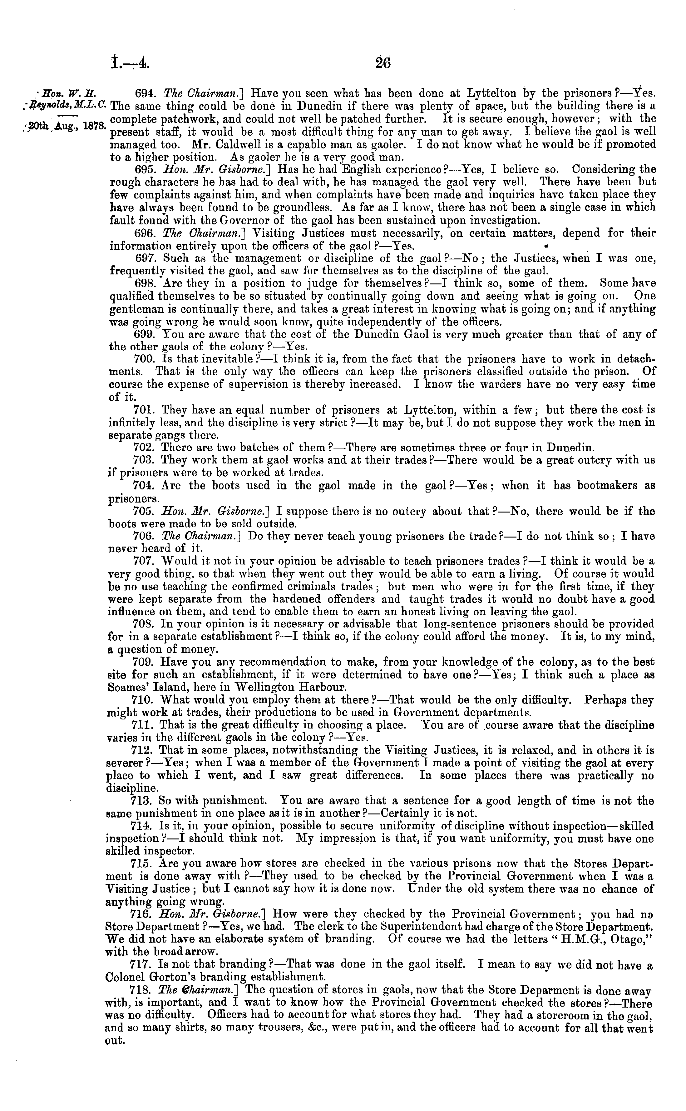 694. The Chairman.] Have you seen what has been done at Lyttelton by the prisoners ?—Yes. * The same thing could be done in Dunedin if there was plenty of space, but the building there is a complete patchwork, and could not well be patched further. It is secure enough, however; with the ' present staff, it would be a most difficult thing for any man to get away. I believe the gaol is well managed too. Mr. Caldwell is a capable man as gaoler. Ido not know what he would be if promoted to a higher position. As gaoler he is a very good man. 695. Hon. Mr. Gisborne.] Has he had English experience? —Yes, I believe so. Considering the rough characters he has had to deal with, he has managed the gaol very well. There have beeu but few complaints against him, and when complaints have been made and inquiries have taken place they have always been found to be groundless. As far as I know, there has not been a single case in which fault found with the Governor of the gaol has been sustained upon investigation. 696. The Chairman.] Visiting Justices must necessarily, on certain matters, depend for their information entirely upon the officers of the gaol ? —Yes. 697. Such as the management or discipline of the gaol ? —No ; the Justices, when I was one, frequently visited the gaol, and saw for themselves as to the discipline of the gaol. 698. Are they in a position to judge for themselves? —I think so, some of them. Some have qualified themselves to be so situated by continually going down and seeing what is going on. One gentleman is continually there, and takes a great interest in knowing what is going on; and if anything was going wrong he would soon know r, quite independently of the officers. 699. You are aware that the cost of the Dunedin Gaol is very much greater than that of any of the other gaols of the colony ? —Yes. 700. Is that inevitable ? —I think it is, from the fact that the prisoners have to work in detachments. That is the only way the officers can keep the prisoners classified outside the prison. Of course the expense of supervision is thereby increased. I know the warders have no very easy time of it. 701. They have an equal number of prisoners at Lyttelton, within a few; but there the cost is infinitely less, and the discipline is very strict ?—lt may be, but I do not suppose they work the men in separate gangs there. 702. There are two batches of them ?—There are sometimes three or four in Dunedin. 703. They work them at gaol works and at their trades?— There would be a great outcry with us if prisoners were to be worked at trades. 704. Are the boots used in the gaol made in the gaol ? —Yes ; when it has bootmakers as prisoners. 705. Hon. Mr. Gisborne.] I suppose there is no outcry about that ? —No, there would be if the boots were made to be sold outside. 706. The Chairman.] Do they never teach young prisoners the trade? —I do not think so ; I have never heard of it. 707. AVould it not in your opinion be advisable to teach prisoners trades ? —I think it would be a very good thing, so that when they went out they would be able to earn a living. Of course it would be no use teaching the confirmed criminals trades ; but men who were in for the first time, if they were kept separate from the hardened offenders and taught trades it would no doubt have a good influence on them, and tend to enable them to earn an honest living on leaving the gaol. 708. In your opinion is it necessary or advisable that long-sentence prisoners should be provided for in a separate establishment ? —I think so, if the colony could afford the money. It is, to my mind, a question of money. 709. Have you any recommendation to make, from your knowledge of the colony, as to the best site for such an establishment, if it were determined to have one? —-Yes; I think such a place as Soames' Island, here in AVellington Harbour. 710. What would you employ them at there ? —That would be the only difficulty. Perhaps they might work at trades, their productions to be used in Government departments. 711. That is the great difficulty in choosing a place. You are of course aware that the discipline varies in the different gaols in the colony ?—Yes. 712. That in some places, notwithstanding the Visiting Justices, it is relaxed, and in others it is severer ? —Yes ; when I was a member of the Government I made a point of visiting the gaol at every place to which I went, and I saw great differences. In some places there was practically no discipline. 713. So with punishment. You are aware that a sentence for a good length of time is not the same punishment in one place as it is in another? —Certainly it is not. 714. Is it, in your opinion, possible to secure uniformity of discipline without inspection —skilled inspection ? —I should think not. My impression is that, if you want uniformity, you must have one skilled inspector. 715. Are you aware how stores are checked in the various prisons now that the Stores Department is done away with ? —They used to be checked by the Provincial Government when I was a Visiting Justice ; but I caunot say how it is done now. Under the old system there was no chance of anything going wrong. 716. Hon. Mr. Gisborne.] How were they checked by the Provincial Government; you had no Store Department ? —Yes, we had. The clerk to the Superintendent had charge of the Store Department. We did not have an elaborate system of branding. Of course we had the letters " H.M.G., Otago," with the broad arrow. 717. Is not that branding? —That was done in the gaol itself. I mean to say we did not have a Colonel Gorton's branding establishment. 718. The Chairman.] The question of stores in gaols, now that the Store Deparmenfc is done away with, is important, and I want to know how the Provincial Government checked the stores ?—There was no difficulty. Officers had to account for what stores they had. They had a storeroom in the gaol, aud so many shirts, so many trou