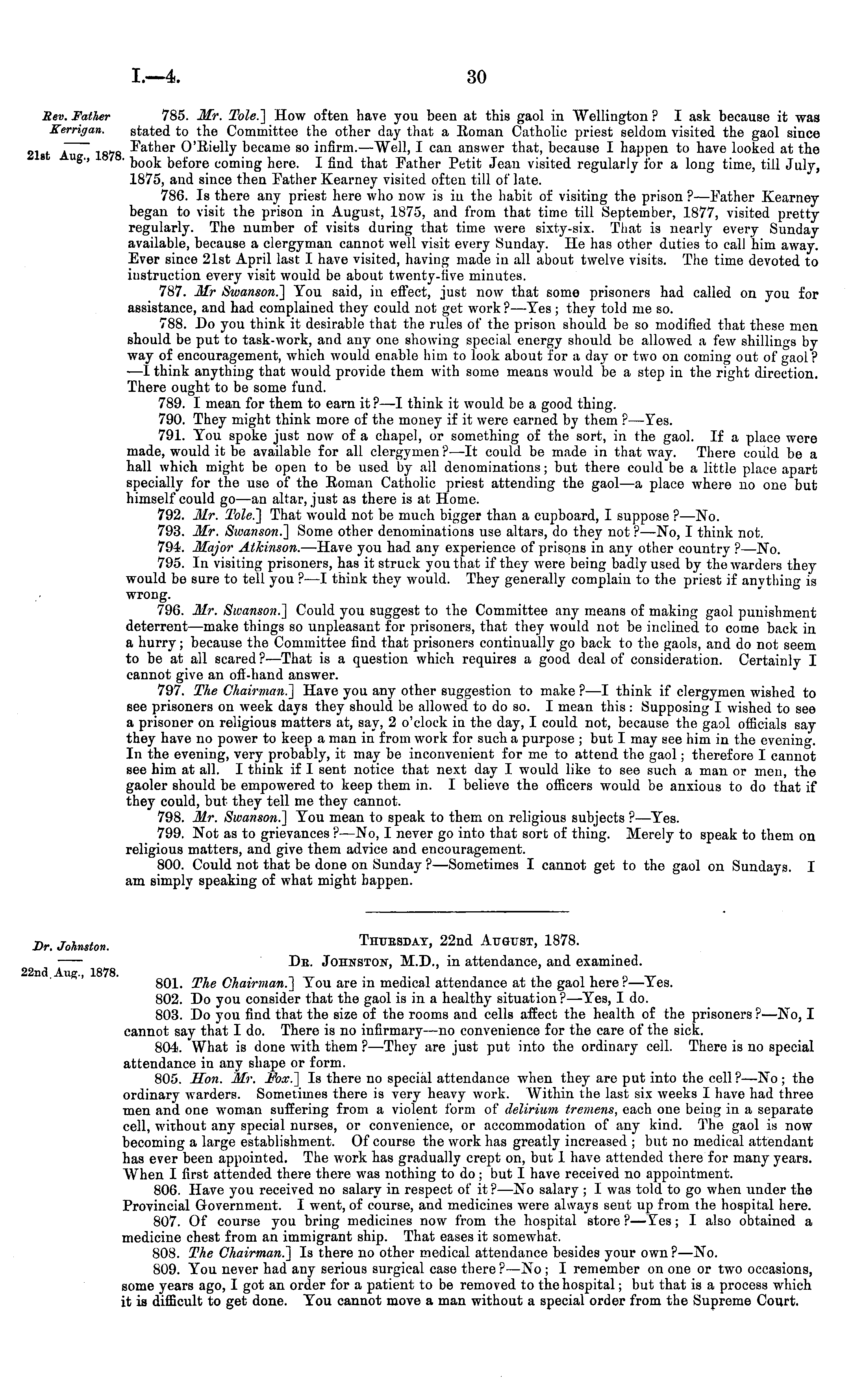 785. Mr. Tole.] How often have you been at this gaol in AVellington ? I ask because it was stated to the Committee the other day that a Roman Catholic priest seldom visited the gaol since Father O'Rielly became so infirm.—AVell, I can answer that, because I happen to have looked at the ' book before coming here. I find that Father Petit Jeau visited regularly for a long time, till July, 1875, and since then Father Kearney visited often till of late. 786. Is there any priest here who now is iv the habit of visiting the prison ? —Father Kearney began to visit the prison in August, 1875, and from that time till September, 1877, visited pretty regularly. The number of visits during that time were sixty-six. That is nearly every Sunday available, because a clergyman cannot well visit every Sunday. He has other duties to call him away. Ever since 21st April last I have visited, having made in all about twelve visits. The time devoted to instruction every visit would be about twenty-five minutes. 787. Mr Swanson.] You said, in effect, just now that some prisoners had called on you for assistance, and had complained they could not get work? —Yes ; they told me so. 788. Do you think it desirable that the rules of the prison should be so modified that these men should be put to task-work, and any one showing special energy should be allowed a few shillings by way of encouragement, which would enable him to look about for a day or two on coming out of gaol? —I think anything that would provide them with some means would be a step in the right direction. There ought to be some fund. 789. I mean for them to earn it?—l think it would be a good thing. 790. They might think more of the money if it were earned by them ?—Yes. 791. You spoke just now of a chapel, or something of the sort, in the gaol. If a place were made, would it be available for all clergymen ? —lt could be made in that way. There could be a hall which might be open to be used by all denominations; but there could be a little place apart specially for the use of the Roman Catholic priest attending the gaol —a place where no one but himself could go —an altar, just as there is at Home. 792. Mr. Tole?] That would not be much bigger than a cupboard, I suppose ? —No. 793. Mr. Swanson.] Some other denominations use altars, do they not ?—No, I think not. 794. Major Atkinson. —Have you had any experience of prisons in any other country ?—No. 795. In visiting prisoners, has it struck you that if they were being badly used by the warders they would be sure to tell you ? —I think they would. They generally complain to the priest if anvthino- is wrong. 796. Mr. Swanson.] Could you suggest to the Committee any means of making gaol punishment deterrent —make things so unpleasant for prisoners, that they would not be inclined to come back in a hurry; because the Committee find that prisoners continually go back to the gaols, and do not seem to be at all scared? —That is a question which requires a good deal of consideration. Certainly I cannot give an off-hand answer. 797. The Chairman.] Have you any other suggestion to make ? —I think if clergymen wished to see prisoners on week days they should be allowed to do so. I mean this : Supposing I wished to see a prisoner on religious matters at, say, 2 o'clock in the day, I could not, because the gaol officials say they have no power to keep a man in from work for such a purpose ; but I may see him in the evening In the evening, very probably, it may be inconvenient for me to attend the gaol; therefore I cannot see him at all. I think if I sent notice that next day I would like to see such a man or men, the gaoler should be empowered to keep them in. I believe the officers would be anxious to do that if they could, but they tell me they cannot. 798. Mr. Swanson.] You mean to speak to them on religious subjects ?—Yes. 799. Not as to grievances ? —No, I never go into that sort of thing. Merely to speak to them on religious matters, and give them advice and encouragement. 800. Could not that be done on Sunday ? —Sometimes I cannot get to the gaol on Sundays. I am simply speaking of what might happen.