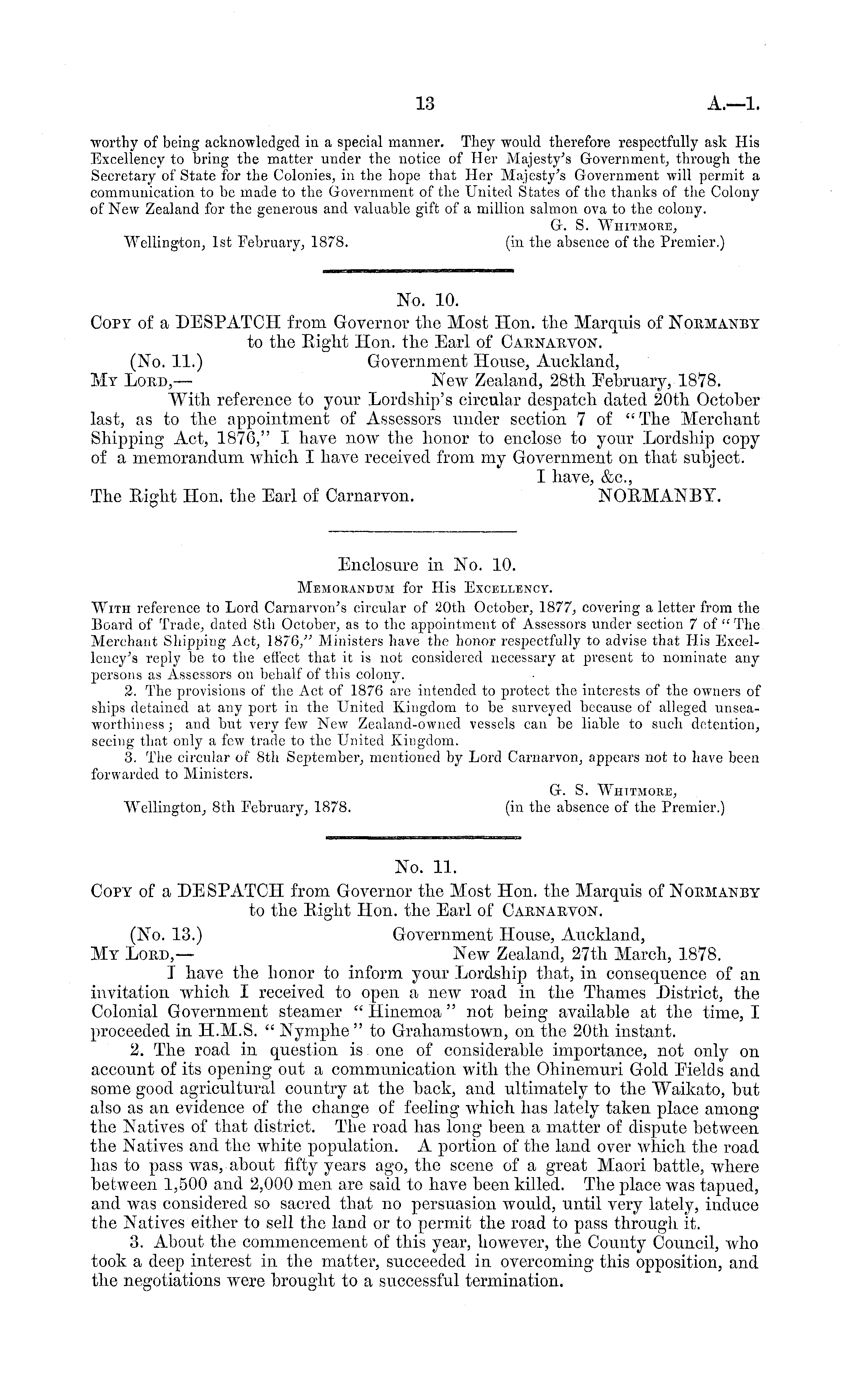 No. 10. Copy of a DESPATCH from Governor the Most Hon. the Marquis of Normanby to the Right Hon. the Earl of Carnarvon. (No. 11.) Government House, Auckland, My Lord,—- New Zealand, 28th Eebruary, 1878. With reference to your Lordship's circular despatch dated 20th October last, as to the appointment of Assessors under section 7 of "The Merchant Shipping Act, 1870," I have now the honor to enclose to your Lordship copy of a memorandum which I have received from my Government on that subject. I have, &c, The Right Hon. the Earl of Carnarvon. NORMANBY.