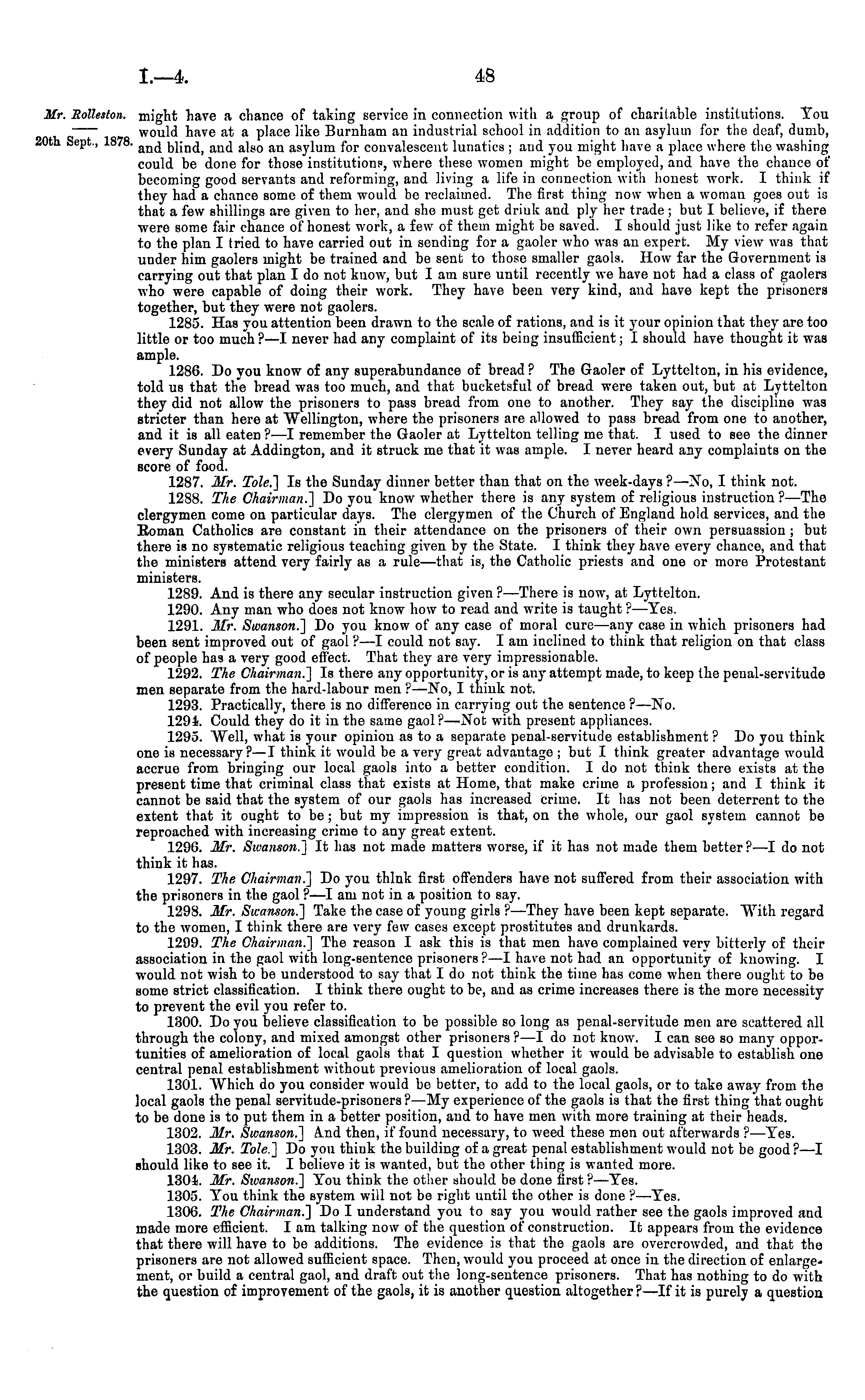 might have a chance of taking service in connection with a group of charitable institutions. You would have at a place like Burnham an industrial school in addition to an asylum for the deaf, dumb, ' and blind, and also an asylum for convalescent lunatics ; and you might have a place where the washing could be done for those institutions, where these women might be employed, and have the chance of becoming good servants and reforming, and living a life in connection with honest work. I think if they had a chance some of them would be reclaimed. The first thing now when a woman goes out is that a few shillings are given to her, and she must get drink and ply her trade; but I believe, if there were some fair chance of honest work, a few of them might be saved. I should just like to refer again to the plan I tried to have carried out in sending for a gaoler who was an expert. My view was that under him gaolers might be trained and be sent to those smaller gaols. How far the Government is carrying out that plan I do not know, but I am sure until recently we have not had a class of gaolers who were capable of doing their work. They have been very kind, and have kept the prisoners together, but they were not gaolers. 1285. Has you attention been drawn to the scale of rations, and is it your opinion that they are too little or too much ?—I never had any complaint of its being insufficient; I should have thought it was ample. 1286. Do you know of any superabundance of bread ? The Gaoler of Lyttelton, in his evidence, told us that the bread was too much, and that bucketsful of bread were taken out, but at Lyttelton they did not allow the prisoners to pass bread from one to another. They say the discipline was stricter than here at Wellington, where the prisoners are allowed to pass bread from one to another, and it is all eaten ?—I remember the Gaoler at Lyttelton telling me that. I used to see the dinner every Sunday at Addington, and it struck me that it was ample. I never heard any complaints on the score of food. 1287. Mr. Tole.] Is the Sunday dinner better thau that on the week-days ? —No, I think not. 1288. The Chairman.] Do you know r whether there is any system of religious instruction ? —The clergymen come on particular days. The clergymen of the Church of England hold services, and the Roman Catholics are constant in their attendance on the prisoners of their own persuassion ; but there is no systematic religious teaching given by the State. I think they have every chance, and that the ministers attend very fairly as a rule—that is, the Catholic priests and one or more Protestant ministers. 1289. And is there any secular instruction given ? —There is now, at Lyttelton. 1290. Any man who does not know how to read and write is taught ? —Yes. 1291. Mr. Swanson.] Do you know of any case of moral cure —any case in which prisoners had been sent improved out of gaol ?—I could not say. lam inclined to think that religion on that class of people has a very good effect. That they are very impressionable. 1292. The Chairman.] Is there any opportunity, or is any attempt made, to keep the penal-servitude men separate from the hard-labour men ?—-No, I think not. 1293. Practically, there is no difference in carrying out the sentence ?—No. 1291. Could they do it in the same gaol?— Not with present appliances. 1295. AVell, what is your opinion as to a separate penal-servitude establishment ? Do you think one is necessary? —I think it would be a very great advantage ; but I think greater advantage would accrue from bringing our local gaols into a better condition. I do not think thero exists at the present time that criminal class that exists at Home, that make crime a profession; and I think it cannot be said that the system of our gaols has increased crime. It has not been deterrent to tho extent that it ought to be; but my impression is that, on the whole, our gaol system cannot be reproached with increasing crime to any great extent. 1290. Mr. Swanson.] It has not made matters worse, if it has not made them better? —I do not think it has. 1297. The Chairman!] Do you think first offenders have not suffered from their association with the prisoners in the gaol ?—I am not in a position to say. 1298. Mr. Swanson.] Take the case of young girls ? —They have been kept separate. With regard to the women, I think there are very few cases except prostitutes and drunkards. 1299. The Chairman.] The reason I ask this is that men have complained very bitterly of their association in the gaol with long-sentence prisoners? —I have not had an opportunity of knowing. I would not wish to be understood to say that I do not think the time has come wdien there ought to be some strict classification. I think there ought to be, and as crime increases there is the more necessity to prevent the evil you refer to. 1300. Do you believe classification to be possible so long as penal-servitude men are scattered all through the colony, and mixed amongst other prisoners? —I do not know. I can see so many opportunities of amelioration of local gaols that I question whether it would be advisable to establish one central penal establishment without previous amelioration of local gaols. 1301. AVhich do you consider would be better, to add to the local gaols, or to take away from the local gaols the penal servitude-prisoners ? —My experience of the gaols is that the first thing that ought to be done is to put them in a better position, and to have men with more training at their heads. 1302. Mr. Swanson.] And then, if found necessary, to weed these men out afterwards ?—Yes. 1303. Mr. Tole.] Do you think the building of a great penal establishment would not be good ? —I should like to see it. I believe it is wanted, but the other thing is wanted more. 1304. Mr. Swanson.] You think the other should bo done first?— Yes. 1305. You think the system will not be right until the other is done ?—Yes.