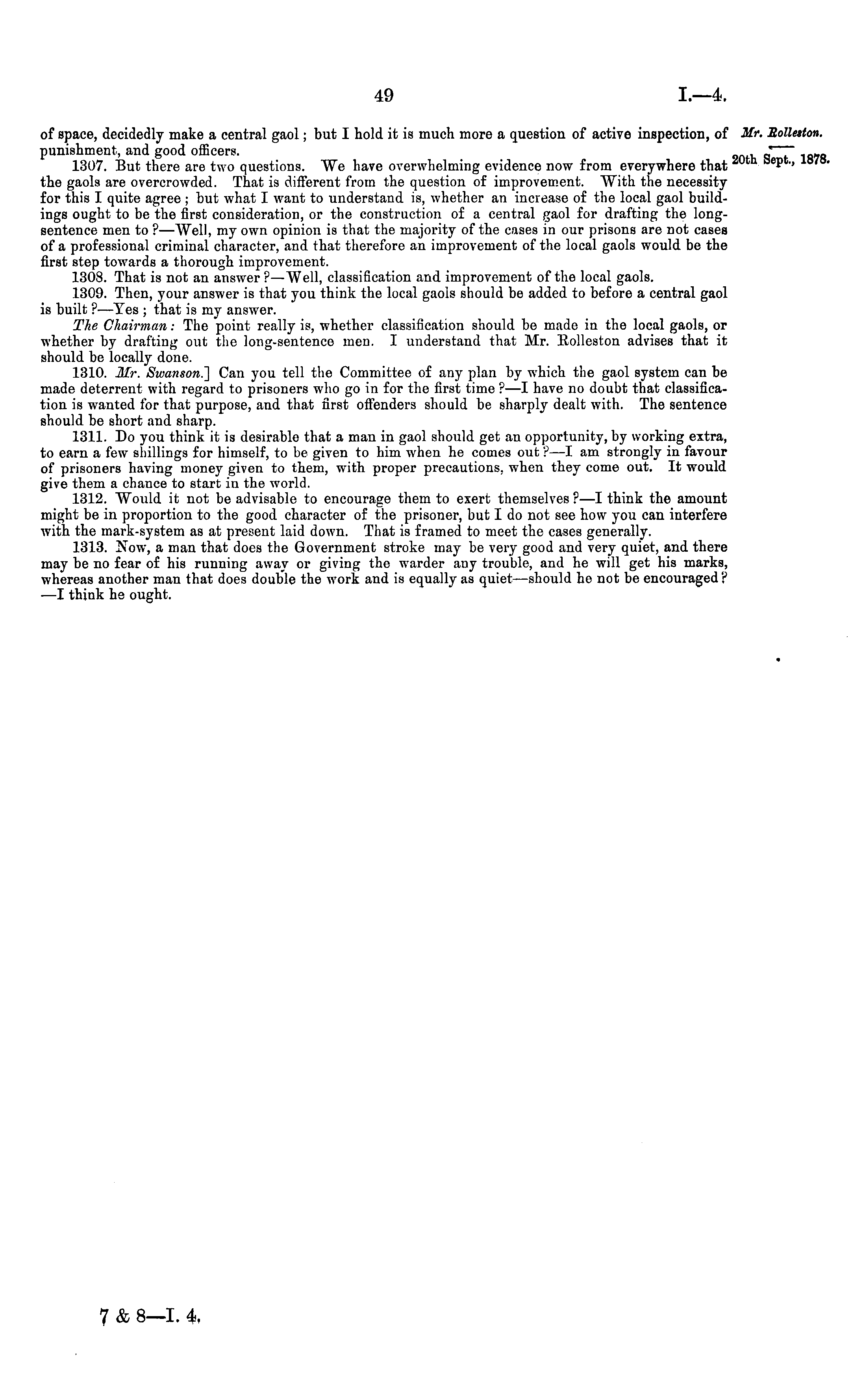 of space, decidedly make a central gaol; but I hold it is much more a question of active inspection, of Mr, punishment, and good officers. 1307. But there are two questions. We have overwhelming evidence now from everywhere that the gaols are overcrowded. That is different from the question of improvement. "With the necessity for this I quite agree ; but what I want to understand is, whether an increase of the local gaol buildings ought to be the first consideration, or the construction of a central gaol for drafting the longsentence men to ?—Well, my own opinion is that the majority of the cases in our prisons are not cases of a professional criminal character, and that therefore an improvement of the local gaols would be the first step towards a thorough improvement. 130 S. That is not an answer?— Well, classification and improvement of the local gaols. 1309. Then, your answer is that you think the local gaols should be added to before a central gaol is built ?—Yes ; that is my answer. The Chairman: The point really is, whether classification should be made in the local gaols, or whether by drafting out the long-sentence men. I understand that Mr. Eolleston advises that it should be locally done. 1310. Mr. Swanson.~\ Can you tell the Committee of any plan by which the gaol system can be made deterrent with regard to prisoners who go in for the first time ? —I have no doubt that classification is wanted for that purpose, and that first offenders should be sharply dealt with. The sentence should be short and sharp. 1311. Do you think it is desirable that a man in gaol should get an opportunity, by working extra, to earn a few shillings for himself, to be given to him when he comes out ?—I am strongly in favour of prisoners having money given to them, with proper precautions, when they come out. It would give them a chance to start in the world. 1312. Would it not be advisable to encourage them to exert themselves ?—I think the amount might be in proportion to the good character of the prisoner, but I do not see how you can interfere with the mark-system as at present laid down. That is framed to meet the cases generally. 1313. Now, a man that does the Government stroke may be very good and very quiet, and there may be no fear of his running away or giving the warder any trouble, and he will get his marks, whereas another man that does double the work and is equally as quiet —should he not be encouraged? —I think he ought.
