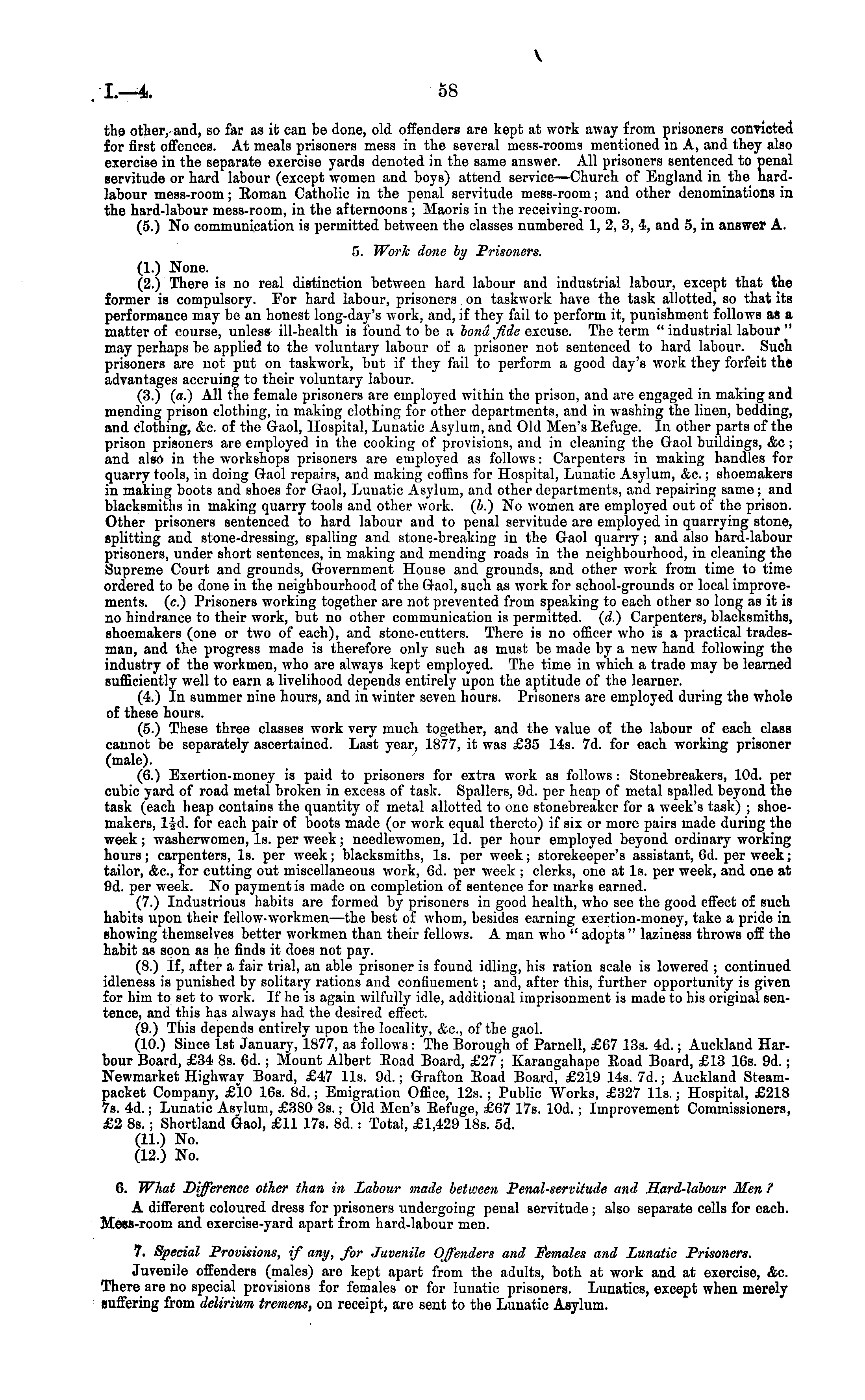 the other, and, so far as it can be done, old offenders are kept at work away from prisoners convicted for first offences. At meals prisoners mess in the several mess-rooms mentioned in A, and they also exercise in the separate exercise yards denoted in the same answer. All prisoners sentenced to penal servitude or hard labour (except women and boys) attend service—Church of England in the hardlabour mess-room; Roman Catholic in the penal servitude mess-room; and other denominations in the hard-labour mess-room, in the afternoons ; Maoris in the receiving-room. (5.) No communication is permitted between the classes numbered 1, 2, 3, 4, and 5, in answer A. 5. Work done by Prisoners. (1.) None. (2.) There is no real distinction between hard labour and industrial labour, except that the former is compulsory. For hard labour, prisoners on taskwork have the task allotted, so that its performance may be an honest long-day's work, and, if they fail to perform it, punishment follows as a matter of course, unless ill-health is found to be a bond fide excuse. The term " industrial labour " may perhaps be applied to the voluntary labour of a prisoner not sentenced to hard labour. Such prisoners are not put on taskwork, but if they fail to perform a good day's work they forfeit the advantages accruing to their voluntary labour. (3.) (a.) All the female prisoners are employed within the prison, and are engaged in making and mending prison clothing, in making clothing for other departments, and in washing the linen, bedding, and clothing, &c. of the Gaol, Hospital, Lunatic Asylum, and Old Men's Refuge. In other parts of the prison prisoners are employed in the cooking of provisions, and in cleaning the Gaol buildings, &c ; and also in the workshops prisoners are employed as follows: Carpenters in making handles for quarry tools, in doing Gaol repairs, and making coffins for Hospital, Lunatic Asylum, &c.; shoemakers in making boots and shoes for Gaol, Lunatic Asylum, and other departments, and repairing same; and blacksmiths in making quarry tools and other work, (b.) No women are employed out of the prison. Other prisoners sentenced to hard labour and to penal servitude are employed in quarrying stone, splitting and stone-dressing, spalling and stone-breaking in the Gaol quarry ; and also hard-labour prisoners, under short sentences, in making and mending roads in the neighbourhood, in cleaning the Supreme Court and grounds, Government House and grounds, and other work from time to time ordered to be done in the neighbourhood of the Gaol, such as work for school-grounds or local improvements, (c.) Prisoners working together are not prevented from speaking to each other so long as it is no hindrance to their work, but no other communication is permitted, (d.) Carpenters, blacksmiths, shoemakers (one or two of each), and stone-cutters. There is no officer who is a practical tradesman, and the progress made is therefore only such as must be made by a new hand following the industry of the workmen, who are always kept employed. The time in which a trade may be learned sufficiently well to earn a livelihood depends entirely upon the aptitude of the learner. (4.) In summer nine hours, and in winter seven hours. Prisoners are employed during the whole of these hours. (5.) These three classes work very much together, and the value of the labour of each class cannot be separately ascertained. Last year, 1877, it was £35 14s. 7d. for each working prisoner (male). (6.) Exertion-money is paid to prisoners for extra work as follows : Stonebreakers, lOd. per cubic yard of road metal broken in excess of task. Spallers, 9d. per heap of metal spalled beyond the task (each heap contains the quantity of metal allotted to one stonebreaker for a week's task) ; shoemakers, lid. for each pair of boots made (or work equal thereto) if six or more pairs made during the week; washerwomen, Is. per week; needlewomen, Id. per hour employed beyond ordinary working hours; carpenters, Is. per week; blacksmiths, Is. per week; storekeeper's assistant, 6d. per week; tailor, &c, for cutting out miscellaneous work, 6d. per week ; clerks, one at Is. per week, and one at 9d. per week. No payment is made on completion of sentence for marks earned. (7.) Industrious habits are formed by prisoners in good health, who see the good effect of such habits upon their fellow-workmen—the best of whom, besides earning exertion-money, take a pride in showing themselves better workmen than their fellows. A man who " adopts" laziness throws off the habit as soon as he finds it does not pay. (8.) If, after a fair trial, an able prisoner is found idling, his ration scale is lowered ; continued idleness is punished by solitary rations and confinement; and, after this, further opportunity is given for him to set to work. If he is again wilfully idle, additional imprisonment is made to his original sentence, and this has always had the desired effect. (9.) This depends entirely upon the locality, &c, of the gaol. (10.) Since Ist January, 1877, as follows: The Borough of Parnell, £67 13s. 4d.; Auckland Harbour Board, £34 Bs. 6d.; Mount Albert Road Board, £27 ; Karangahape Road Board, £13 16s. 9d.; Newmarket Highway Board, £47 lis. 9d.; Grafton Road Board, £219 14s. 7d.; Auckland Steampacket Company, £10 16s. Bd.; Emigration Office, 12s. ; Public Works, £327 lis.; Hospital, £218 7s. 4d.; Lunatic Asylum, £380 35.; Old Men's Refuge, £67 17s. lOd.; Improvement Commissioners, £2 Bs.; Shortland Gaol, £11 17s. Bd.: Total, £1,429 18s. sd. (11.) No. (12.) No. 6. What Difference other than iti Labour made between Penal-servitude and Hard-labour Men ? A different coloured dress for prisoners undergoing penal servitude ; also separate cells for each. Mess-room and exercise-yard apart from hard-labour men. 7. Special Provisions, if any, for Juvenile Offenders and Females and Lunatic Prisoners. Juvenile offenders (males) are kept apart from the adults, bot