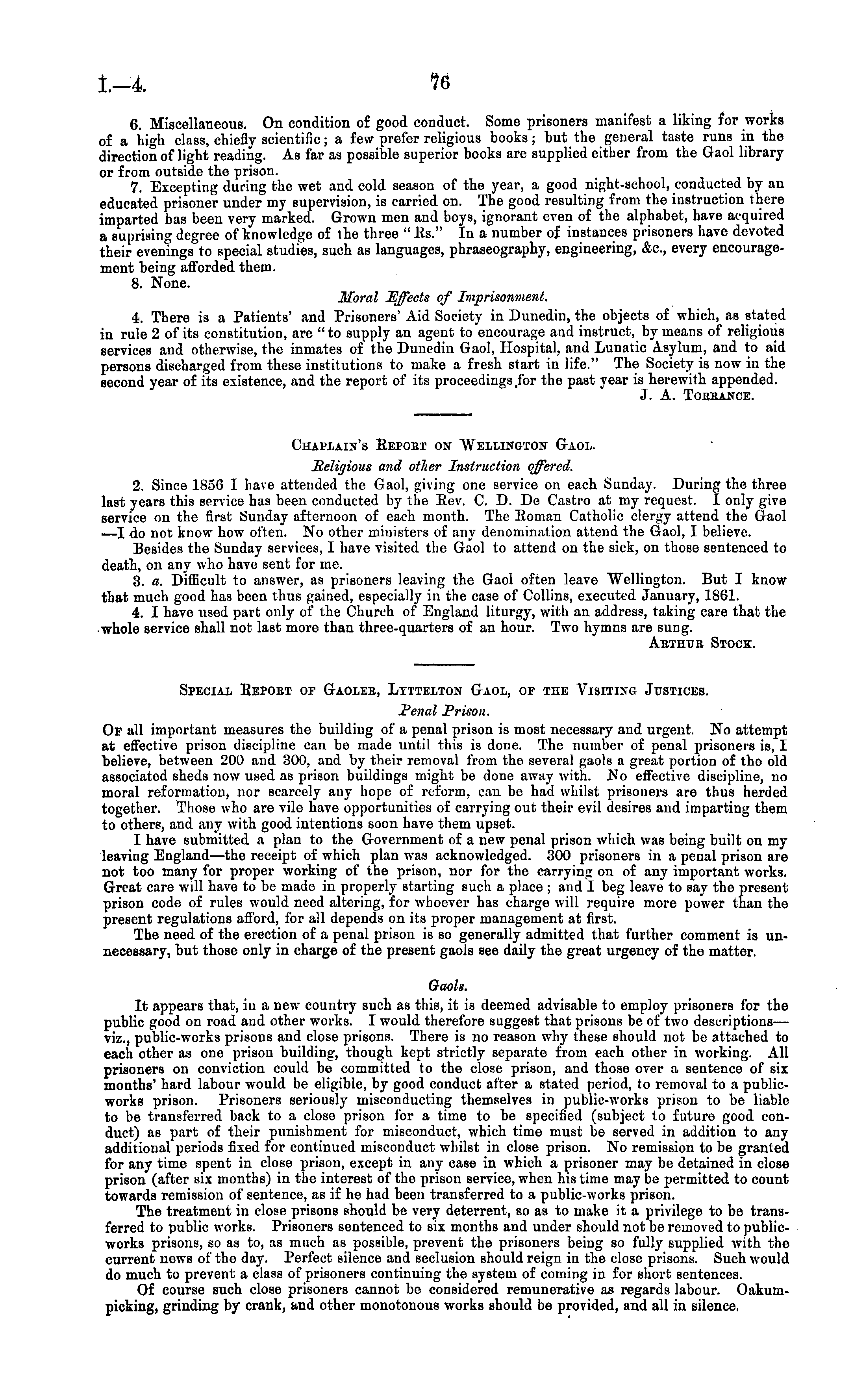 Chaplain's Report on Wellington Gaol. Religious and other Instruction offered. 2. Since 1856 I have attended the Gaol, giving one service on each Sunday. During the three last years this service has been conducted by the Rev. C. D. De Castro at my request. I only give service on the first Sunday afternoon of each month. The Roman Catholic clergy attend the Gaol —I do not know how often. No other ministers of any denomination attend the Gaol, I believe. Besides the Sunday services, I have visited the Gaol to attend on the sick, on those sentenced to death, on any who have sent for me. 3. a. Difficult to answer, as prisoners leaving the Gaol often leave Wellington. But I know that much good has been thus gained, especially in the case of Collins, executed January, 1861. 4. I have used part only of the Church of England liturgy, with an address, taking care that the whole service shall not last more than three-quarters of an hour. Two hymns are sung. Arthur Stock.