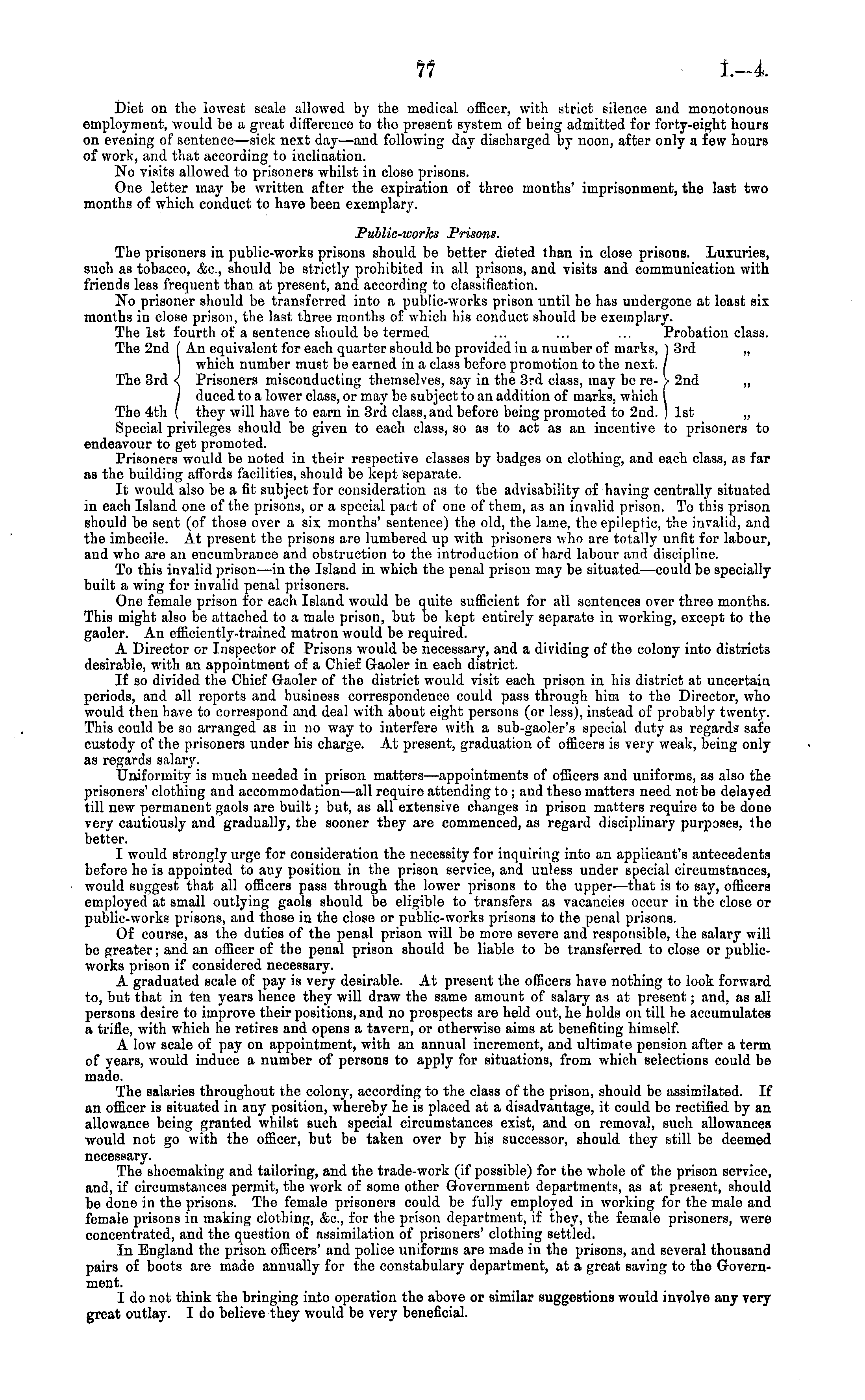 Diet on the lowest scale allowed by the medical officer, with strict silence and monotonous employment, would be a great difference to the present system of being admitted for forty-eight hours on evening of sentence—sick next day—and following day discharged by noon, after only a few hours of work, and that according to inclination. No visits allowed to prisoners whilst in close prisons. One letter may be written after the expiration of three months' imprisonment, the last two months of which conduct to have been exemplary. Public-works Prisons. The prisoners in public-works prisons should be better dieted than in close prisons. Luxuries, such as tobacco, &c, should be strictly prohibited in all prisons, and visits and communication with friends less frequent than at present, and according to classification. No prisoner should be transferred into a public-works prison until he has undergone at least six months in close prison, the last three months of which his conduct should be exemplary. The Ist fourth of a sentence should be termed ... ... ... Probation class. The 2nd I An equivalent for each quarter should be provided in a number of marks, ] 3rd „ ] which number must be earned in a class before promotion to the next. / The 3rd < Prisoners misconducting themselves, say in the 3rd class, may be re- V 2nd „ J duced to a lower class, or may be subject to an addition of marks, which I The 4th ( they will have to earn in 3rd class, and before being promoted to 2nd. ) Ist „ Special privileges should be given to each class, so as to act as an incentive to prisoners to endeavour to get promoted. Prisoners would be noted in their respective classes by badges on clothing, and each class, as far as the building affords facilities, should be kept separate. It would also be a fit subject for consideration as to the advisability of having centrally situated in each Island one of the prisons, or a special part of one of them, as an invalid prison. To this prison should be sent (of those over a six months' sentence) the old, the lame, the epileptic, the invalid, and the imbecile. At present the prisons are lumbered up with prisoners who are totally unfit for labour, and who are an encumbrance and obstruction to the introduction of hard labour and discipline. To this invalid prison—in the Island in which the penal prison may be situated —could be specially built a wing for invalid penal prisoners. One female prison for each Island would be quite sufficient for all sentences over three months. This might also be attached to a male prison, but be kept entirely separate iv working, except to the gaoler. An efficiently-trained matron would be required. A Director or Inspector of Prisons would be necessary, and a dividing of the colony into districts desirable, with an appointment of a Chief Gaoler in each district. If so divided the Chief Gaoler of the district would visit each prison in his district at uncertain periods, and all reports and business correspondence could pass through him to the Director, who would then have to correspond and deal with about eight persons (or less), instead of probably twenty. This could be so arranged as in no way to interfere with a sub-gaoler's special duty as regards safe custody of the prisoners under his charge. At present, graduation of officers is very weak, being only as regards salar3 r. Uniformity is much needed in prison matters —appointments of officers and uniforms, as also the prisoners' clothing and accommodation —all require attending to ; and these matters need not be delayed till new permanent gaols are built; but, as all extensive changes in prison matters require to be done very cautiously and gradually, the sooner they are commenced, as regard disciplinary purposes, the better. I would strongly urge for consideration the necessity for inquiring into an applicant's antecedents before he is appointed to any position in the prison service, and unless under special circumstances, would suggest that all officers pass through the lower prisons to the upper —that is to say, officers employed at small outlying gaols should be eligible to transfers as vacancies occur iv the close or public-works prisons, and those in the close or public-works prisons to the penal prisons. Of course, as the duties of the penal prison will be more severe and responsible, the salary will be greater; and an officer of the penal prison should be liable to be transferred to close or publicworks prison if considered necessary. A graduated scale of pay is very desirable. At present the officers have nothing to look forward to, but that in ten years hence they will draw the same amount of salary as at present; and, as all persons desire to improve their positions, and no prospects are held out, he holds on till he accumulates a trifle, with which he retires and opens a tavern, or otherwise aims at benefiting himself. A low scale of pay on appointment, with an annual increment, and ultimate pension after a term of years, would induce a number of persons to apply for situations, from which selections could be made. The salaries throughout the colony, according to the class of the prison, should be assimilated. If an officer is situated in any position, whereby he is placed at a disadvantage, it could be rectified by an allowance being granted whilst such special circumstances exist, and on removal, such allowances would not go with the officer, but be taken over by his successor, should they still be deemed necessary. The shoemaking and tailoring, and the trade-work (if possible) for the whole of the prison service, and, if circumstances permit, the work of some other Government departments, as at present, should be done in the prisons. The female prisoners could be fully employed in working for the male and female prisons in making clothing, &c, for the prison department, if they, the female prisoners, were concentrated, and the question of assimilation of prisoners
