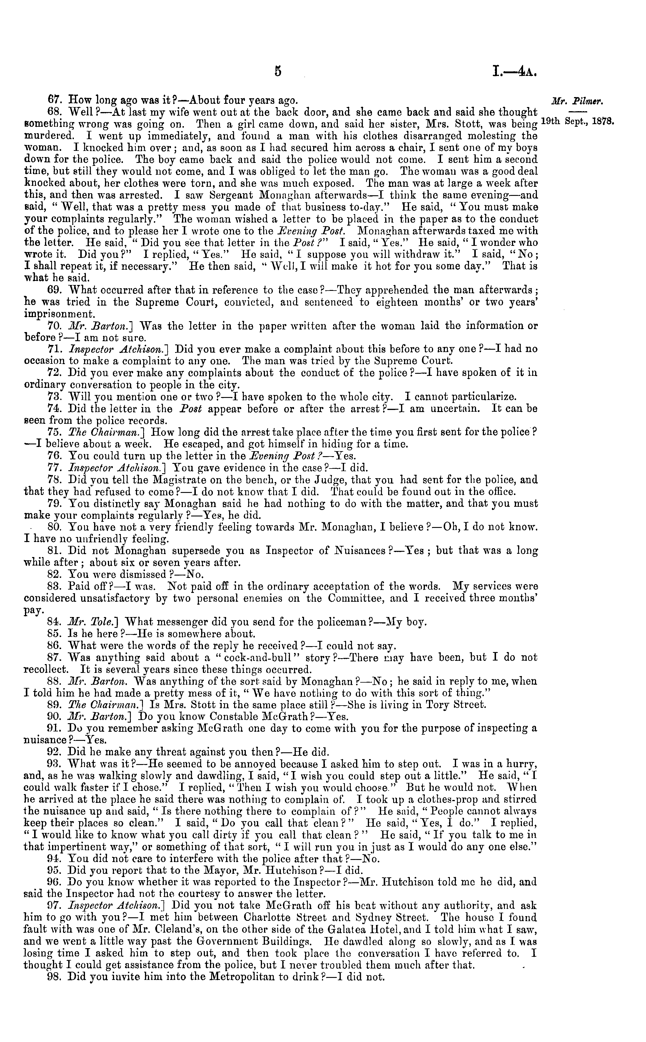 67. How long ago was it?— About four years ago. 68. Well ?—At last my wife went out at the back door, and she came back and said she thought something wrong was going on. Then a girl came down, and said her sister, Mrs. Stott, was being murdered. I went up immediately, and found a man with his clothes disarranged molesting the woman. I knocked him over ; and, as soon as I had secured him across a chair, I sent one of my boys down for the police. The boy came back and said the police would not come. I sent him a second time, but still they would not come, and I was obliged to let the man go. The woman was a good deal knocked about, her clothes were torn, and she was much exposed. The man was at large a week after this, and then was arrested. I saw Sergeant Monaghan afterwards—l think the same evening—and said, " Well, that was a pretty mess you made of that business to-day." He said, " Tou must make your complaints regularly." The woman wished a letter to be placed in the paper as to the conduct of the police, and to please her 1 wrote one to the Evening Post. Monaghan afterwards taxed me with the letter. He said, " Did you see that letter in the Post ?" I said, " Tes." He said, " I wonder who wrote it. Did you?" I replied, " Tes." He said, "I suppose you will withdraw it." I said, "No; I shall repeat it, if necessary." He then said, " Well, I will make it hot for you some day." That is what he said. 69. What occurred after that in reference to the case ? —They apprehended the man afterwards ; he was tried in the Supreme Court, convicted, and sentenced to eighteen months' or two years' imprisonment. 70. Mr. Barton] Was the letter in the paper written after the woman laid tho information or before ?—I am not sure. 71. Inspector Atchison] Did you ever make a complaint about this before to any one ?—I had no occasion to make a complaint to any one. The man was tried by the Supreme Court. 72. Did you ever make any complaints about the conduct of the police ? —I have spoken of it in ordinary conversation to people in the city. 73. Will you mention one or two ?—I have spoken to the whole city. I cannot particularize. 74. Did the letter in tire Post appear before or after the arrest ? —I am uncertain. It can be seen from the police records. 75. The Chairman] How long did the arrest take place after the time you first sent for the police ? —I believe about a week. He escaped, and got himself in hiding for a time. 76. Tou could turn up the letter in the Evening Post ? —Tes. 77. Inspector Atchison] Tou gave evidence in the case? —I did. 78. Did you tell the Magistrate on the bench, or the Judge, that you had sent for the police, and that they had refused to come? —I do not know that I did. That could be found out in the office. 79. Tou distinctly say Monaghan said he had nothing to do with the matter, and that you must make your complaints regularly ? —Tes, he did. SO. Tou have not a very friendly feeling towards Mr. Monaghan, I believe ? —Oh, I do not know. I have no unfriendly feeling. 81. Did not Monaghan supersede you as Inspector of Nuisances ?—Tes ; but that was a long while after; about six or seven years after. 82. Tou were dismissed ? —No. 83. Paid off? —I was. Not paid off in the ordinary acceptation of the words. My services were considered unsatisfactory by two personal enemies on the Committee, and I received three months' pay. 84. Mr. Tole] What messenger did you send for the policeman ?—My boy. 85. Is he here ? —He is somewhere about. 86. What were the words of the reply he received ?—I could not say. 87. Was anything said about a "cock-and-bull" story? —There may have been, but I do not recollect. It is several years since these things occurred. 88. Mr. Barton. Was anything of the sort said by Monaghan ? —No ; he said in reply to me, when I told him he had made a pretty mess of it, " We have nothing to do with this sort of thing." 89. The Chairman] Is Mrs. Stott in the same place still ?—She is living in Tory Street. 90. Mr. Barton] Do you know Constable McGrath?—Tes. 91. Do you remember asking McGrath one day to come with you for the purpose of inspecting a nuisance ? —Tes. 92. Did he make any threat against you then? —He did. 93. What was it ?—He seemed to be annoyed because I asked him to step out. I was in a hurry, and, as he was walking slowly and dawdling, I said, "I wish you could step out a little." He said, " I could walk faster if I chose." I replied, " Their I wish you would choose." But he would not. When he arrived at the place he said there was nothing to complain of. I took up a clothes-prop and stirred the nuisance up and said, "Is there nothing there to complain of?" He said, " People cannot always keep their places so clean." I said, "Do you call that clean?" Ho said, "Tes, I do." I replied, " I would like to know what you call dirty if you call that clean ? " He said, "If you talk to me in that impertinent way," or something of that sort, " I will run you in just as I would do any one else." 94. Tou did not care to interfere with the police after that ? —No. 95. Did you report that to the Mayor, Mr. Hutchison?—l did. 96. Do you know whether it was reported to the Inspector ? —Mr. Hutchison told me he did, and said the Inspector had not the courtesy to answer the letter. 97. Inspector Atchison] Did you not take McGrath off his beat without any authority, and ask him to go with you? —I met him between Charlotte Street and Sydney Street. The house I found fault with was one of Mr. Cleland's, on the other side of the Galatea Hotel, and I told him what I saw, and we went a little way past the Government Buildings. He dawdled along so slowly, and as I was losing time I asked him to step out, and then took place the conversation I have referred to. I thought I could get assistance from the police, but I never troubled them much after tlrat. 98. Did you invite him into the Metropolitan to drink ? —I did n