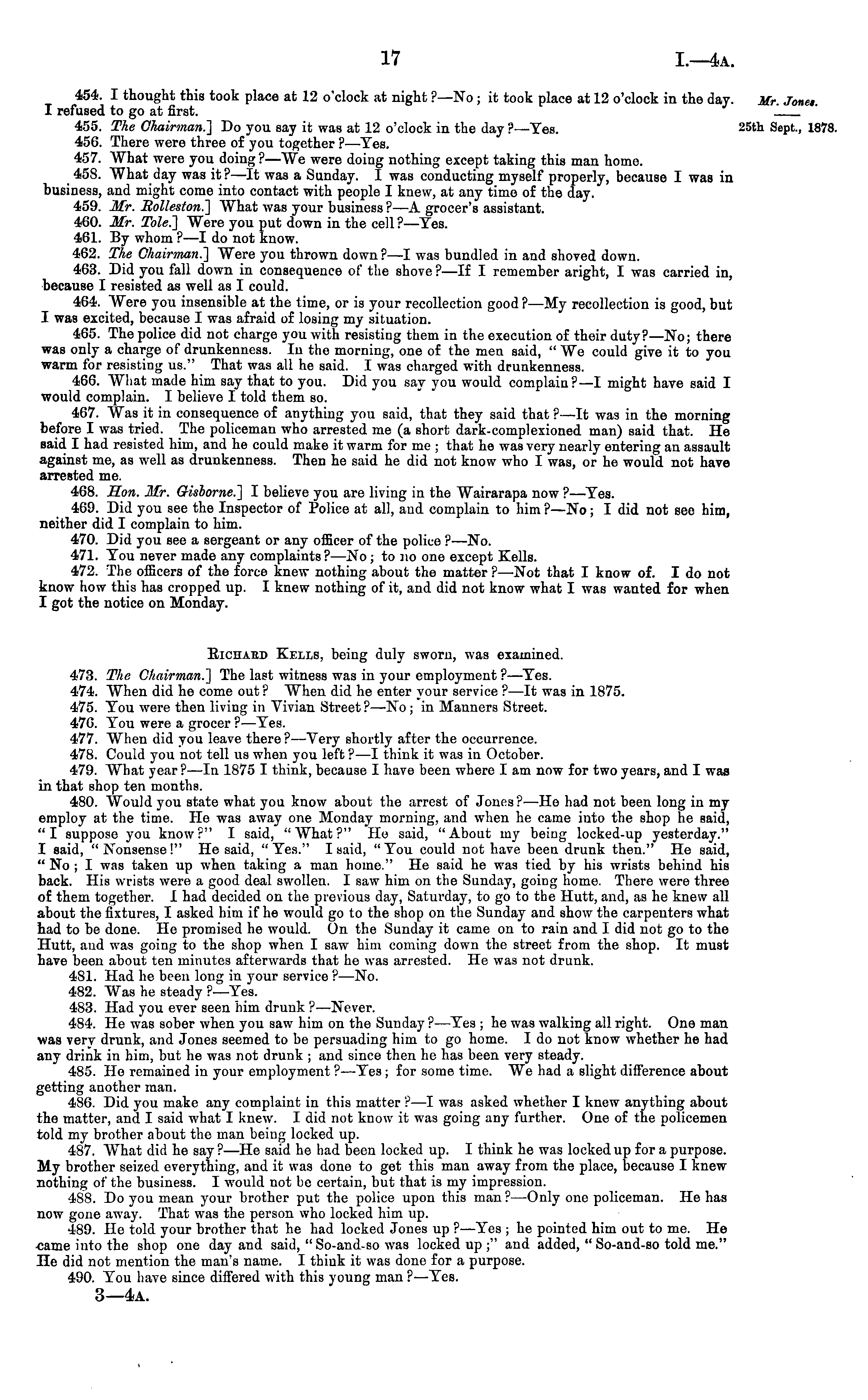 454. I thought this took place at 12 o'clock at night ?—No ;it took place at 12 o'clock in the day. I refused to go at first. 455. The Chairman] Do you say it was at 12 o'clock in the day ?—Tes. 456. There were three of you together ? —Tes. 457. AVhat were you doing ?—AVe were doing nothing except taking this man home. 458. What day was it?—lt was a Sunday. I was conducting myself properly, because I was in business, and might come into contact with people I knew, at any time of the day. 459. Mr. Rolleston] What was your business ? —A grocer's assistant. 460. Mr. Tole] Were you put down in the cell ?—Tes. 461. By whom ?—I do not know. 462. The Chairman] Were you thrown down ?—I was bundled in and shoved down. 463. Did you fall down in consequence of the shove ?—lf I remember aright, I was carried in, because I resisted as well as I could. 464. AVere you insensible at the time, or is your recollection good ? —My recollection is good, but I was excited, because I was afraid of losing my situation. 465. The police did not charge you with resisting them in the execution of their duty? —No; there was only a charge of drunkenness. In the morning, one of the men said, "We could give it to you warm for resisting us." That was all he said. I was charged with drunkenness. 466. What made him say that to you. Did you say you would complain?—l might have said I would complain. I believe I told them so. 467. Was it in consequence of anything you said, that they said that ? —lt was in the morning before I was tried. The policeman who arrested me (a short dark-complexioned man) said that. He said I had resisted him, and he could make it warm for me ; that he was very nearly entering an assault against me, as well as drunkenness. Then he said he did not know who I was, or he would not have arrested me. 4GB. Hon. Mr. Gisborne] I believe you are living in the AVairarapa now ? —Tes. 469. Did you see the Inspector of Police at all, aud complain to him ?—No; I did not see him, neither did I complain to him. 470. Did you see a sergeant or any officer of the police ? —No. 471. Tou never made any complaints?—No ; to no one except Kells. 472. The officers of the force knew nothing about the matter ?—Not that I know of. Ido not know how this has cropped up. I knew nothing of it, and did not know what I was wanted for when I got the notice on Monday. Richaed Kells, being duly sworn, was examined. 473. The Chairman] The last witness was in your employment ?—Tes. 474. AVhen did he come out? When did he enter your service ?—lt was in 1875. 475. Tou were then living in A 7ivian Street? —No; in Manners Street. 476. Tou were a grocer ?—Tes. 477. When did you leave there ? —Very shortly after the occurrence. 478. Could you not tell us when you left ? —I think it was in October. 479. What year ? —ln 1875 I think, because I have been where I am now for two years, and I was in that shop ten months. 450. AVould you state what you know about the arrest of Jones?—He had not been long in my employ at the time. He was away one Monday morning, and when he came into the shop he said, "I suppose you know?" I said, "AVhat?" He said, "About my being locked-up yesterday." I said, "Nonsense!" He said, "Tes." I said, "Tou could not have been drunk then." He said, "No ; I was taken up when taking a man home." He said he was tied by his wrists behind his back. His wrists were a good deal swollen. I saw him on the Sunday, going home. There were three of them together. I had decided on the previous day, Saturday, to go to the Hutt, and, as he knew all about the fixtures, I asked him if he would go to the shop on the Sunday and show the carpenters what had to be done. He promised he would. On the Sunday it came on to rain and I did not go to the Hutt, and was going to the shop when I saw him coming down the street from the shop. It must have been about ten minutes afterwards that he was arrested. He was not drunk. 451. Had he been long in your service ?—No. 482. Was he steady ?—Tes. 483. Had you ever seen him drunk ? —Never. 484. He was sober when you saw him on the Sunday ?—Tes ; he was walking all right. One man was very drunk, and Jones seemed to be persuading him to go home. Ido not know whether he had any drink in him, but he was not drunk ; and since then he has been very steady. 485. He remained in your employment ?—Tes ; for some time. We had a slight difference about getting another man. 486. Did you make any complaint in this matter ? —I was asked whether I knew anything about the matter, and I said what I knew. I did not know it was going any further. One of the policemen told my brother about the man being locked up. 487. W That did he say ?—He said he had been locked up. I think he was locked up for a purpose. My brother seized everything, and it was done to get this man away from the place, because I knew nothing of the business. I would not be certain, but that is my impression. 488. Do you mean your brother put the police upon this man? —Only one policeman. He has now gone away. That was the person who locked him up. 489. He told your brother that he had locked Jones up ?—Tes ; he pointed him out to me. He Dame into the shop one day and said, " So-and-so was locked up ;" and added, " So-and-so told me." He did not mention the man's name. I think it was done for a purpose. 490. Tou have since differed with this young man ? —Tes. 3—4 a.