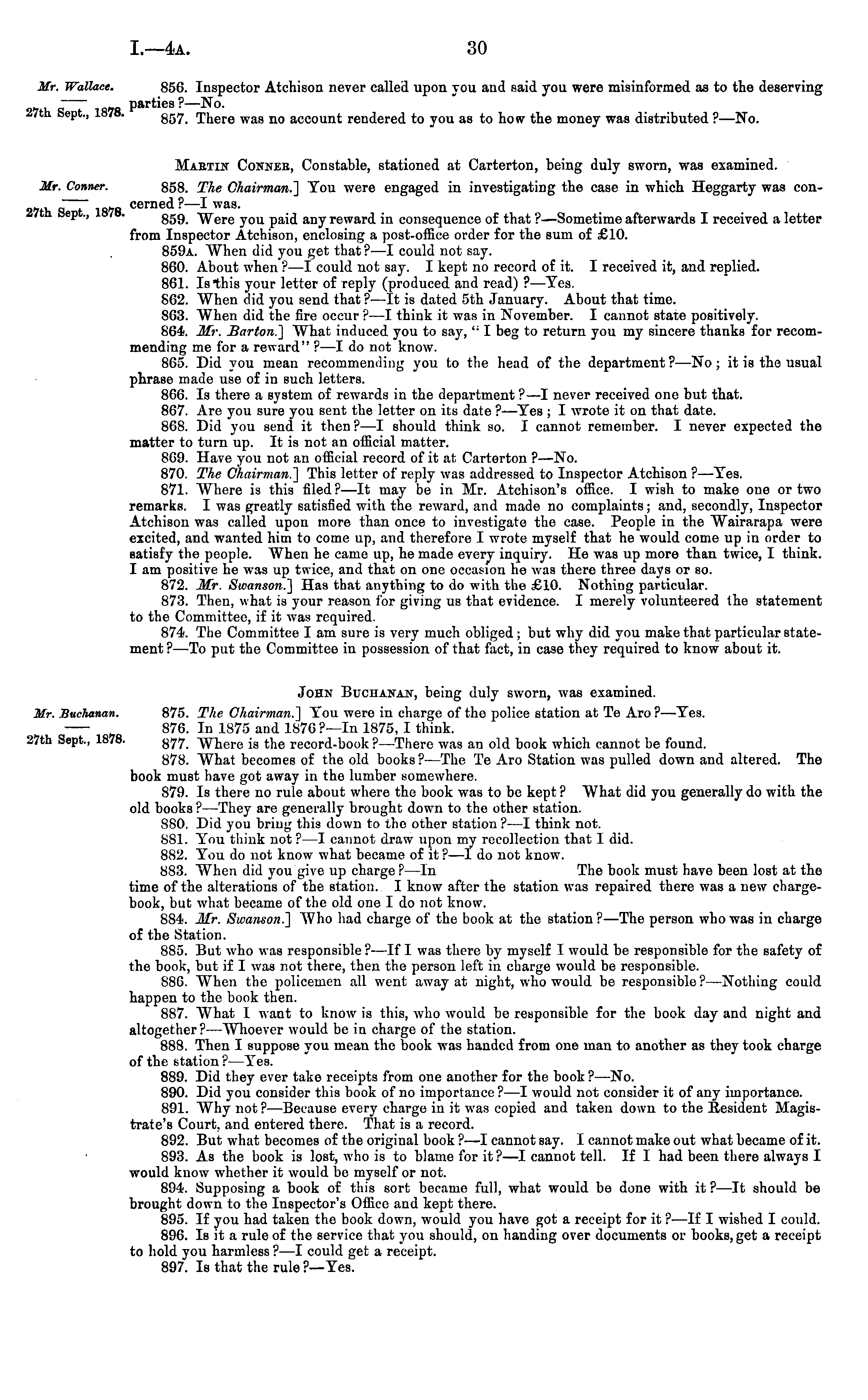 856. Inspector Atchison never called upon you and said you were misinformed as to the deserving parties ? —No. 857. There was no account rendered to you as to hotv the money was distributed ? —No. Mabtin Connee, Constable, stationed at Carterton, being duly sworn, was examined. 858. The Chairman] Tou were engaged in investigating the case in which Heggarty was concerned ? —I was. 859. Were you paid any reward in consequence of that ?—Sometime afterwards I received a letter from Inspector Atchison, enclosing a post-office order for the sum of £10. 859 a. AVhen did you get that?- —I could not say. 860. About when ? —I could not say. I kept no record of it. I received it, and replied. 861. Is this your letter of reply (produced and read) ?—Tes. 862. AVhen did you send that ? —lt is dated sth January. About that time. 563. When did the fire occur ? —I think it was in November. I cannot state positively. 864. Mr. Barton] What induced you to say, <: I beg to return you my sincere thanks for recommending me for a reward" ?•—I do not know. 865. Did you mean recommending you to the head of the department ?—No ; it is tho usual phrase made use of in such letters. 866. Is there a system of rewards in the department ? —I never received one but that. 867. Are you sure you sent the letter on its date ?—Tes ; I wrote it on that date. 868. Did you send it then? —I should think so. I cannot remember. I never expected the matter to turn up. It is not an official matter. 869. Have you not an official record of it at Carterton ? —No. 870. The Chairman] This letter of reply was addressed to Inspector Atchison ?—Tes. 871. AVhere is this filed?—lt may be in Mr. Atchison's office. I wish to make one or two remarks. I was greatly satisfied with the reward, and made no complaints; and, secondly, Inspector Atchison was called upon more than once to investigate the case. People in the Wairarapa were excited, and wanted him to come up, and therefore I wrote myself that he would come up in order to satisfy the people. AVhen he came up, he made every inquiry. He was up more than twice, I think. I am positive he was up twice, and that on one occasion he was there three days or so. 872. Mr. Swanson] Has that anything to do with the £10. Nothing particular. 873. Then, what is your reason for giving us that evidence. I merely volunteered the statement to the Committee, if it was required. 874. The Committee I am sure is very much obliged; but why did you make that particular statement?—To put the Committee in possession of that fact, in case they required to know about it. John Buchanan, being duly sworn, was examined. 875. The Chairman] Tou were in charge of the police station at Te Aro ?—Tes. 876. In 1875 and 1876?—1n 1875, I think. 877. AVhere is the record-book? —There was an old book which cannot be found. 878. What becomes of the old books ? —The Te Aro Station was pulled down and altered. The book must have got away in the lumber somewhere. 579. Is there no rule about where the book was to be kept ? What did you generally do with the old books ? —They are generally brought down to the other station. 880. Did you bring this down to the other station ? —I think not. 881. Tou think not ? —I cannot draw upon my recollection that I did. 882. Tou do not know what became of it ?—I do not know. 883. When did you give up charge ?—ln The book must have been lost at the time of the alterations of the station. I know after the station was repaired there was a new chargebook, but what became of the old one I do not know. 884. Mr. Swanson] AVho had charge of the book at the station ? —The person who was in charge of the Station. BSS. But who was responsible ?—lf 1 was there by myself I would be responsible for the safety of the book, but if I was not there, then the person left in charge would be responsible. SB6. AVhen the policemen all went away at night, who would be responsible? —Nothing could happen to the book then. 887. What 1 want to know is this, who would be responsible for the book day and night and altogether? —AVhoever would be in charge of the station. 888. Then I suppose you mean the book was handed from one man to another as they took charge of the station ? —Tes. 889. Did they ever take receipts from one another for the book? —No. 890. Did you consider this book of no importance ?—I would not consider it of any importance. 891. AVhy not ? —Because every charge in it was copied and taken down to the Resident Magistrate's Court, and entered there. That is a record. 892. But what becomes of the original book ?—I cannot say. I cannot make out what became of it. 893. As the book is lost, who is to blame for it ?—I cannot tell. If I had been there always I would know whether it would be myself or not. 894. Supposing a book of this sort became full, what would be done with it ?—lt should be brought down to the Inspector's Office and kept there. 895. If you had taken the book down, would you have got a receipt for it ? —lf I wished I could. 896. Is it a rule of the service that you should, on handing over documents or books, get a receipt to hold you harmless ? —I could get a receipt. 897. Is that the rule ?—Tes.