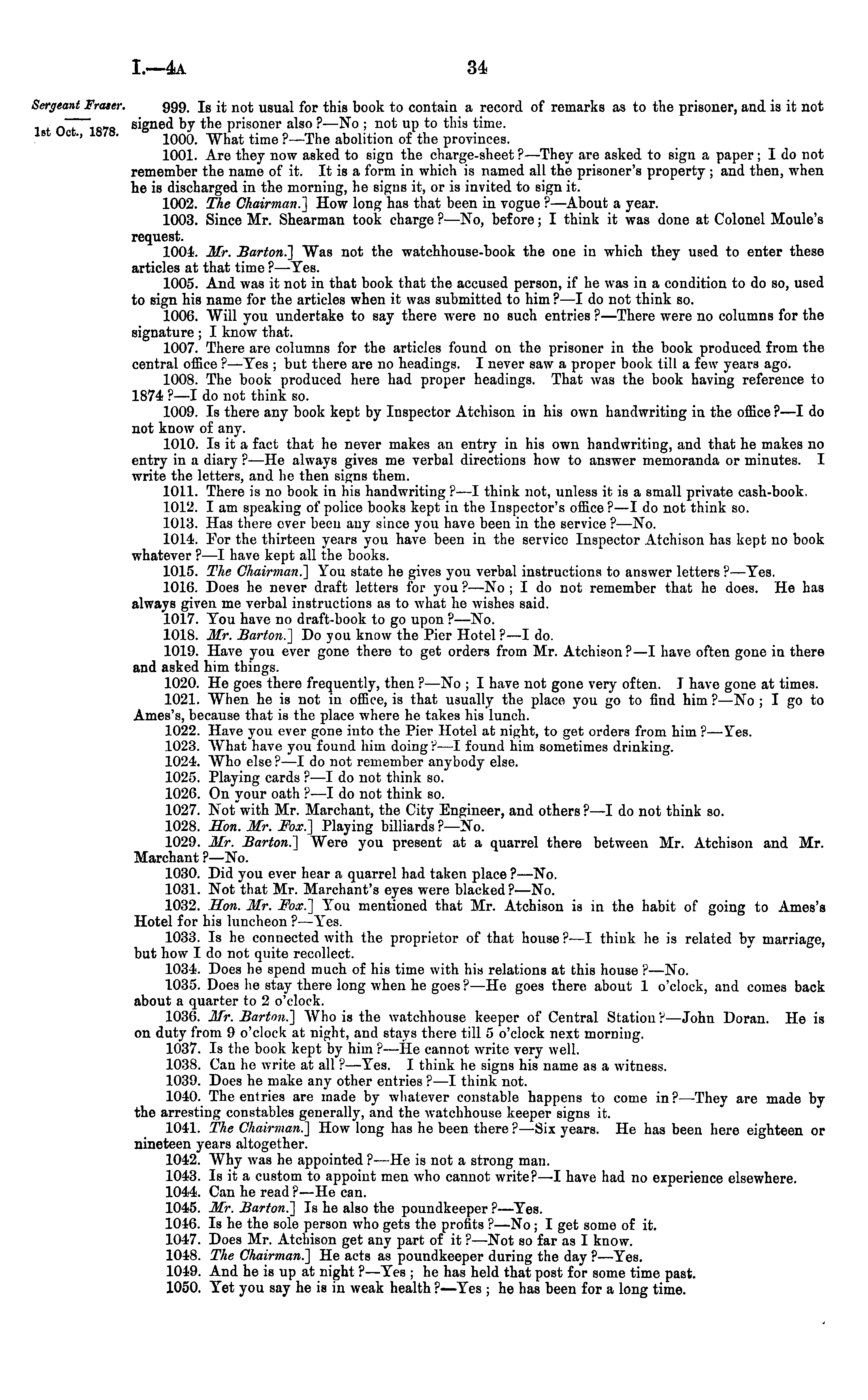 999. Is it not usual for this book to contain a record of remarks as to the prisoner, and is it not signed by the prisoner also ? —No ; not up to this time. 1000. What time ?—The abolition of the provinces. 1001. Are they now asked to sign the charge-sheet ?—They are asked to sign a paper; Ido not remember the name of it. It is a form in which is named all the prisoner's property ; and then, when he is discharged in the morning, he signs it, or is invited to sign it. 1002. The Chairman] How long has that been in vogue ?—About a year. 1003. Since Mr. Shearman took charge ?—No, before; I think it was done at Colonel Moule's request. 1004. Mr. Barton] Was not the watchhouse-book the one in which they used to enter these articles at that time ? —Tes. 1005. And was it not in that book that the accused person, if he was in a condition to do so, used to sign his name for the articles when it was submitted to him ? —I do not think so. 1006. Will you undertake to say there were no such entries ?—There were no columns for the signature ; I know that. 1007. There are columns for the articles found on the prisoner in the book produced from the central office ?—Tes ; but there are no headings. I never saw a proper book till a few years ago. 1008. The book produced here had proper headings. That was the book having reference to 1874 ?—I do not think so. 1009. Is there any book kept by Inspector Atchison in his own handwriting in the office ? —I do not know of any. 1010. Is it a fact that he never makes an entry in his own handwriting, and that he makes no entry in a diary ? —He always gives me verbal directions how to answer memoranda or minutes. I write the letters, and he then signs them. 1011. There is no book in his handwriting ? —I think not, unless it is a small private cash-book. 1012. lam speaking of police books kept in the Inspector's office ?—I do not think so. 1013. Has there ever been any since you have been in the service ?—No. 1014. For the thirteen years you have been in the service Inspector Atchison has kept no book whatever ? —I have kept all the books. 1015. The Chairman] You state he gives you verbal instructions to answer letters ?—Tes. 1016. Does he never draft letters for you ?—No ; I do not remember that he does. He has always given me verbal instructions as to what he wishes said. 1017. Tou have no draft-book to go upon ?—No. 1018. Mr. Barton] Do you know the Pier Hotel ?—I do. 1019. Have you ever gone there to get orders from Mr. Atchison?—l have often gone in there and asked him things. 1020. He goes there frequently, then ? —No ; I have not gone very often. I have gone at times. 1021. AVhen he is not in office, is that usually the place you go to find him ? —No ; I go to Ames's, because that is the place where he takes his lunch. 1022. Have you ever gone into the Pier Hotel at night, to get orders from him ? —Ves. 1023. AVhat have you found him doing ? —I found him sometimes drinking. 1024. AVho else? —I do not remember anybody else. 1025. Playing cards ? —I do not think so. 1026. On your oath ? —I do not think so. 1027. Not with Mr. Marchant, the City Engineer, and others ? —I do not think so. 1028. Hon. Mr. Fox] Playing billiards ?—No. 1029. Mr. Barton] AVere you present at a quarrel there between Mr. Atchison and Mr. Marchant ?—No. 1030. Did you ever hear a quarrel had taken place ?—No. 1031. Not that Mr. Marchant's eyes were blacked ?—No. 1032. Hon. Mr. Fox] Tou mentioned that Mr. Atchison is in the habit of going to Ames's Hotel for his luncheon ? —Tes. 1033. Is he connected with the proprietor of that house ? —I think he is related by marriage, but how I do not quite recollect. 1034. Does he spend much of his time with his relations at this house ? —No. 1035. Does he stay there long when he goes? —He goes there about 1 o'clock, and comes back about a quarter to 2 o'clock. 1036. Mr. Barton] Who is the watchhouse keeper of Central Station ? —John Doran. He is on duty from 9 o'clock at night, and stays there till 5 o'clock next morning. 1037. Is the book kept by him ? —He cannot write very well. 1038. Can he write at all ?—Tes. I think he signs his name as a witness. 1039. Does he make any other entries ? —I think not. 1040. The entries are made by whatever constable happens to come in? —They are made by the arresting constables generally, and the watchhouse keeper signs it. 1041. The Chairman] How long has he been there ? —Six years. He has been here eighteen or nineteen years altogether. 1042. AVhy was he appointed ? —He is not a strong man. 1043. Is it a custom to appoint men who cannot write?—l have had no experience elsewhere. 1044. Can he read ? —He can. 1045. Mr. Barton] Is he also the poundkeeper ?—Tes. 1046. Is he the sole person who gets the profits ?—No ; I get some of it. 1047. Does Mr. Atchison get any part of it ? —Not so far as I know. 1048. The Chairman] He acts as poundkeeper during the day ?—Tes. 1049. And he is up at night ? —Tes ; he has held that post for some time past. 1050. Tet you say he is in weak health ?—Tes ; he has been for a long time.