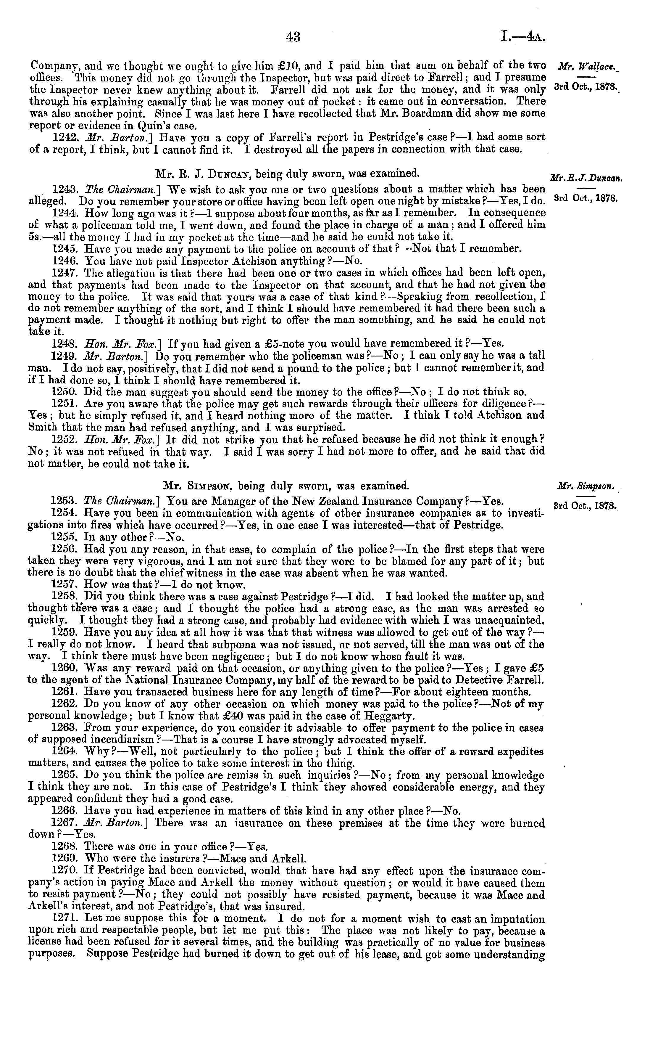 Company, and we thought we ought to give him £10, and I paid him that sum on behalf of the two offices. This money did not go through the Inspector, but was paid direct to Farrell; aud I presume the Inspector never knew anything about it. Farrell did not ask for the money, and it was only through his explaining casually that he was money out of pocket: it came out in conversation. There was also another point. Since I was last here I have recollected that Mr. Boardman did show me some report or evidence in Quin's case. 1242. Mr. Barton] Have you a copy of Farrell's report in Pestridge's case? —I had some sort of a report, I think, but I cannot find it. I destroyed all the papers in connection with that case. Mr. R. J. Duncan 7, being duly sworn, was examined. 1243. The Chairman] AYe wish to ask you one or two questions about a matter which has been alleged. Do you remember your store or office having been left open one night by mistake ? —Tes, I do. 1244. How long ago was it ? —I suppose about four months, as far as I remember. In consequence of what a policeman told me, I went down, and found the place in charge of a man; and I offered him ss.—all the money I had iv my pocket at the time —and he said he could not take it. 1245. Have you made any payment to the police on account of that ? —Not that I remember. 1246. Tou have not paid Inspector Atchison anything? —No. 1247. The allegation is that there had been one or two cases in which offices had been left open, and that payments had been made to the Inspector on that account, and that he had not given the money to the police. It was said that yours was a case of that kind ? —Speaking from recollection, I do not remember anything of the sort, arrd I think I should have remembered it bad there been such a payment made. I thought it nothing but right to offer the man something, and he said he could not take it. 1248. Hon. Mr. Fox] If you had given a £5-note you would have remembered it ? —Tes. 1249. Mr. Barton] Do you remember who the policeman was ? —No ; I can only say he was a tall man. Ido not say, positively, that I did not send a pound to the police ; but I cannot remember it, and if I had done so, I think I should have remembered it. 1250. Did the man suggest you should send the money to the office? —No ; I do not think so. 1251. Are you aware that the police may get such rewards through their officers for diligence?— Tes ; but he simply refused it, and I heard nothing more of the matter. I think I told Atchison and Smith that the man had refused anything, and I was surprised. 1252. Hon. Mr. Fox] It did not strike you that he refused because he did not think it enough? No; it w7as not refused in that way. I said I was sorry I had not more to offer, and he said that did not matter, he could not take it. Mr. Simpson, being duly sworn, was examined. 1253. The Chairman] Tou are Manager of the New Zealand Insurance Company?— Yes. 1254. Have you been in communication with agents of other insurance companies as to investigations into fires which have occurred? —Tes, in one case I was interested —that of Pestridge. 1255. In auy other?— No. 1256. Had you any reason, in that case, to complain of the police?—ln the first steps that were taken they were very vigorous, and lam not sure that they were to be blamed for any part of it; but there is no doubt that the chief witness in the case was absent when he was wanted. 1257. How was that?—-I do not know. 1258. Did you think there was a case against Pestridge ?—I did. I had looked the matter up, and thought there was a case; and I thought the police had a strong case, as the man was arrested so quickly. I thought they had a strong case, and probably had evidence with which I was unacquainted. 1259. Have you any idea at all how it was that that witness was allowed to get out of the way?— I really do not know. I heard that subpoena was not issued, or not served, till the man was out of the way. I think there must have been negligence ; but Ido not know whose fault it was. 1260. AVas any reward paid on that occasion, or anything given to the police ? —Tes ; I gave £5 to the agent of the National Insurance Company, my half of the reward to be paid to Detective Farrell. 1261. Have you transacted business here for any length of time? —For about eighteen months. 1262. Do you know of any other occasion on which money was paid to the police?— Not of my personal knowledge; but I know that £40 was paid in the case of Heggarty. 1263. From your experience, do you consider it advisable to offer payment to the police in cases of supposed incendiarism ? —That is a course I have strongly advocated myself. 1264. Why? —AVell, not particularly to the police ; but I think the offer of a reward expedites matters, and causes the police to take some interest in the thing. 1265. Do you think the police are remiss in such inquiries ?—No ; from my personal knowledge I think they are not. In this case of Pestridge's I think they showed considerable energy, and they appeared confident they had a good case. 1266. Have you had experience in matters of this kind in any other place ?—No. 1267. Mr. Barton] There was an insurance on these premises at the time they were burned down ? —Tes. 1268. There was one in your office ?—Tes. 1269. Who were the insurers ? —Mace and Arkell. 1270. If Pestridge had been convicted, would that have had any effect upon the insurance company's action in paying Mace and Arkell the money without question ; or would it have caused them to resist payment ? —No; they could not possibly have resisted payment, because it was Mace and Arkell's interest, and not Pestridge's, that was insured. 1271. Let me suppose this for a moment. I do not for a moment wish to cast an imputation upon rich and respectable people, but let me put this : The place was not likely to pay, because a license had been refused for it several times, and the building was