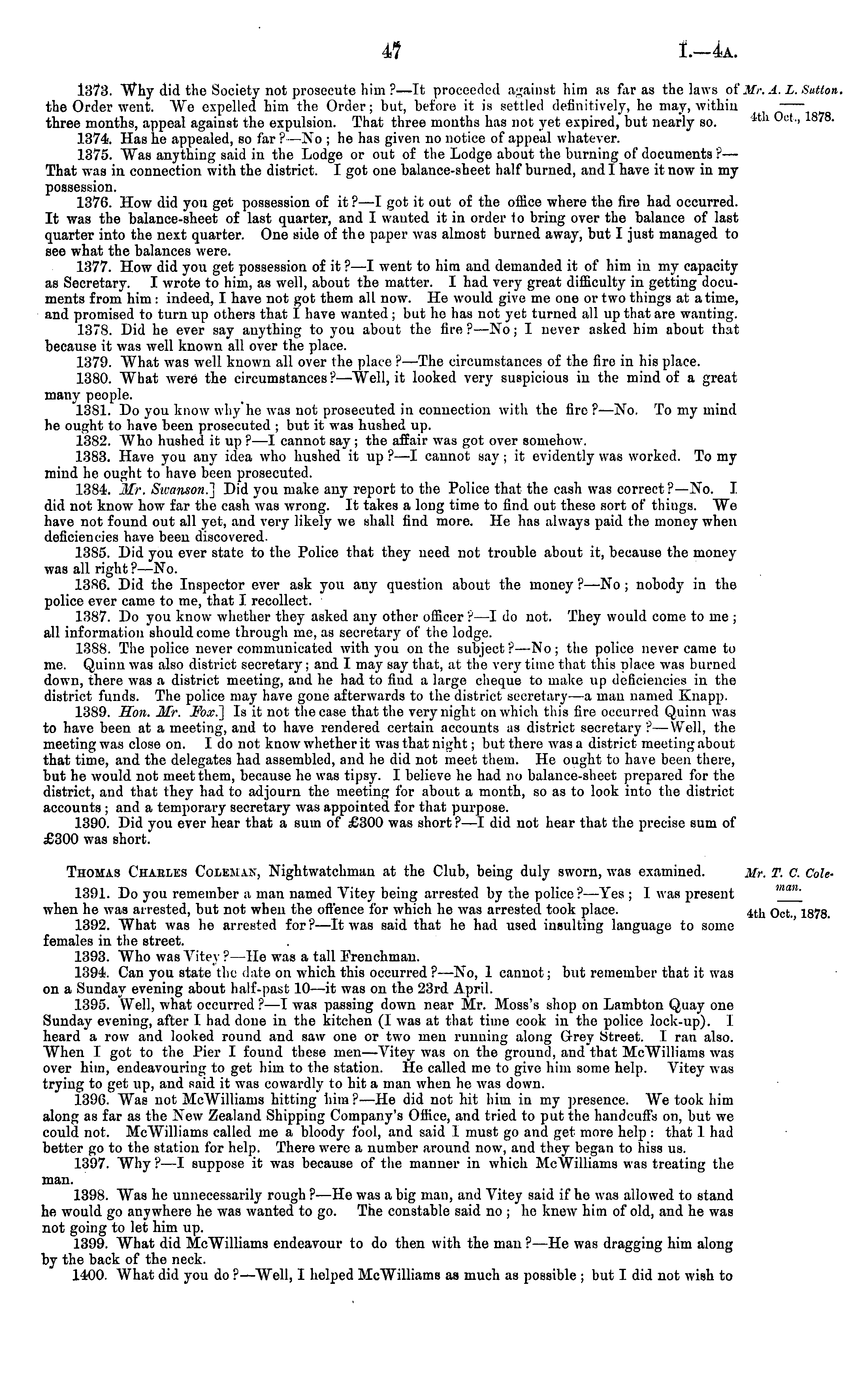 1373. AVhy did the Society not prosecute him ?—lt proceeded against him as far as the laws of the Order Went We expelled him the Order; but, before it is settled definitively, he may, within three months, appeal against the expulsion. That three months has not yet expired, but nearly so. 1374. Has he appealed, so far ?—No ; he has given no notice of appeal whatever. 1375. AVas anything said in the Lodge or out of the Lodge about the burning of documents ?— That was in connection with the district. I got one balance-sheet half burned, and! have it now in my possession. 1376. How did you get possession of it ? —I got it out of the office where the fire had occurred. It was the balance-sheet of last quarter, and I wanted it in order to bring over the balance of last quarter into the next quarter. One side of the paper was almost burned away, but I just managed to see what the balances were. 1377. How did you get possession of it ?—I went to him and demanded it of him in my capacity as Secretary. I wrote to him, as well, about the matter. I had very great difficulty in getting documents from him : indeed, I have not got them all now. He would give me one or tw 7o things at a time, and promised to turn up others that I have wanted ; but ho has not yet turned all up that are wanting. 1378. Did he ever say anything to you about the fire? —No; I never asked him about that because it was well known all over the place. 1379. AVhat was well known all over the place ? —The circumstances of the fire in his place. 1380. What were the circumstances? —Well, it looked very suspicious in the mind of a great many people. 1381. Do you know 7 why he was not prosecuted in connection with the fire ? —No. To my mind be ought to have been prosecuted ; but it was hushed up. 1382. AVho hushed it up ? —I cannot say ; the affair was got over somehow. 1383. Have you any idea who hushed it up ? —I cannot say; it evidently was worked. To my mind he ought to have been prosecuted. 1384. Mr. Swanson] Did you make any report to the Police that the cash was correct? —No. I. did not know how far the cash was wrong. It takes a long time to find out these sort of things. We have not found out all yet, and very likely we shall find more. He has always paid the money when deficiencies have been discovered. 1385. Did you ever state to the Police that they need not trouble about it, because the money was all right? —No. 1386. Did the Inspector ever ask you any question about the money ? —No ; nobody in the police ever came to me, that I recollect. 1387. Do you know whether they asked any other officer ? —I do not. They would come to me ; all information should come through me, as secretary of the lodge. 1388. The police never communicated with you on the subject ? —No; the police never came to me. Quinn was also district secretary; and I may say that, at the very time that this place was burned down, there was a district meeting, and he had to find a large cheque to make up deficiencies in the district funds. The police may have gone afterwards to the district secretary —a man named Knapp. 1389. Hon. Mr. Fox] Is it not the case that the very night on which this fire occurred Quinn was to have been at a meeting, and to have rendered certain accounts as district secretary?— Well, the meeting was close on. Ido not know whether it was that night; but there was a district meeting about that time, and the delegates had assembled, and he did not meet them. He ought to have been there, but he would not meet them, because he was tipsy. I believe he had no balance-sheet prepared for the district, and that they had to adjourn the meeting for about a month, so as to look into the district accounts ; and a temporary secretary was appointed for that purpose. 1390. Did you ever hear that a sum of £300 was short ? —I did not hear that the precise sum of £300 was short. Thomas Charles Coleman, Nightwatchman at the Club, being duly sworn, was examined. 1391. Do you remember a man named A ritey being arrested by the police ? —Tes ; I was present when he was arrested, but not when the offence for which he was arrested took place. 1392. What was he arrested for? —It was said that he had used insulting language to some females in the street. 1393. Who was A ritey ? —He was a tall Frenchman. 1394. Can you state the dale on which this occurred?—No, 1 cannot; but remember that it n 7as on a Sunday evening about half-past 10—it was on the 23rd April. 1395. Well, what occurred ? —I was passing down near Mr. Moss's shop on Lambton Quay one Sunday evening, after 1 had done in the kitchen (I was at that time cook in the police lock-up). I heard a row and looked round and saw one or tw 7o men running along Grey Street. I ran also. When I got to the Pier I found these men—Vitey was on the ground, and that McAVilliams was over him, endeavouring to get him to the station, fie called me to give him some help. A ritey was trying to get up, and said it was cowardly to hit a man when he was down. 1396. Was not McWilliams hitting him ? —He did not hit him in my presence. We took him along as far as the New Zealand Shipping Company's Office, and tried to put the handcuffs on, but we could not. McAVilliams called me a bloody fool, and said I must go and get more help : that I had better go to the station for help. There were a number around now, and they began to hiss us. 1397. Why ?—I suppose it was because of the manner in which McWilliams was treating the man. 1398. AVas he unnecessarily 7 rough ?•—He was a big man, and A ritey said if he was allowed to stand he would go anywhere he was wanted to go. The constable said no ; he knew him of old, and he was not going to let him up. 1399. AVhat did McWilliams endeavour to do then with the man ?—He was dragging him along by the back of the neck. 1400. What did you do ?—AVell, I helped McAVilliams as much as possible ; but I did not wish to