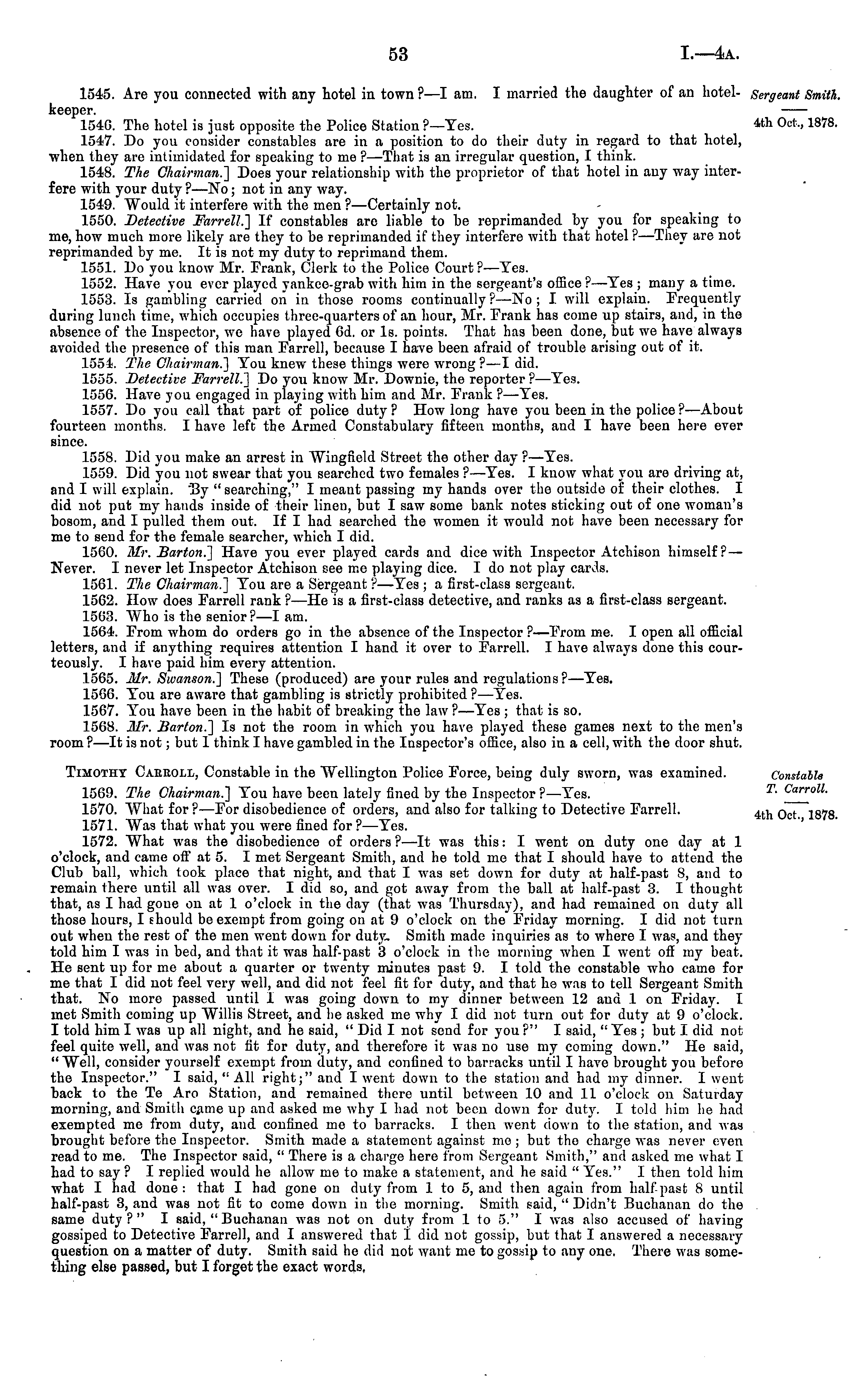 1545. Are you connected with any hotel in town ?—I am. I married the daughter of an hotelkeeper. 1546. The hotel is just opposite the Police Station ?—Tes. 1547. Do you consider constables are in a position to do their duty in regard to that hotel, when they are intimidated for speaking to me ? —That is an irregular question, I think. 1548. The Chairman] Does your relationship with the proprietor of that hotel in any way interfere with your duty?—No; not in any way. 1549. AVould it interfere with the men ?—Certainly not. 1550. Detective Farrell] If constables are liable to be reprimanded by you for speaking to me, how 7 much more likely are they to be reprimanded if they interfere with that hotel ? —They are not reprimanded by me. It is not my duty to reprimand them. 1551. Do you know Mr. Frank, Clerk to the Police Court ? —Tes. 1552. Have you ever played yankee-grab with him in the sergeant's office ?—Tes ; many a time. 1553. Is gambling carried on in those rooms continually ?—No ; I will explain. Frequently during lunch time, which occupies three-quarters of an hour, Mr. Frank has come up stairs, and, in the absence of the Inspector, we have played 6d. or Is. points. That has been done, but we have always avoided the presence of this man Farrell, because I have been afraid of trouble arising out of it. 1554. The Chairman] Tou knew these things were wrong ?—I did. 1555. Detective Farrell] Do you know Mr. Downie, the reporter ? —Tes. 1556. Have you engaged in playing with him and Air. Frank ? —-Tes. 1557. Do you carl that part of police duty ? How long have you been in the police ? —About fourteen months. I have left the Armed Constabulary fifteen months, and I have been here ever since. 1558. Did you make an arrest in AViugfield Street the other day ? —Tes. 1559. Did you not swear that you searched two females ? —Tes. I know what you are driving at, and I will explain. 'By "searching," I meant passing my hands over the outside of their clothes. I did not put my hands inside of their linen, but I saw some bank notes sticking out of one woman's bosom, and I pulled them out. If I had searched the women it would not have been necessary for me to send for the female searcher, which I did. 15G0. Mr. Barton] Have you ever played cards and dice with Inspector Atchison himself?— Never. I never let Inspector Atchison see me playing dice. I do not play cards. 1561. The Chairman] Tou are a Sergeant ?—Tes ; a first-class sergeant. 1562. How does Farrell rank ? —He is a first-class detective, and ranks as a first-class sergeant. 1563. AVho is the senior?—l am. 1504. From whom do orders go in the absence of the Inspector ?—From me. I open all official letters, and if anything requires attention I hand it over to Farrell. I have ahvays done this courteously. I have paid him every attention. 1565. Mr. Swanson] These (produced) are your rules and regulations?—Tes. 1566. Ton are aware that gambling is strictly prohibited ? —Tes. 1567. Ton have been in the habit of breaking the law ?—Tes ; that is so. 1568. Mr. Barton] Is not the room in which you have played these games next to the men's room ?—lt is not ; but 1 think I have gambled in the Inspector's office, also in a cell, with the door shut. Timothy Carroll, Constable in the AVellington Police Force, being duly sworn, was examined. 1569. The Chairman] Tou have been lately fined by the Inspector ? —Tes. 1570. AVhat for? —For disobedience of orders, and also for talking to Detective Farrell. 1571. AVas that what you were fined for ? —Tes. 1572. What was the disobedience of orders ?—lt was this: I went on duty one day at 1 o'clock, and came off at 5. I met Sergeant Smith, and he told me that I should have to attend the Club ball, which took place that night, and that I w 7as set down for duty at half-past S, and to remain there until all was over. I did so, and got aw7ay from the ball at half-past 3. I thought that, as I had gone on at 1 o'clock in the day (that was Thursday), and had remained on duty all those hours, I should be exempt from going on at 9 o'clock on the Friday morning. I did not turn out when the rest of the men went down for duty. Smith made inquiries as to where I was, and they told him I was in bed, and that it was half-past 3 o'clock in the morning when I went off my beat. He sent up for me about a quarter or twenty minutes past 9. I told the constable who came for me that I did not feel very well, and did not feel fit for duty, and that he was to tell Sergeant Smith that. No more passed until I was going down to my dinner between 12 and 1 on Friday. I met Smith coming up AVillis Street, and he asked me why I did not turn out for duty at 9 o'clock. I told him I was up all night, and he said, " Did I not send for you ?" I said, " Tes ; but I did not feel quite well, and was not fit for duty, and therefore it was no use my coming down." He said, " Well, consider yourself exempt from duty, and confined to barracks until I have brought you before the Inspector." I said, " All right;" and I went down to the station and had my dinner. I went back to the Te Aro Station, aud remained there until between 10 and 11 o'clock on Saturday morning, and Smith came up and asked me why I had not been down for duty. I told him he bad exempted me from duty, and confined mo to barracks. I then went down to the station, and was brought before the Inspector. Smith made a statement against me ; but tho charge was never even read to me. The Inspector said, " There is a charge here from Sergeant Smith," and asked me what I had to say ? I replied would he allow me to make a statement, and he said " Tes." I then told him what I had done : that I had gone on duty from 1 to 5, and then again from half past 8 until half-past 3, and was not fit to come down in the morning. Smith said, " Didn't Buchanan do the same duty?" I said, " Buchanan was not on duty from 1 to 5." I was also accused of having gossiped to D