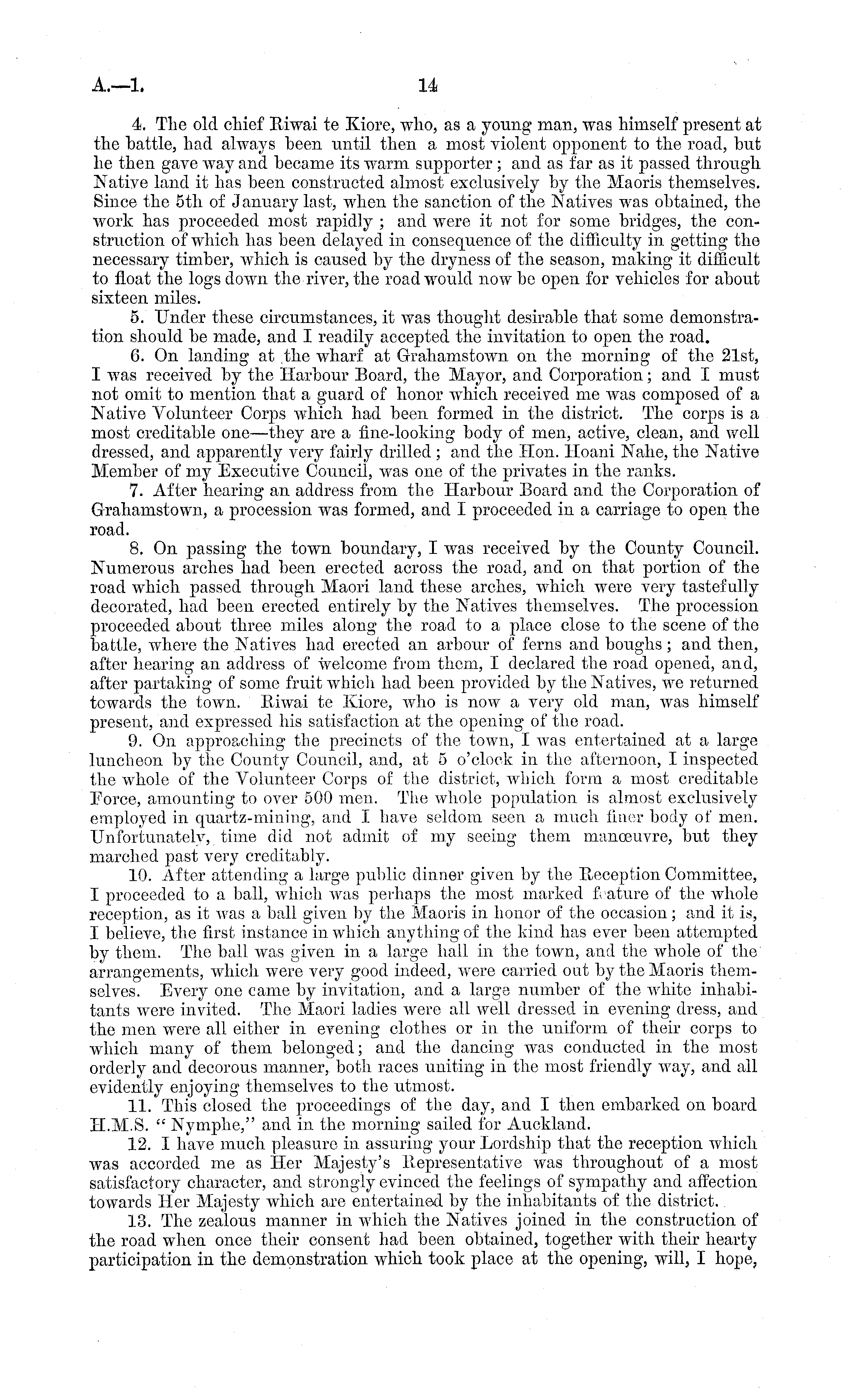 4. The old chief Riwai te Kiore, who, as a young man, was himself present at the battle, had always been until then a most violent opponent to the road, but he then gave way and became its warm supporter ; and as far as it passed through Native land it has been constructed almost exclusively by the Maoris themselves. Since the sth of January last, when the sanction of the Natives was obtained, the work has proceeded most rapidly ; and were it not for some bridges, the construction of which has been delayed in consequence of the difficulty in getting the necessary timber, which is caused by the dryness of the season, making it difficult to float the logs down the river, the road would now be open for vehicles for about sixteen miles. 5. Under these circumstances, it was thought desirable that some demonstration should be made, and I readily accepted the invitation to open the road. 6. On landing at the wharf at Grahamstown on the morning of the 21st, I was received by the Harbour Board, the Mayor, and Corporation; and I must not omit to mention that a guard of honor which received me was composed of a Native Volunteer Corps which had been formed in the district. The corps is a most creditable one —they are a fine-looking body of men, active, clean, and well dressed, and apparently very fairly drilled ; and the Hon. lloani Nahe, the Native Member of my Executive Council, was one of the privates in the ranks. 7. After hearing an address from the Harbour Board and the Corporation of Grahamstown, a procession was formed, and I proceeded in a carriage to open the road. 8. On passing the town boundary, I was received by the County Council. Numerous arches had been erected across the road, and on that portion of the road which passed through Maori land these arches, which were very tastefully decorated, had been erected entirely by the Natives themselves. The procession proceeded about three miles along the road to a place close to the scene of the battle, where the Natives had erected an arbour of ferns and boughs; and then, after hearing an address of welcome from them, I declared the road opened, and, after partaking of some fruit which had been provided by the Natives, we returned towards the town. Riwai te Kiore, who is now a very old man, was himself present, and expressed his satisfaction at the opening of the road. 9. On approaching the precincts of the town, I was entertained at a large luncheon by the County Council, and, at 5 o'clock in the afternoon, I inspected the whole of the Volunteer Corps of the district, which form a most creditable Eorce, amounting to over 500 men. The whole population is almost exclusively employed in quartz-mining, and I have seldom seen a much finer body of men. Unfortunately, time did not admit of my seeing them manoeuvre, but they marched past very creditably. 10. After attending a large public dinner given by the Reception Committee, I proceeded to a ball, which was perhaps the most marked feature of the whole reception, as it was a ball given by the Maoris in honor of the occasion; and it is, I believe, the first instance in which anything of the kind has ever been attempted by them. The ball was given in a large hall in the town, and the whole of the arrangements, which were very good indeed, were carried out by the Maoris themselves. Every one came by invitation, and a large number of the white inhabitants were invited. The Maori ladies were all well dressed in evening dress, and the men were all either in evening clothes or in the uniform of their corps to which many of them belonged; and the dancing was conducted in the most orderly and decorous manner, both races uniting in the most friendly way, and all evidently enjoying themselves to the utmost. 11. This closed the proceedings of the day, and I then embarked on board H.M.S. " Nymphe," and in the morning sailed for Auckland. 12. I have much pleasure in assuring your Lordship that the reception which was accorded me as Her Majesty's Representative was throughout of a most satisfactory character, and strongly evinced the feelings of sympathy and affection towards Her Majesty which are entertained by the inhabitants of the district. 13. The zealous manner in which the Natives joined in the construction of the road when once their consent had been obtained, together with their hearty participation in the demonstration which took place at the opening, will, I hope,