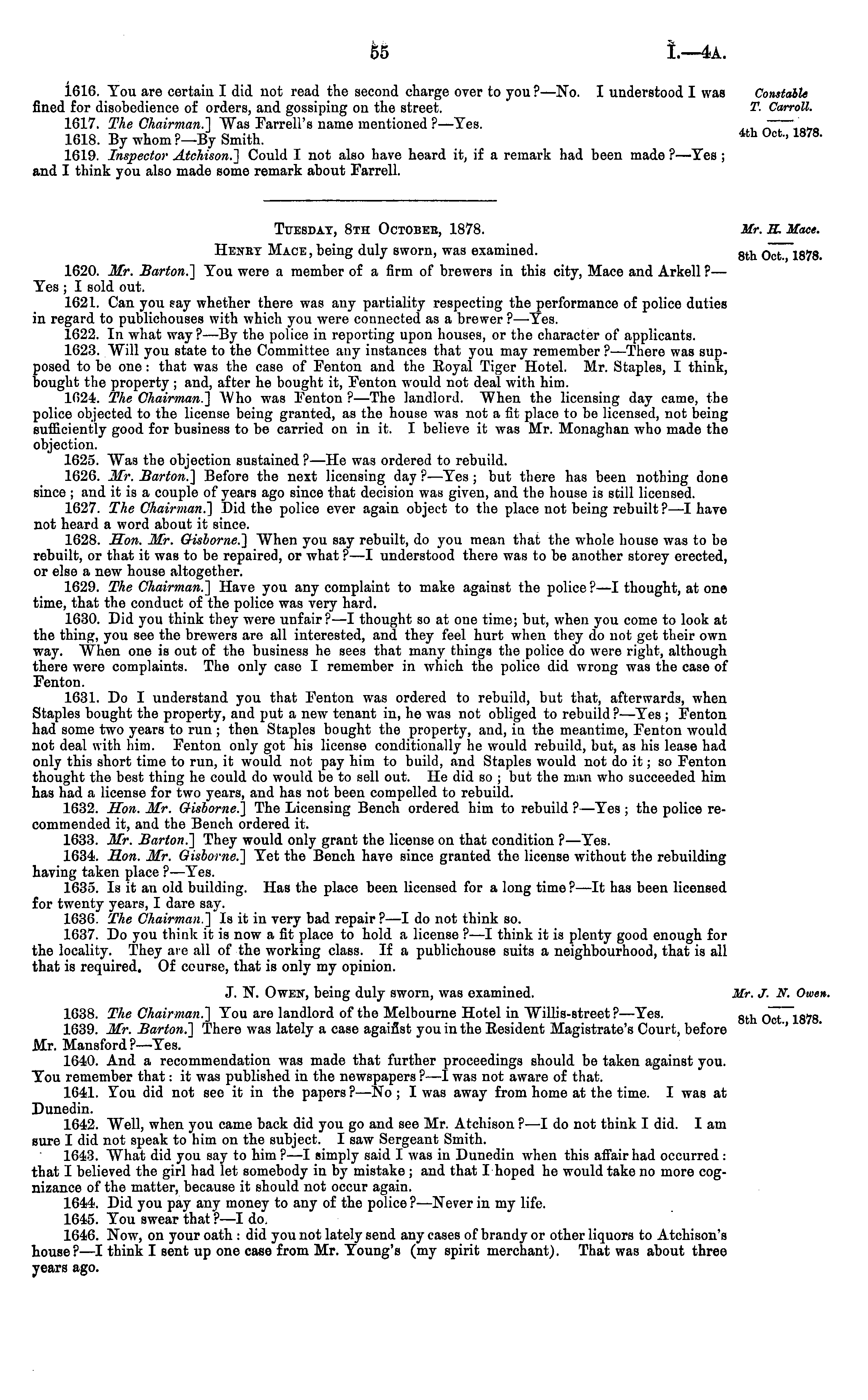 Tuesday, Bth Octobee, 1878. Henst Mace, being duly sworn, was examined. 1620. Mr. Barton] Tou were a member of a firm of brewers in this city, Mace and Arkell ?— Tes ; I sold out. 1621. Can you say whether there was any partiality respecting the performance of police duties in regard to publichouses with which you were connected as a brewer ?—Tes. 1622. In what way ? —By the police in reporting upon houses, or the character of applicants. 1623. Will you state to the Committee any instances that you may remember ? —There was supposed to be one: that was the case of Fenton and the Royal Tiger Hotel. Mr. Staples, I think, bought the property; and, after he bought it, Fenton would not deal with him. 1624. The Chairman] AVho was Fenton ?—The landlord. When the licensing day came, the police objected to the license being granted, as the house was not a fit place to be licensed, not being sufficiently good for business to be carried on in it. I believe it was Mr. Monaghan who made the objection. 1625. AVas the objection sustained ? —He was ordered to rebuild. 1626. Mr. Barton] Before the next licensing day ? —Tes; but there has been nothing done since ; and it is a couple of years ago since that decision was given, and the house is still licensed. 1627. The Chairman] Did the police ever again object to the place not being rebuilt ? —I have not heard a word about it since. 1628. Hon. Mr. Gisborne] When you say rebuilt, do you mean that the whole house was to be rebuilt, or that it was to be repaired, or what ? —I understood there was to be another storey erected, or else a new house altogether. 1629. The Chairman] Have you any complaint to make against the police?—l thought, at one time, that the conduct of the police was very hard. 1630. Did you think they were unfair? —I thought so at oue time; but, when you come to look at the thing, you see the brew 7ers are all interested, and they feel hurt when they do not get their own way. AVhen one is out of the business he sees that many things the police do were right, although there were complaints. The only case I remember in which the police did wrong was the case of Fenton. 1631. Do I understand you that Fenton was ordered to rebuild, but that, afterwards, when Staples bought the property, and put a new tenant in, he was not obliged to rebuild ?—Tes ; Fenton had some two years to run ; then Staples bought the property, and, in the meantime, Fenton would not deal with him. Fenton only got his license conditionally he would rebuild, but, as his lease had only this short time to run, it would not pay him to build, and Staples would not do it; so Fenton thought the best thing he could do would be to sell out. He did so ; but the man who succeeded him has had a license for two years, and has not been compelled to rebuild. 1632. Hon. Mr. Gisborne] The Licensing Bench ordered him to rebuild ?—Tes ; the police recommended it, and the Bench ordered it. 1633. Mr. Barton] They would only grant the license on that condition ?—Tes. 1634. Hon. Mr. Gisborne] Tet the Bench have since granted the license without the rebuilding having taken place ? —Tes. 1635. Is it an old building. Has the place been licensed for a long time? —It has been licensed for twenty years, I dare say. 1636. The Chairman] Is it in very bad repair ?—I do not think so. 1637. Do you think it is now a fit place to hold a license ?—I think it is plenty good enough for the locality. They are all of the working class. If a publichouse suits a neighbourhood, that is all that is required. Of course, that is only my opinion. J. N. Owen, being duly sworn, was examined. 1638. The Chairman] Tou are landlord of the Melbourne Hotel in AVillis-street?—-Tes. 1639. Mr. Barton] There was lately a case against you in the Resident Magistrate's Court, before Mr. Mansford ? —Tes. 1640. And a recommendation was made that further proceedings should be taken against you. Tou remember that: it was published in the newspapers ? —I was not aware of that. 1641. Tou did not see it in the papers ?—No ; I was away from home at the time. I was at Dunedin. 1642. AVell, when you came back did you go and see Mr. Atchison ? —I do not think I did. lam sure I did not speak to him on the subject. I saw Sergeant Smith. 1643. What did you say to him ? —I simply said I was in Dunedin when this affair had occurred : that I believed the girl had let somebody in by mistake; and that I hoped he w 7ould take no more cognizance of the matter, because it should not occur again. 1644. Did you pay any money to any of the police?— Never in my life. 1645. Tou swear that ?— I do. 1646. Now, on your oath : did you not lately send any cases of brandy or other liquors to Atchison's house? —I think I sent up one case from Mr. Toung's (my spirit merchant). That was about three years ago.