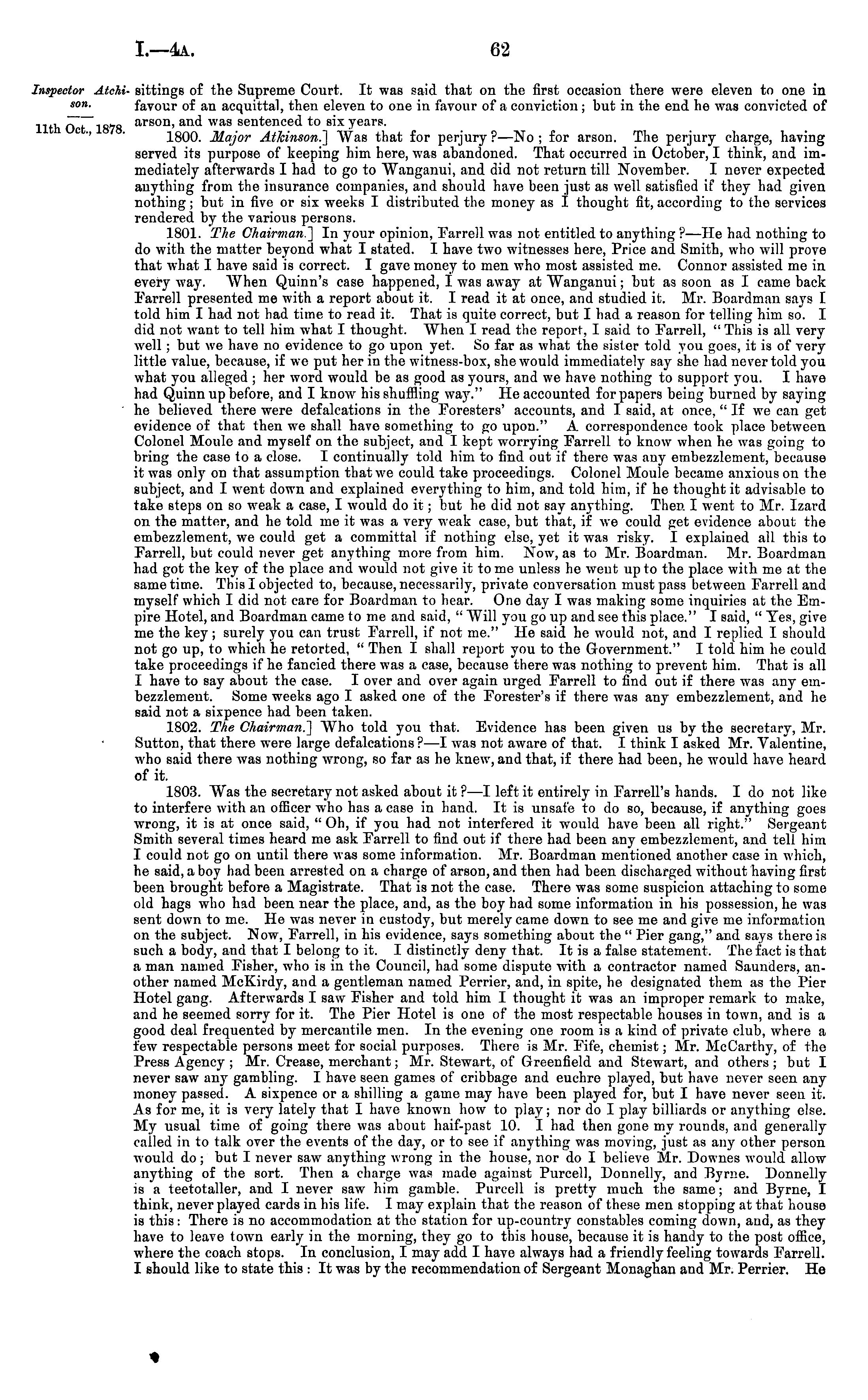 sittings of the Supreme Court. It was said that on the first occasion there were eleven to one in favour of an acquittal, then eleven to one in favour of a conviction ; but in the end he was convicted of arson, and was sentenced to six years. 1800. Major Atkinson] Was that for perjury ? —No j for arson. The perjury charge, having served its purpose of keeping him here, was abandoned. That occurred in October, I think, aud immediately afterwards I had to go to Wanganui, and did not return till November. I never expected anything from the insurance companies, and should have been just as well satisfied if they had given nothing; but in five or six weeks I distributed the money as 1 thought fit, according to the services rendered by tbe various persons. 1801. The Chairman] In your opinion, Farrell was not entitled to anything ? —He had nothing to do with the matter beyond what I stated. I have two witnesses here, Price and Smith, who will prove that what I have said is correct. I gave money to men who most assisted me. Connor assisted me in every way. When Quinn's case happened, I was away at Wanganui; but as soon as I came back Farrell presented me with a report about it. I read it at once, and studied it. Mr. Boardman says I told him I had not bad time to read it. That is quite correct, but I had a reason for telling him so. I did not want to tell him what I thought. When I read the report, I said to Farrell, " This is all very well; but we have no evidence to go upon yet. So far as what the sister told you goes, it is of very little value, because, if we put her in the witness-box, she would immediately say she had never told you what you alleged ; her word would be as good as yours, and we have nothing to support you. I have had Quinn up before, and I know his shuffling way." He accounted for papers being burned by saying he believed there were defalcations in the Foresters' accounts, and I said, at once, " If we can get evidence of that then we shall have something to go upon." A correspondence took place between Colonel Moule and myself on the subject, and I kept worrying Farrell to know when he was going to bring the case to a close. I continually told him to find out if there was any embezzlement, because it was only on that assumption that we could take proceedings. Colonel Moule became anxious on the subject, and I went down and explained everything to him, and told him, if he thought it advisable to take steps on so weak a case, I would do it; but he did not say anything. Then I went to Mr. Izard on the matter, and he told me it was a very weak case, but that, if we could get evidence about the embezzlement, we could get a committal if nothing else, yet it was risky. I explained all this to Farrell, but could never get anything more from him. Now, as to Mr. Boardman. Mr. Boardman had got the key of the place and would not give it to me unless he went up to the place with me at the same time. This I objected to, because, necessarily, private conversation must pass between Farrell and myself which I did not care for Boardman to bear. One day I was making some inquiries at the Empire Hotel, and Boardman came to me and said, " Will you go up and see this place." I said, " Tes, give me the key; surely you can trust Farrell, if not me." He said he would not, and I replied I should not go up, to which he retorted, " Then I shall report you to the Government." I told him he could take proceedings if ho fancied there was a case, because there was nothing to prevent him. That is all I have to say about the case. I over and over again urged Farrell to find out if there was any embezzlement. Some weeks ago I asked one of the Forester's if there was any embezzlement, and he said not a sixpence had been taken. 1802. The Chairman. 1* Who told you that. Evidence has been given us by the secretary, Mr. Sutton, that there were large defalcations? —I was not aware of that. I think I asked Mr. Valentine, who said there was nothing wrong, so far as he know 7, and that, if there had been, he would have heard of it. 1803. Was the secretary not asked about it ?—I left it entirely in Farrell's hands. Ido not like to interfere with an officer who has a case in hand. It is unsafe to do so, because, if anything goes wrong, it is at once said, " Oh, if you had not interfered it would have been all right." Sergeant Smith several times heard me ask Farrell to find out if there had been any embezzlement, and tell him I could not go on until there was some information. Mr. Boardman mentioned another case in which, he said, a boy had been arrested on a charge of arson, and then had been discharged without having first been brought before a Magistrate. That is not the case. There was some suspicion attaching to some old hags who had been near the place, and, as the boy had some information in his possession, he was sent down to me. He was never in custody, but merely came down to see me and give me information on the subject. Now, Farrell, in his evidence, says something about the " Pier gang," and says there is such a body, and that I belong to it. I distinctly deny that. It is a false statement. The fact is that a man named Fisher, who is in the Council, had some dispute with a contractor named Saunders, another named McKirdy, and a gentleman named Perrier, and, in spite, he designated them as the Pier Hotel gang. Afterwards I saw Fisher and told him I thought it was an improper remark to make, and he seemed sorry for it. The Pier Hotel is one of the most respectable houses in town, and is a good deal frequented by mercantile men. In the evening one room is a kind of private club, where a few respectable persons meet for social purposes. There is Mr. Fife, chemist; Mr. McCarthy, of the Press Agency ; Mr. Crease, merchant; Mr. Stewart, of Greenfield and Stewart, and others ; but I never saw any gambling. I have seen games of cribbage and euchre played, but have never seen any money passed. A sixpence or a