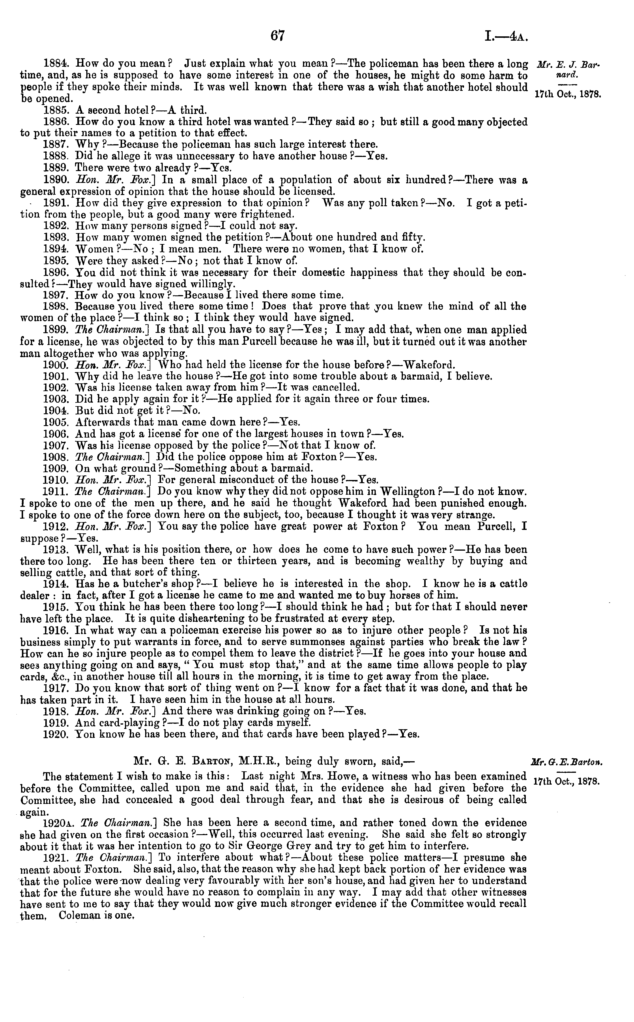 1884. How do you mean ? Just explain what you mean ?—The policeman has been there a long time, and, as he is supposed to have some interest in one of the houses, he might do some harm to people if they spoke their minds. It was well known that there was a wish that another hotel should be opened. 1885. A second hotel ? —A third. 1886. How do you know a third hotel was wanted ?—They said so ; but still a good many objected to put their names to a petition to that effect. 1887. Why ?—Because the policeman has such large interest there. 1888. Did he allege it was unnecessary to have another house ? —Tes. 1889. There were two already ? —Tes. 1890. Hon. Mr. Fox] In a small place of a population of about six hundred?— There was a general expression of opinion that the house should be licensed. 1891. How did they give expression to that opinion? Was any poll taken ? —No. I got a petition from the people, but a good many were frightened. 1892. How many persons signed ?—I could not say. 1893. How many women signed the petition ? —About one hundred and fifty. 1894. Women ?—No ; I mean men. There were no women, that I know 7 of. 1895. Were they asked ?—No; not that I know of. 1896. Tou did not think it was necessary for their domestic happiness that they should be consulted: —They would have signed willingly. 1897. How do you know ?—Because I lived there some time. 1898. Because you lived there some time ! Does that prove that you knew the mind of all the women of the place ?—I think so ; I think they would have signed. 1899. The Chairman] Is that all you have to say? —Tes ; I may add that, when one man applied for a license, he was objected to by this man Purcell because he was ill, but it turned out it was another man altogether who was applying. 1900. Hon. Mr. Fox] Who had held the license for the house before? —Wakeford. 1901. AVhy did he leave the house ? —He got into some trouble about a barmaid, I believe. 1902. Was his license taken away from him ?—lt was cancelled. 1903. Did he apply again for it ? —He applied for it again three or four times. 1904. But did not get it ?—No. 1905. Afterwards that man came down here ?—Tes. 1906. And has got a license for one of the largest houses in town ?—Tes. 1907. Was his license opposed by the police? —Not that I know of. 1908. The Chairman] Did the police oppose him at Foxton? —Tes. 1909. On what ground ?—Something about a barmaid. 1910. Hon. Mr. Fox] For general misconduct of the house ?—Tes. 1911. The Chairman] Do you know why they did not oppose him in Wellington ?—I do not know. I spoke to one of the men up there, and he said he thought Wakeford had been punished enough. I spoke to one of the force down here on the subject, too, because I thought it was very strange. 1912. Hon. Mr. Fox] Tou say the police have great power at Foxton ? Tou mean Purcell, I suppose? —Tes. 1913. Well, what is his position there, or how does he come to have such power ?—He has been there too long. He has been there ten or thirteen years, and is becoming wealthy by buying and selling cattle, and that sort of thing. 1914. Has he a butcher's shop ? —I believe he is interested in the shop. I know he is a cattle dealer : in fact, after I got a license he came to me and wanted me to buy horses of him. 1915. Tou think he has been there too long?—I should think he had ; but for that I should never have left the place. It is quite disheartening to be frustrated at every step. 1916. In what way can a policeman exercise his power so as to injure other people? Is not his business simply to put warrants in force, and to serve summonses against parties who break the law ? How can he so injure people as to compel them to leave the district ? —lf he goes into your house and see 3 anything going on and says, " Tou must stop that," and at the same time allows people to play cards, &c, in another house till all hours in the morning, it is time to get away from the place. 1917. Do you know that sort of thing went on ?—I know for a fact that it was done, and that he has taken part in it. I have seen him in the house at all hours. 1918. Hon. Mr. Fox] And there was drinking going on ? —Tes. 1919. And card-playing ? —I do not play cards myself. 1920. Tou know he has been there, and that cards have been played ?—Tes. Mr. G. E. Barton, M.H.R., being duly sworn, said, — The statement I wish to make is this: Last night Mrs. Howe, a witness who has been examined before the Committee, called upon me and said that, in the evidence she had given before the Committee, she had concealed a good deal through fear, and that she is desirous of being called again. 1920 a. The Chairman] She has been here a second time, and rather toned down the evidence she had given on the first occasion ?—Well, this occurred last evening. She said she felt so strongly about it that it was her intention to go to Sir George Grey and try to get him to interfere. 1921. The Chairman] To interfere about what?— About these police matters —I presume she meant about Foxton. She said, also, that the reason why she had kept back portion of her evidence was that the police were now dealing very favourably with her son's house, and bad given her to understand that for the future she would have no reason to complain in any way. I may add that other witnesses have sent to me to say that they would now give much stronger evidence if the Committee would recall them. Coleman is one,