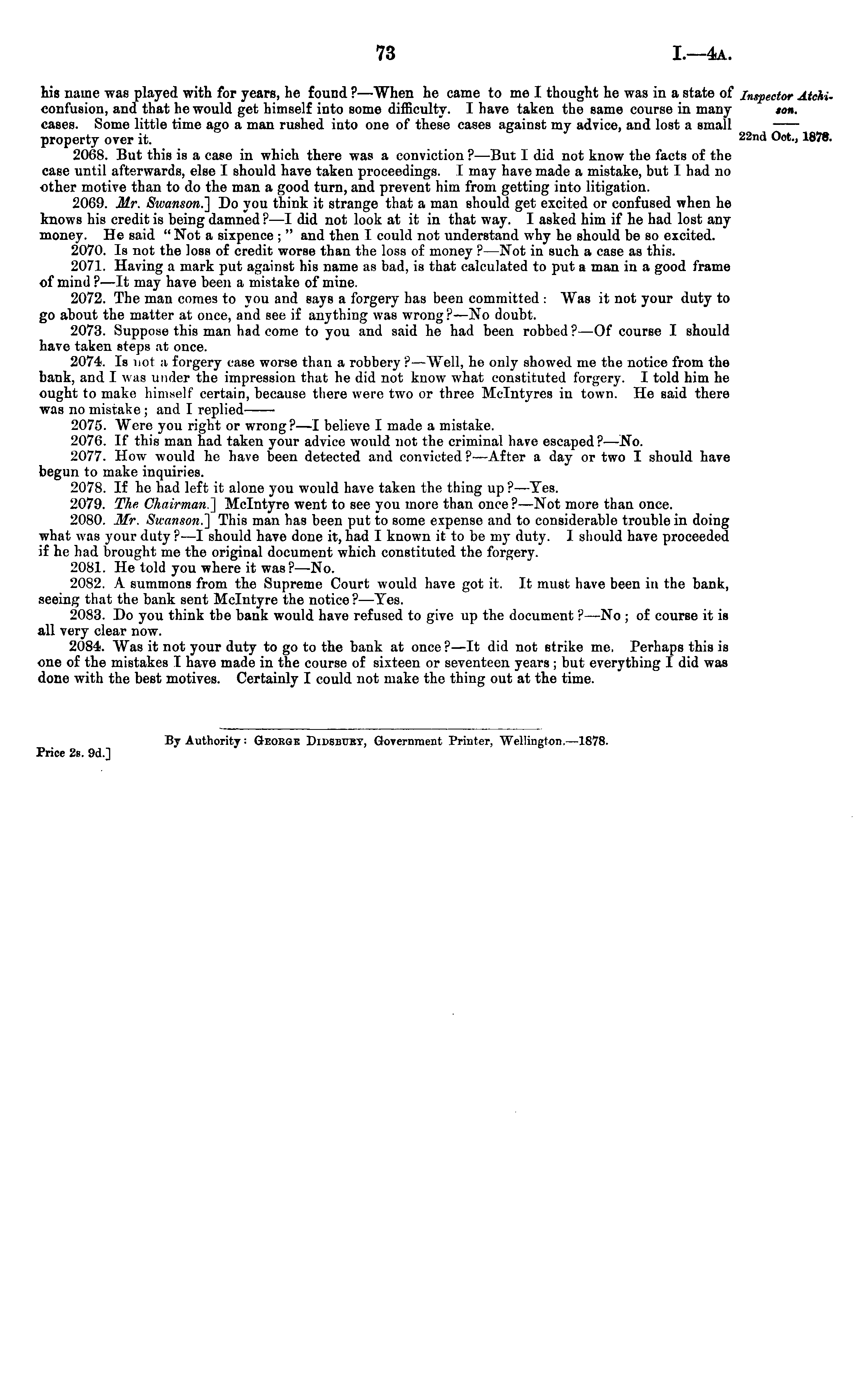 his name was played with for years, he found ? —When he came to me I thought he was in a state of confusion, and that he would get himself into some difficulty. I have taken the same course in many cases. Some little time ago a man rushed into one of these cases against my advice, and lost a small property over it. 2068. But this is a case in which there was a conviction ? —But I did not know the facts of the case until afterwards, else I should have taken proceedings. I may have made a mistake, but I had no other motive than to do the man a good turn, and prevent him from getting into litigation. 2069. Mr. Swanson] Do you think it strange that a man should get excited or confused when he knows his credit is being damned ? —I did not look at it in that way. I asked him if he had lost any money. He said " Not a sixpence ; " and then I could not understand why he should be so excited. 2070. Is not the loss of credit worse than the loss of money ? —Not in such a case as this. 2071. Having a mark put against his name as bad, is that calculated to put a man in a good frame of mind ?—lt may have been a mistake of mine. 2072. The man comes to you and says a forgery has been committed : AVas it not your duty to go about the matter at once, and see if anything was wrong?—No doubt. 2073. Suppose this man had come to you and said he had been robbed ?—Of course I should have taken steps at once. 2074. Is rrot a forgery case worse than a robbery ? —Well, he only showed me the notice from the bank, and I was under the impression that he did not know what constituted forgery. I told him he ought to make himself certain, because there were two or three Mclntyres in town. He said there was no mistake ; and I replied 2075. Were you right or wrong?—l believe I made a mistake. 2076. If this man had taken your advice would not the criminal have escaped? —No. 2077. How would he have been detected and convicted ?■ —After a day or two I should have begun to make inquiries. 2078. If he had left it alone you would have taken the thing up ?—Tes. 2079. The Chairman] Mclntyre went to see you more than once?— Not more than once. 2080. Mr. Swanson] This man has been put to some expense and to considerable trouble in doing what was your duty ? —I should have done it, had I known it to be my duty. I should have proceeded if he had brought me the original document which constituted the forgery. 2081. He told you where it was? —No. 2082. A summons from the Supreme Court would have got it. It must have been in the bank, seeing that the bank sent Mclntyre the notice ? —Tes. 2083. Do you think the bank would have refused to give up the document ?—No ; of course it is all very clear now. 2084. AVas it not your duty to go to the bank at once ? —lt did not strike me. Perhaps this is one of the mistakes I have made in the course of sixteen or seventeen years; but everything I did was done with the best motives. Certainly I could not make the thing out at the time.